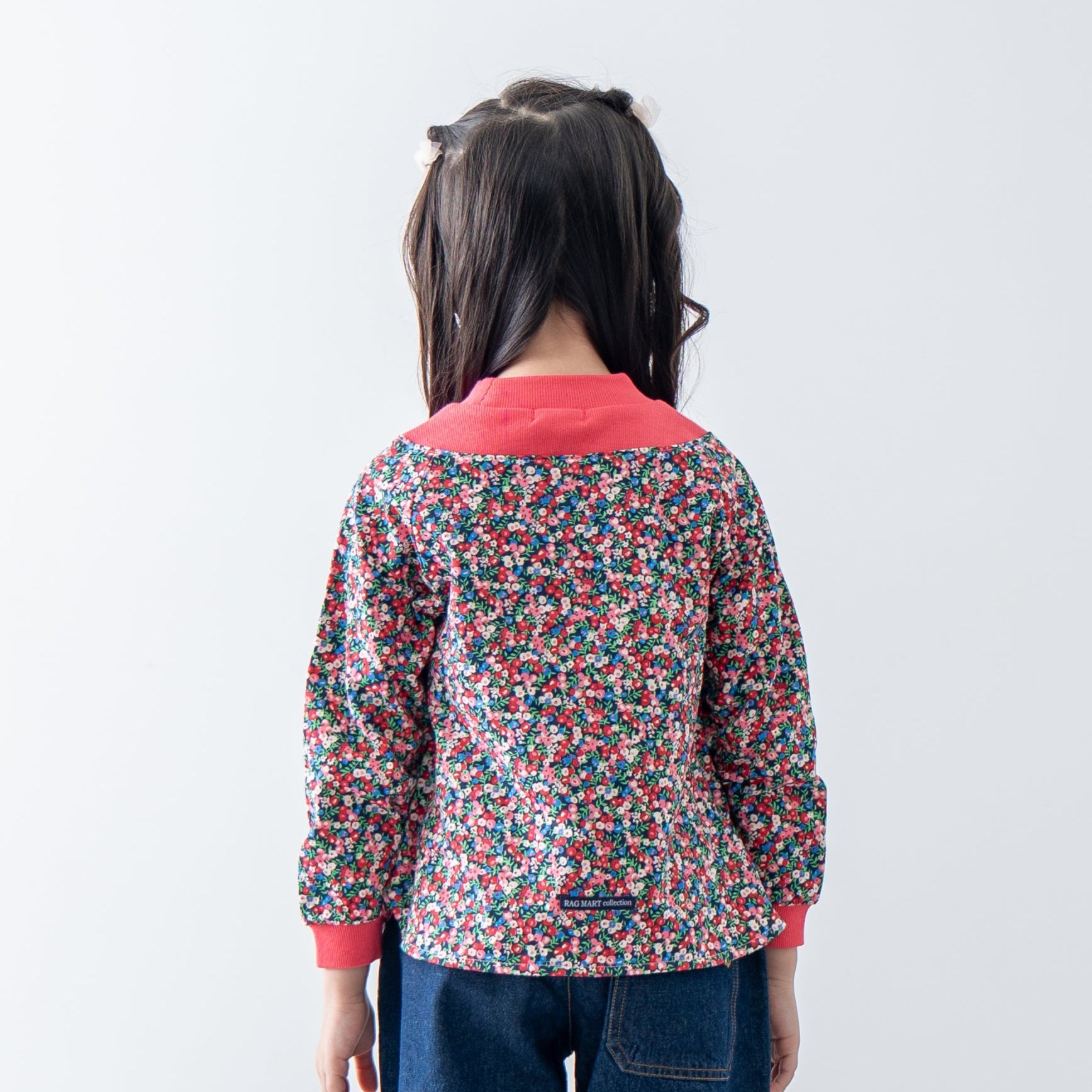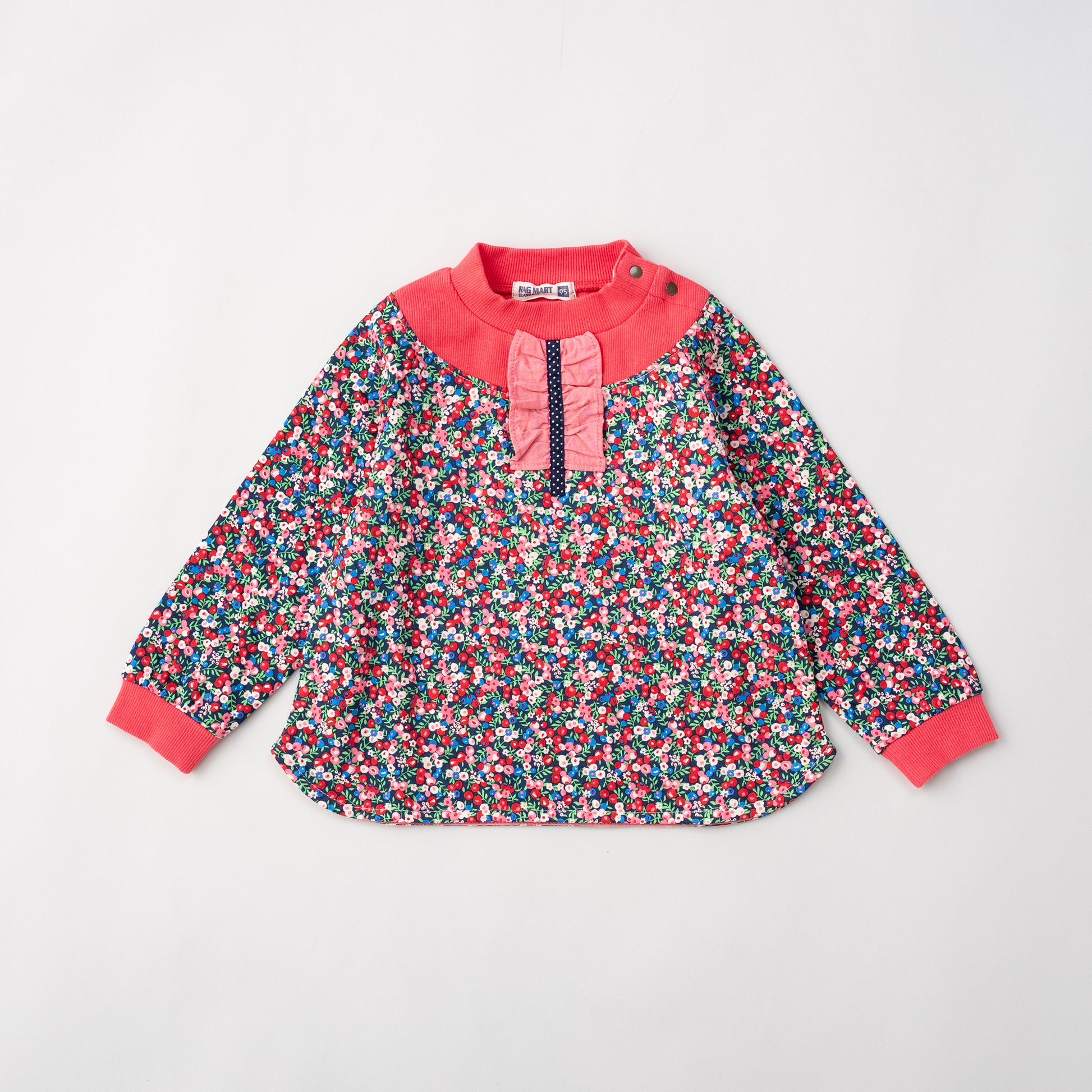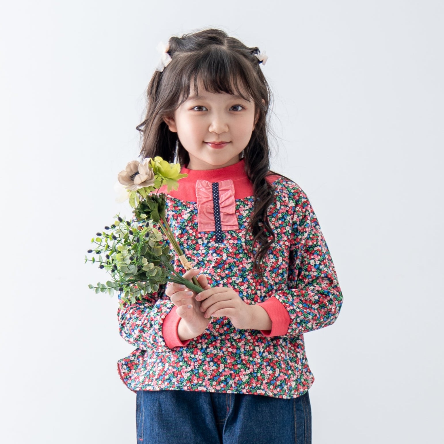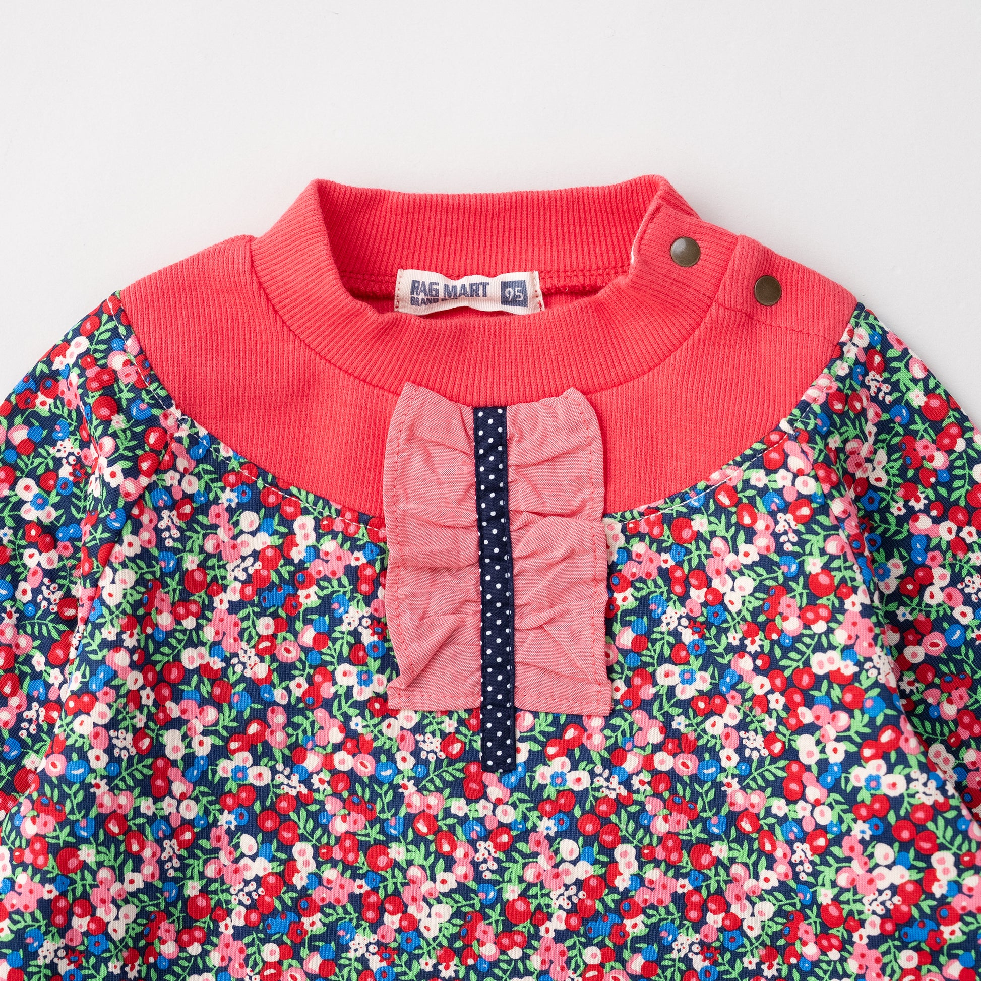 女の子らしい小花の総柄プリントトレーナーは柔らかな着心地。ハイネックのデザインで胸元にはフリルのアクセント。シンプルなボトムを合わせるだけでコーデがキマる総柄デザイントレーナーはデイリーにもお出かけにも大活躍します。