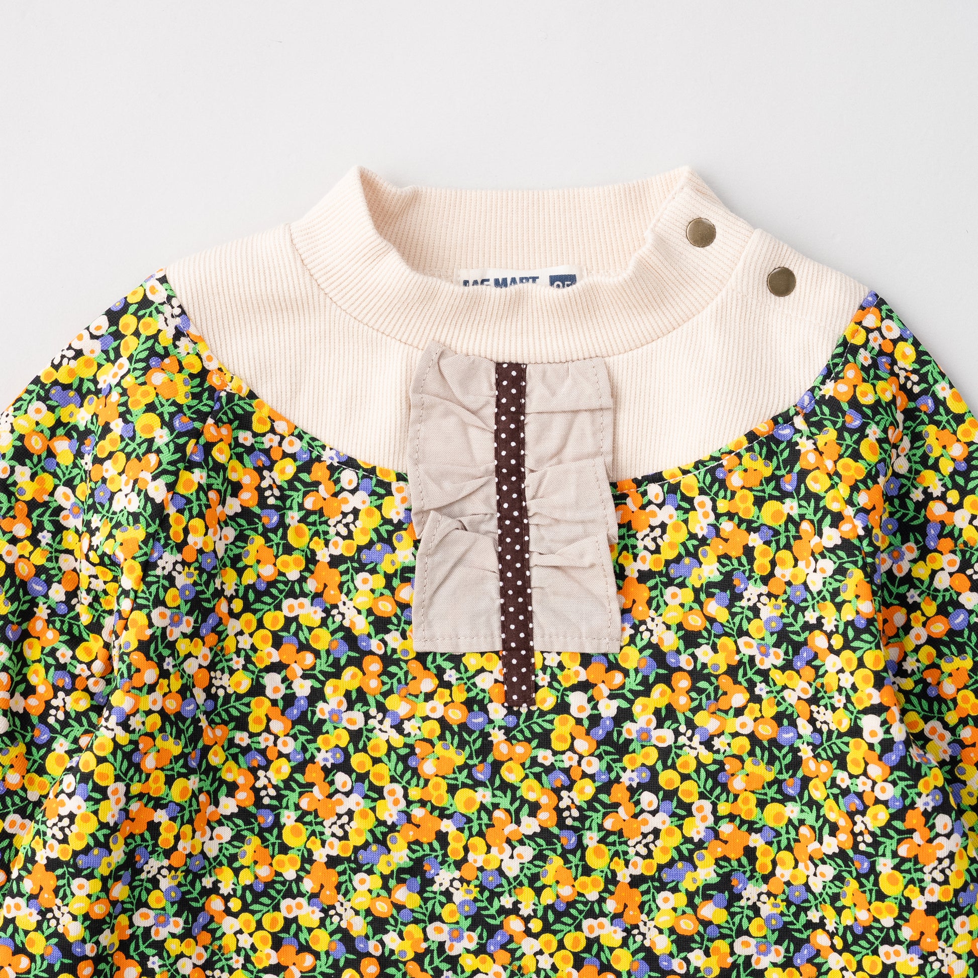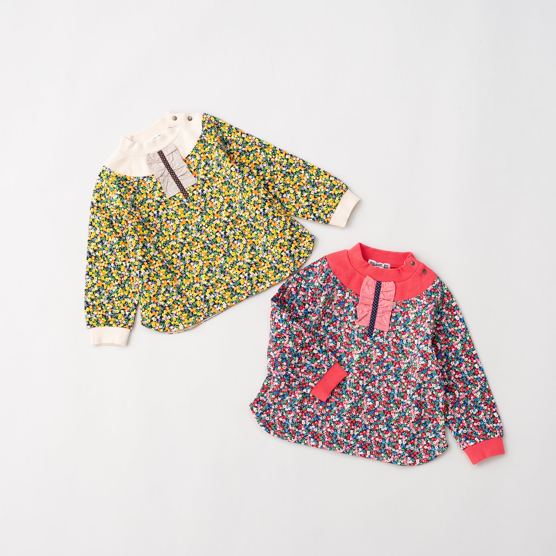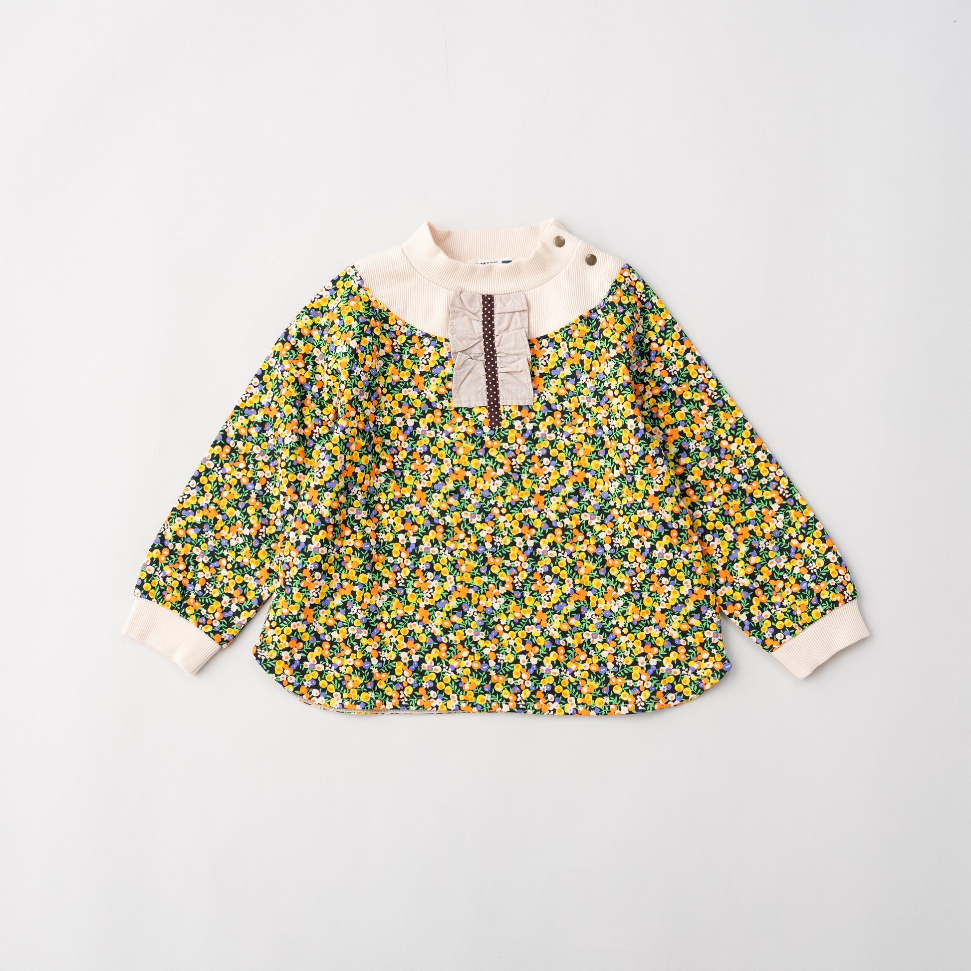 女の子らしい小花の総柄プリントトレーナーは柔らかな着心地。ハイネックのデザインで胸元にはフリルのアクセント。シンプルなボトムを合わせるだけでコーデがキマる総柄デザイントレーナーはデイリーにもお出かけにも大活躍します。