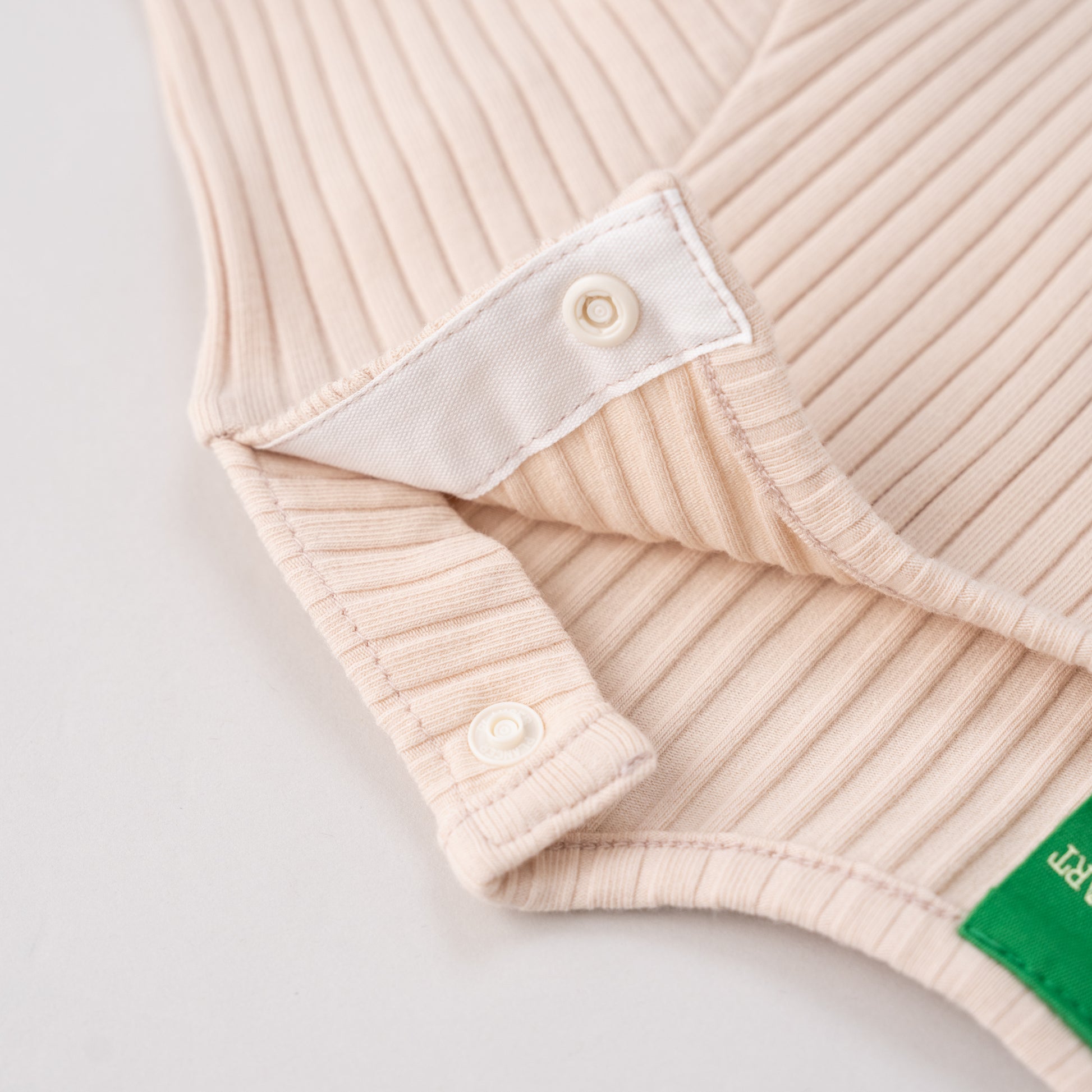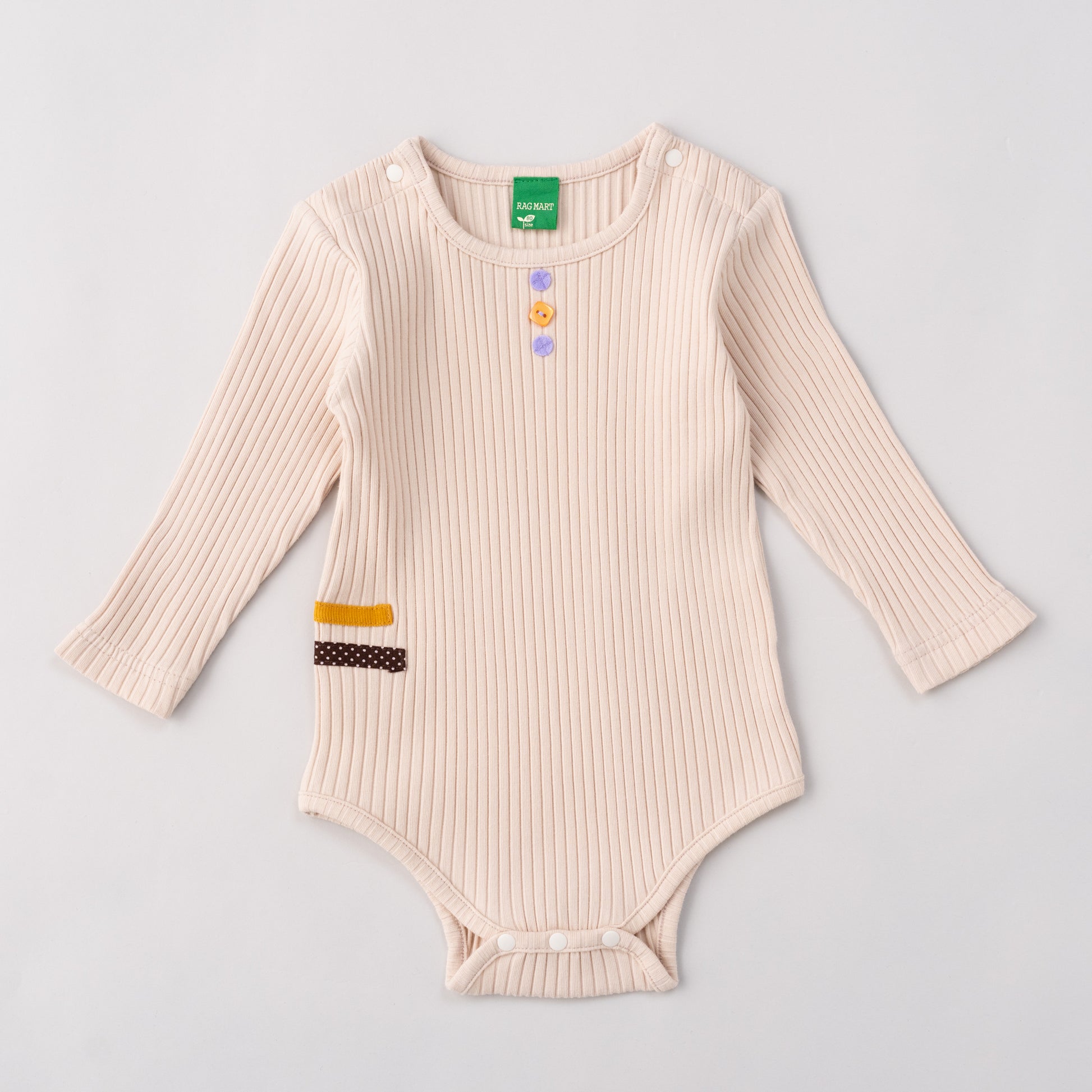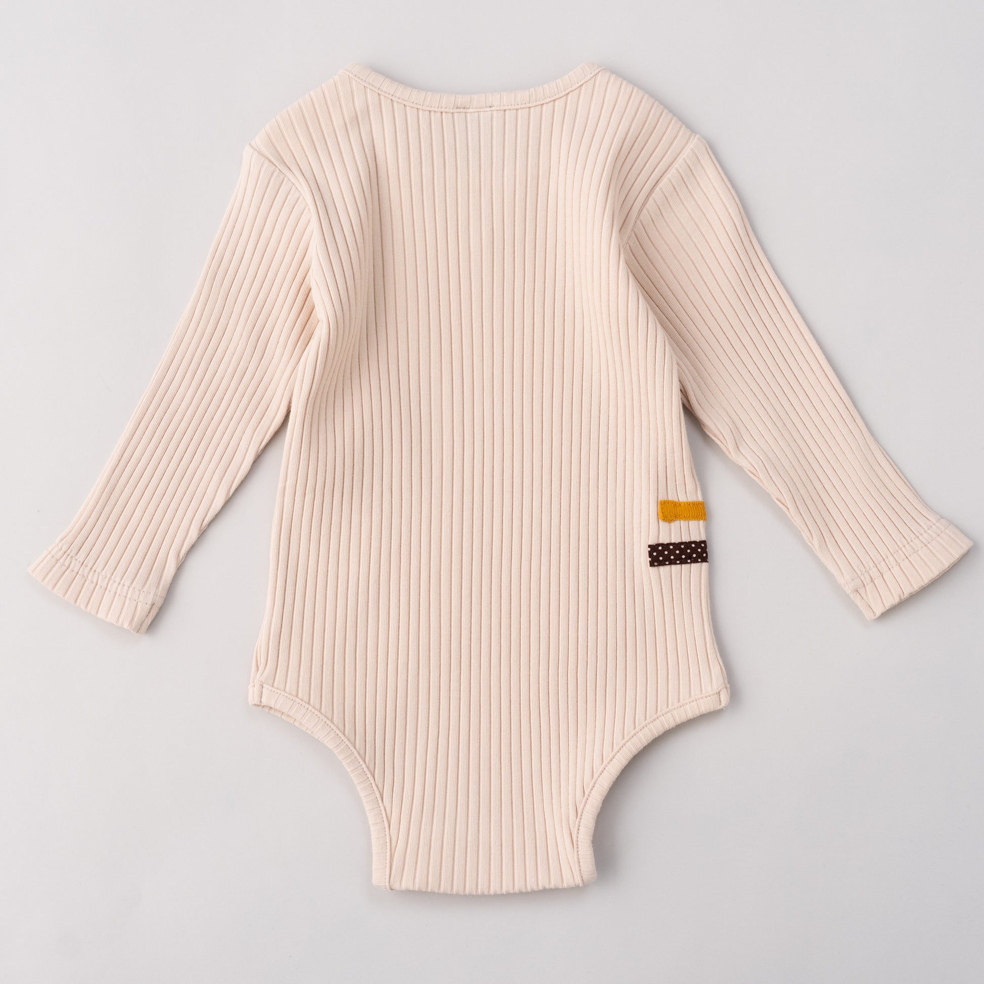 伸縮性のあるテレコ素材のボディスーツ。秋らしいカラーにフェルトやボタンがアクセントになったデザイン。おなかが出ないインナーとしてパンツやオーバーオールのインナーにオススメです。伸縮自在で赤ちゃんの動きをストレスなく受け止めます。