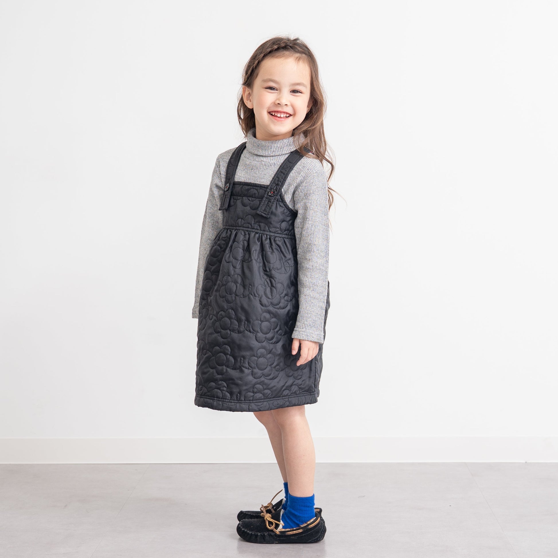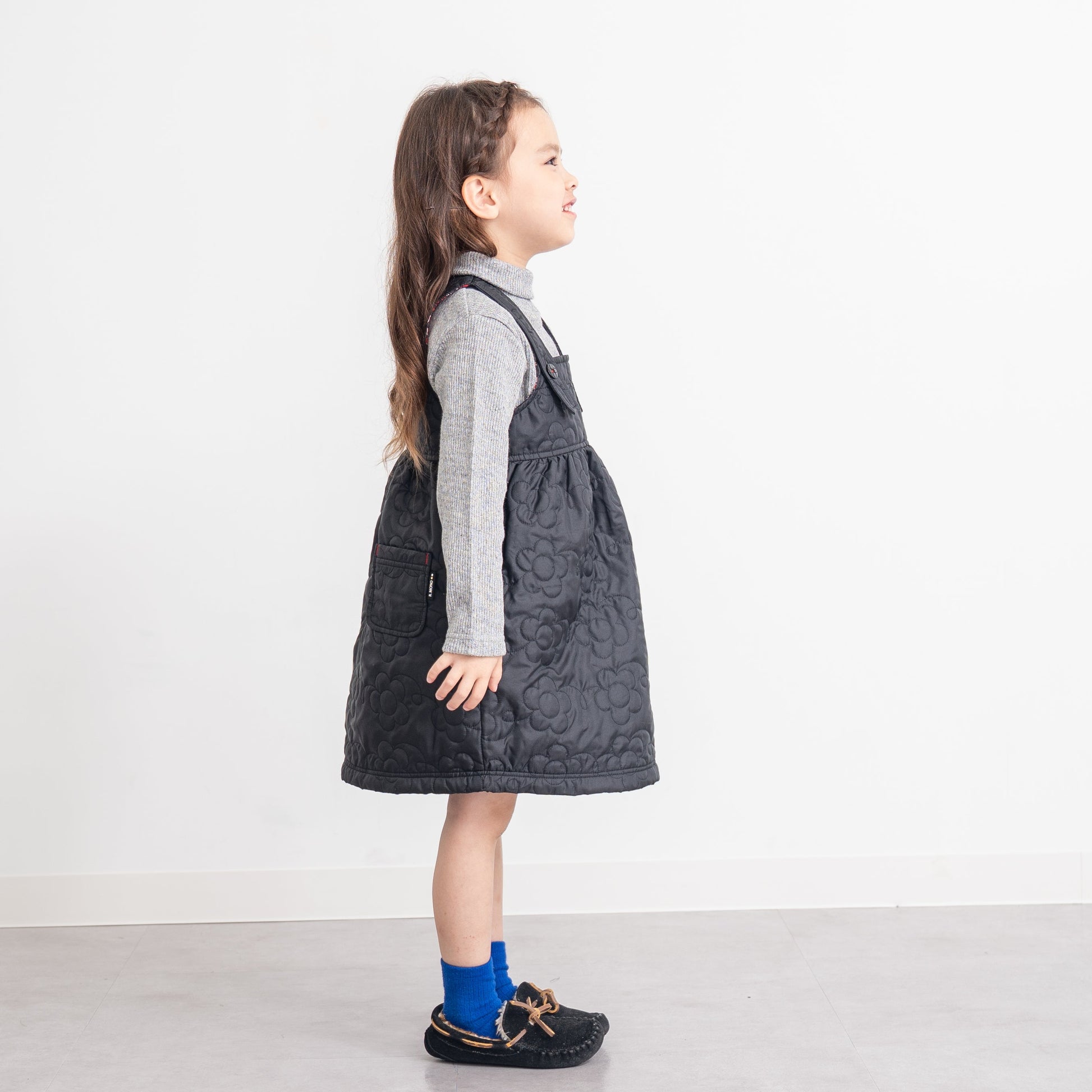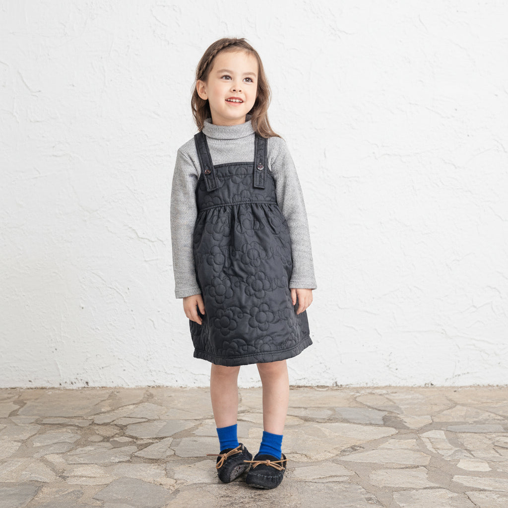 大人っぽい印象のナイロンキルトワンピースは、ウエスト周りから広がるふんわりとしたフォルムがおしゃれな一枚です。インナーやレギンスの色合わせで印象の変化を楽しんでいただけます。プチフォーマルにもお使いいただけます。