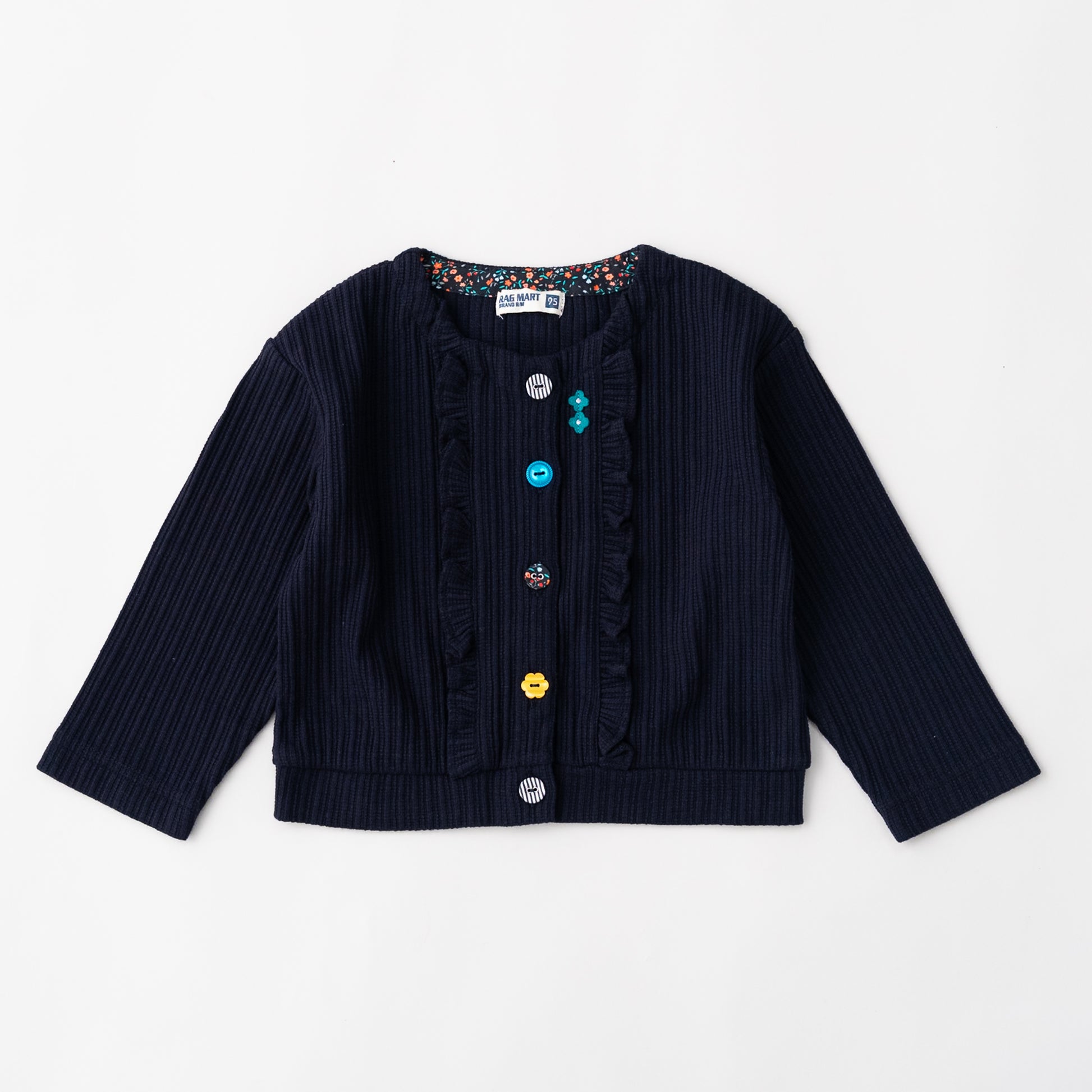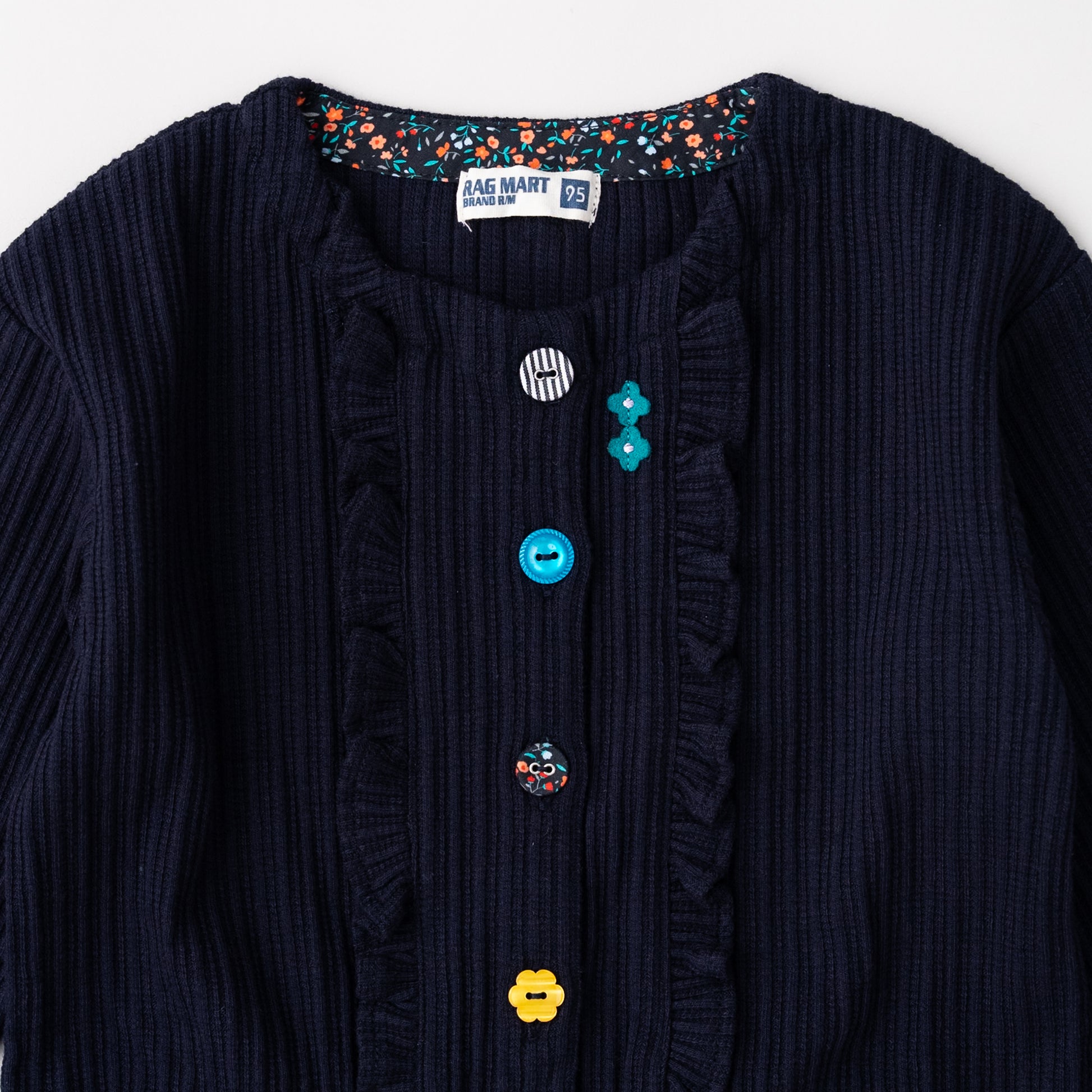 表面感のあるニット素材を使用したカーディガン。遊び心のあるラグマートらしい配色のボタンがアクセントになったデザインです。カーディガンは季節の変わり目にもうれしいアイテム。