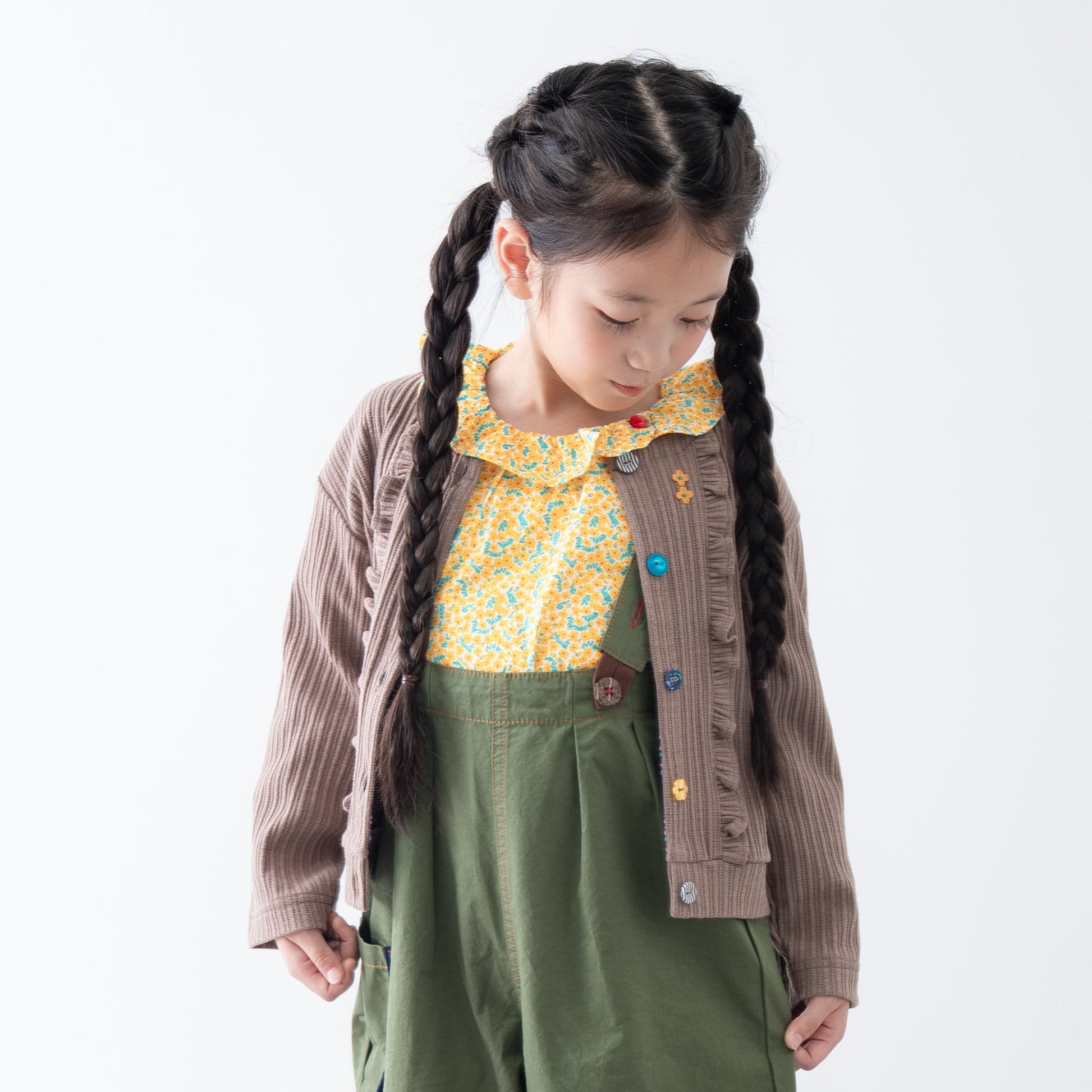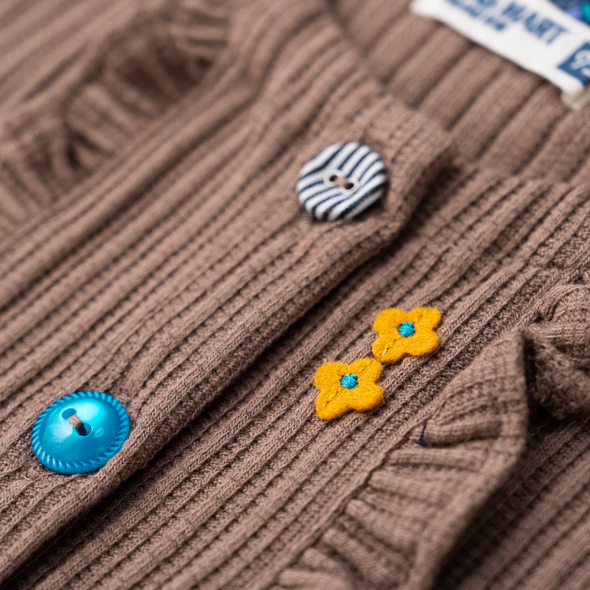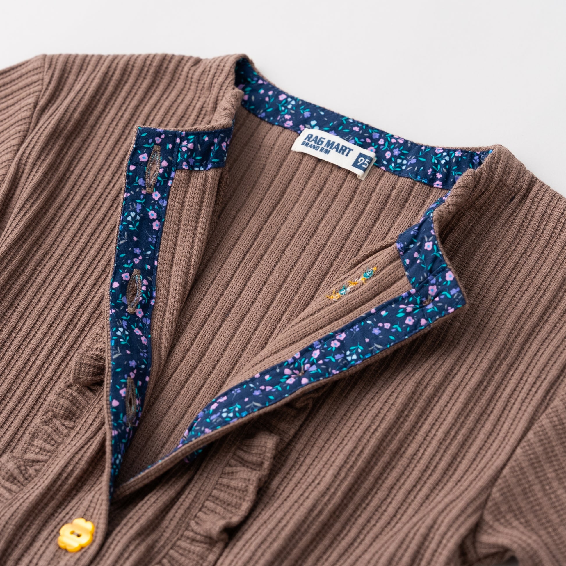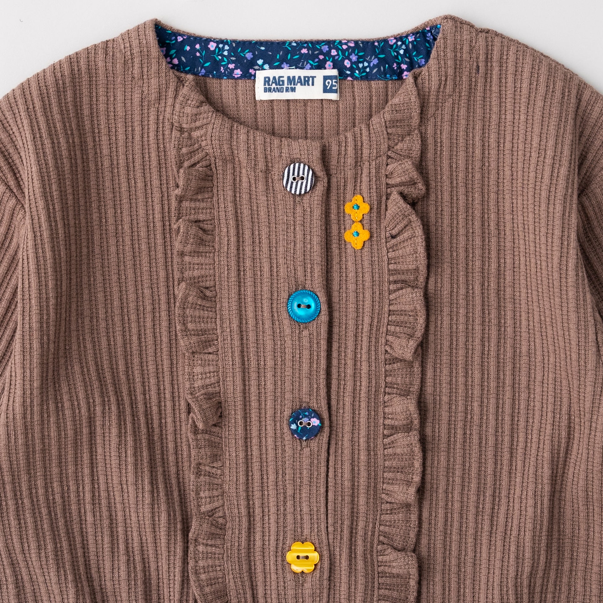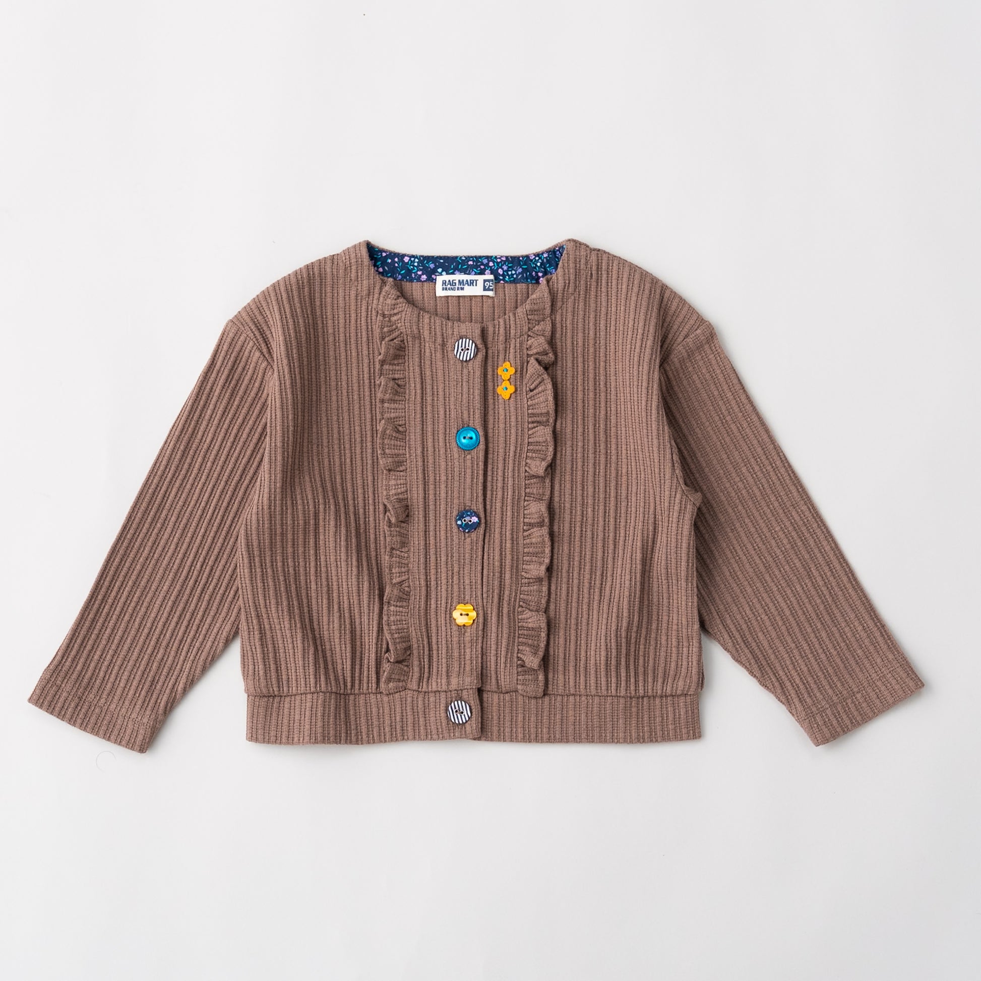 表面感のあるニット素材を使用したカーディガン。遊び心のあるラグマートらしい配色のボタンがアクセントになったデザインです。カーディガンは季節の変わり目にもうれしいアイテム。