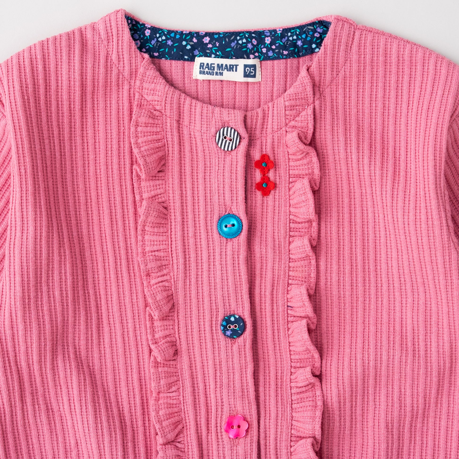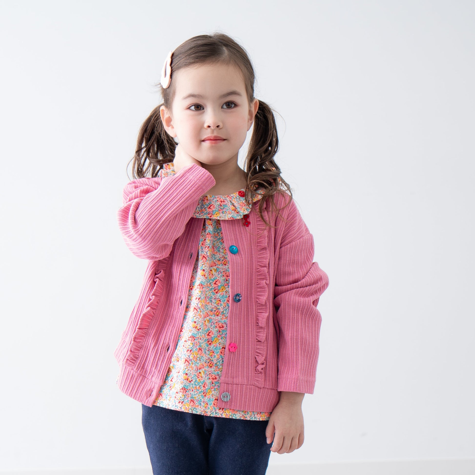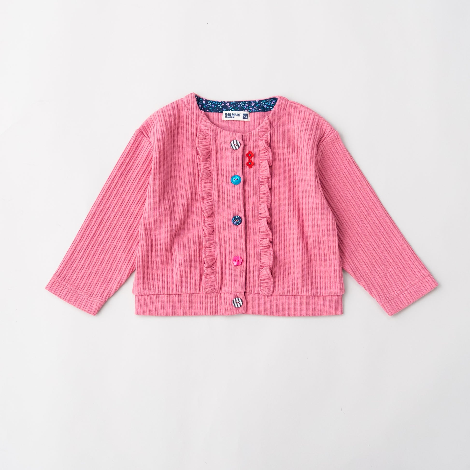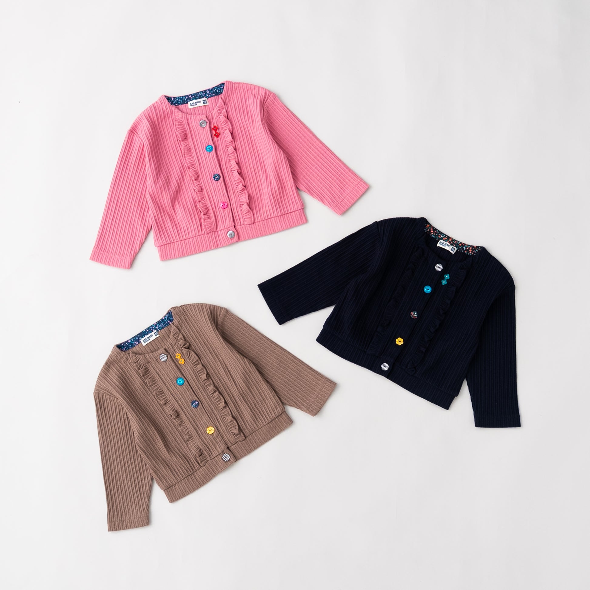 表面感のあるニット素材を使用したカーディガン。遊び心のあるラグマートらしい配色のボタンがアクセントになったデザインです。カーディガンは季節の変わり目にもうれしいアイテム。