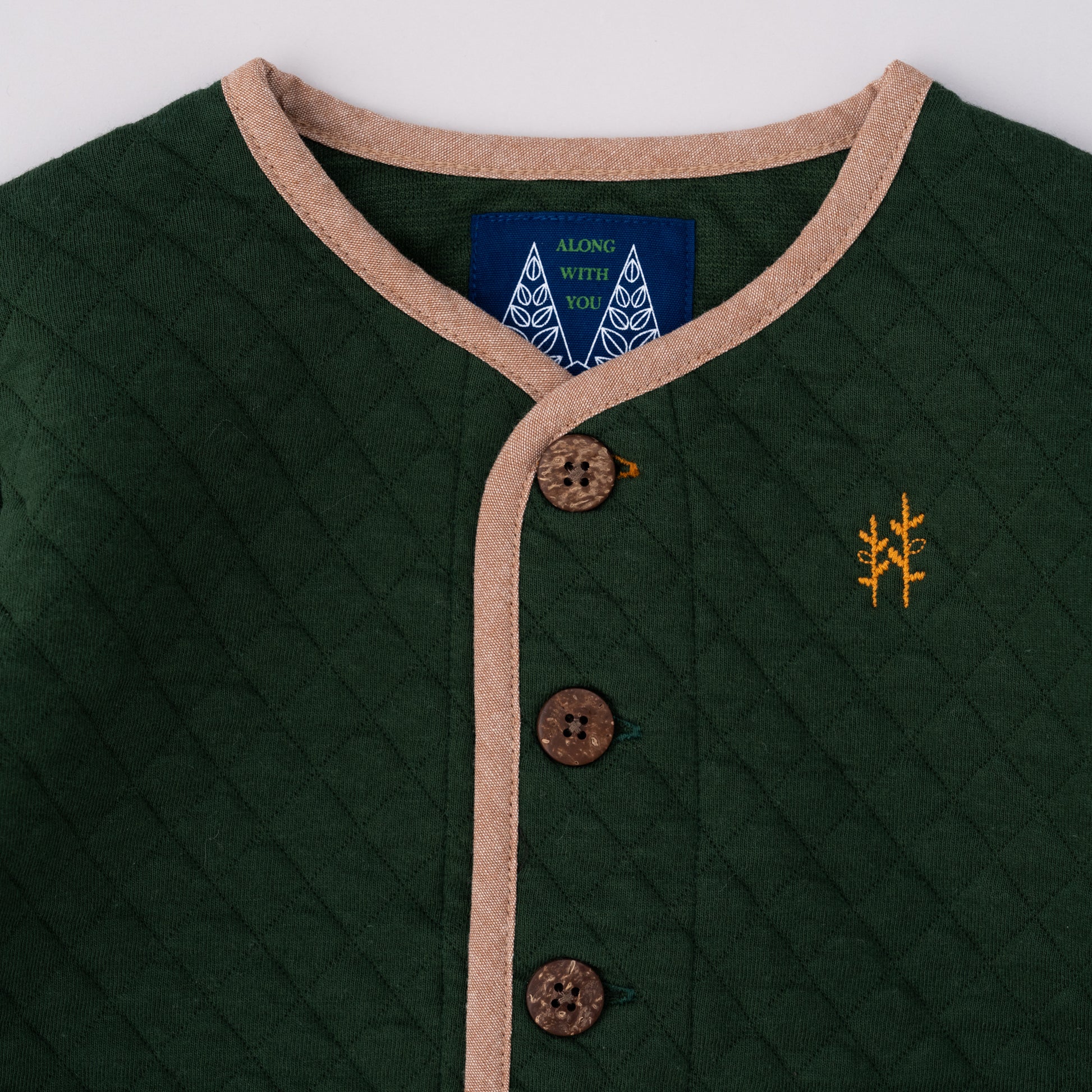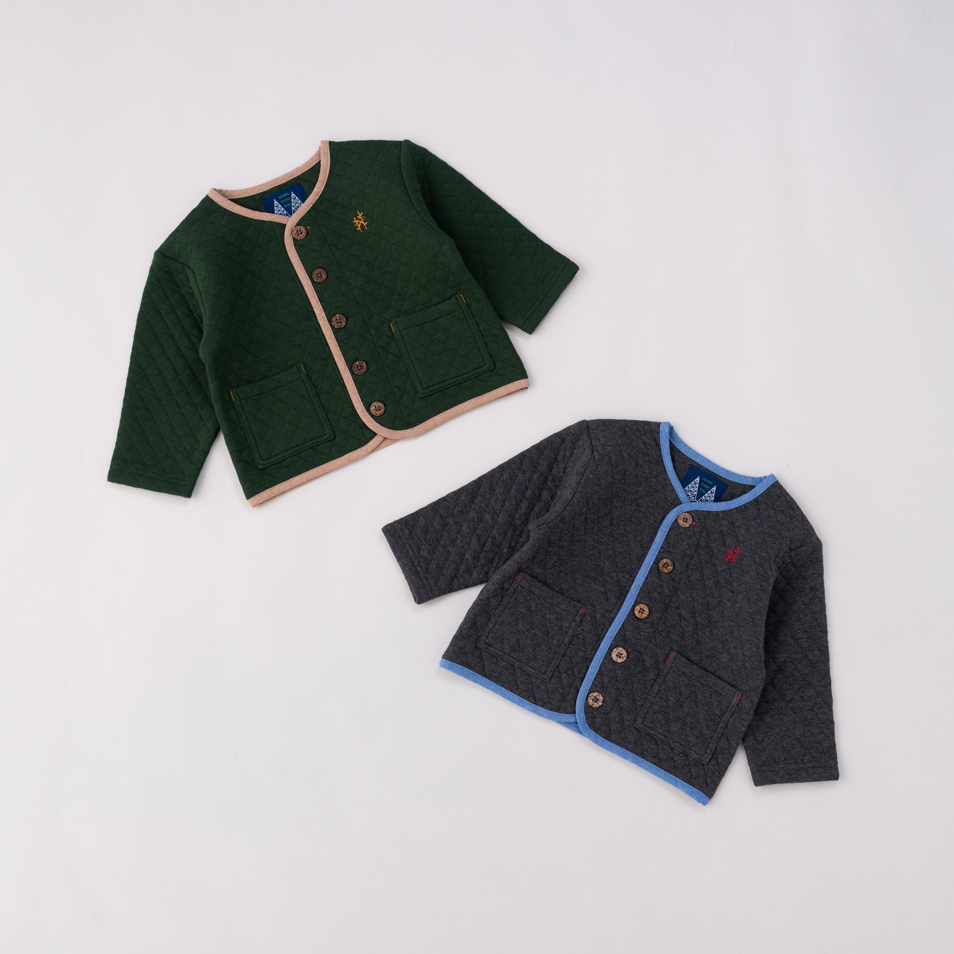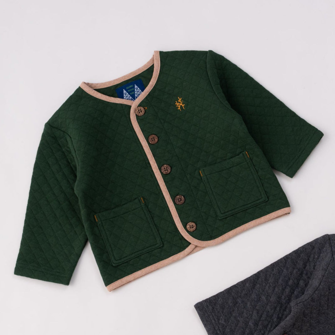 男女ユニセックスでお使いいただけるカーデジャケットは、秋冬らしい素材感のニットキルトを使用。秋カラーのカーディガンは1枚あるとコーディネートの幅も広がり、秋冬のレイヤードスタイルをより一層楽しめます。兄弟姉妹のペアコーデにもオススメです。