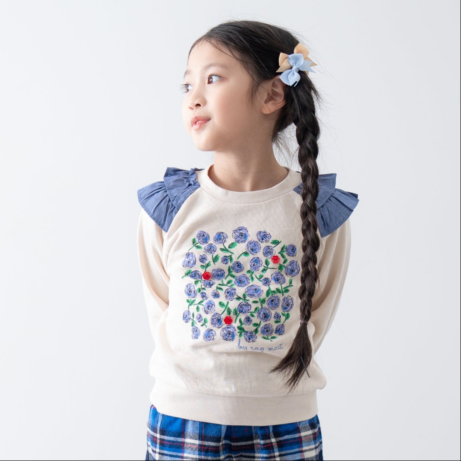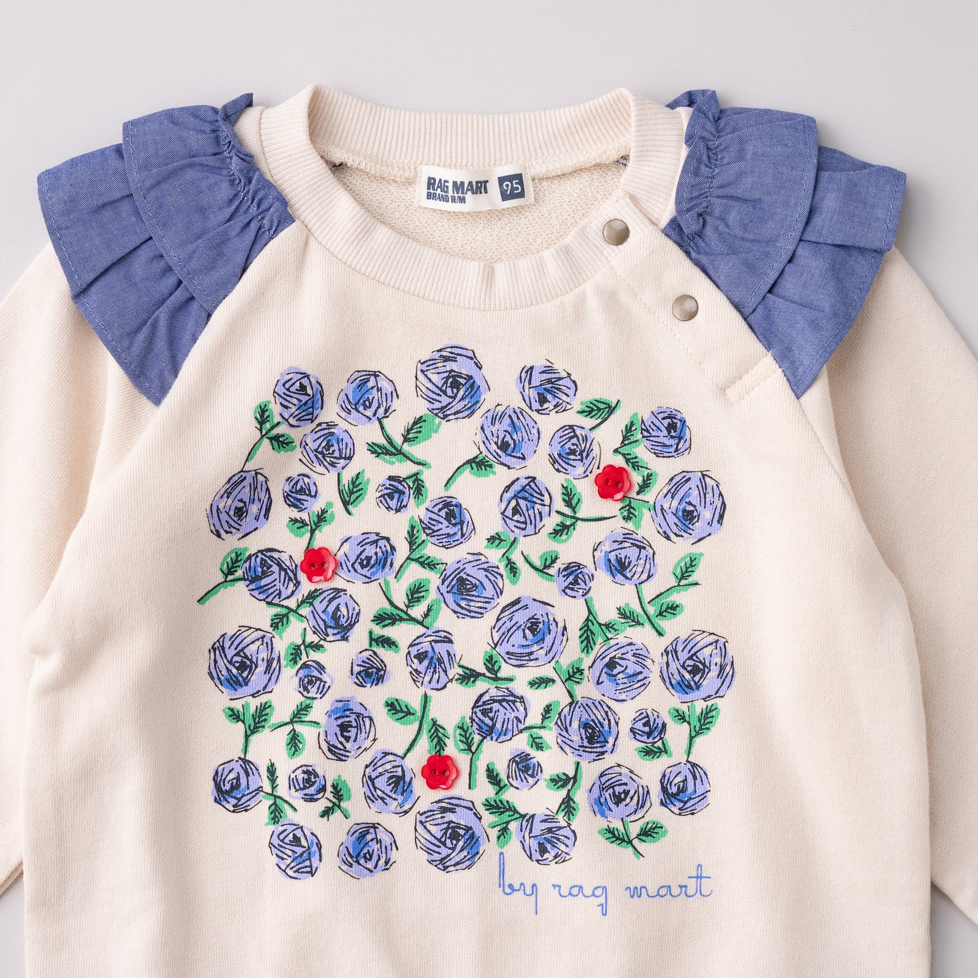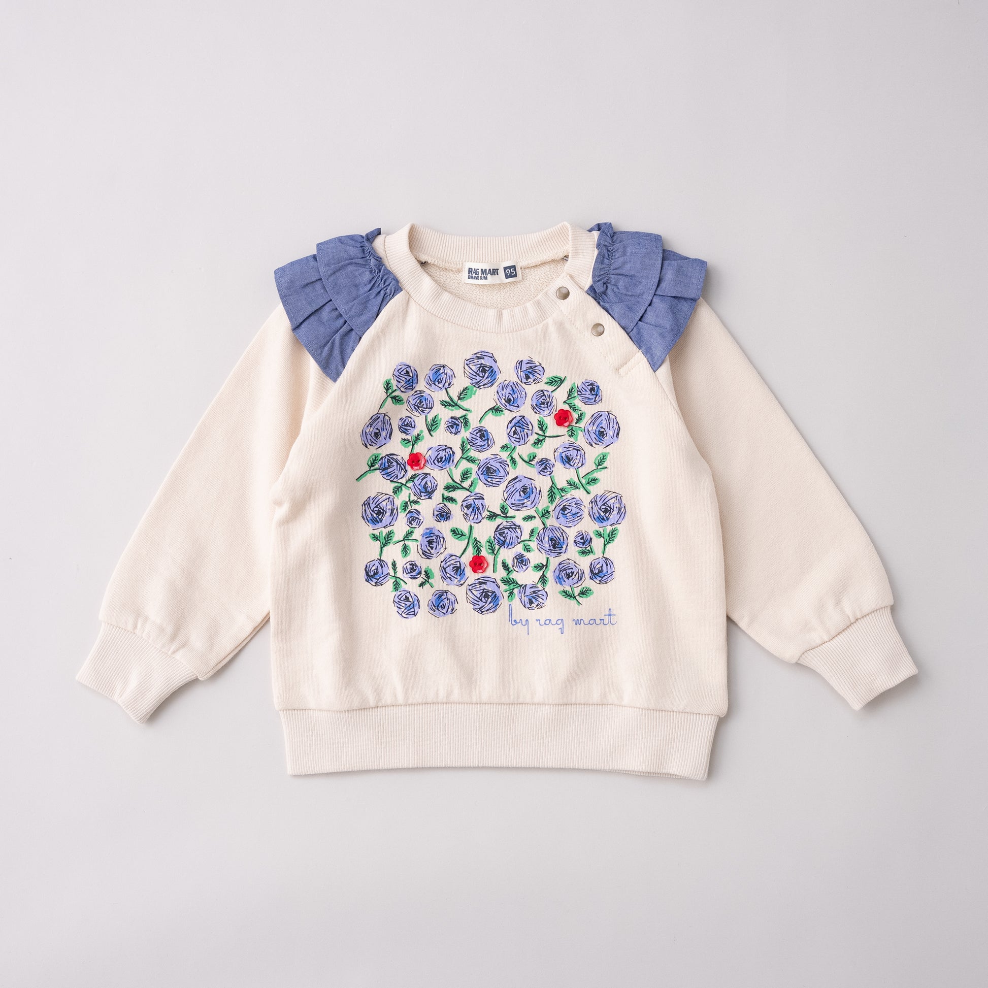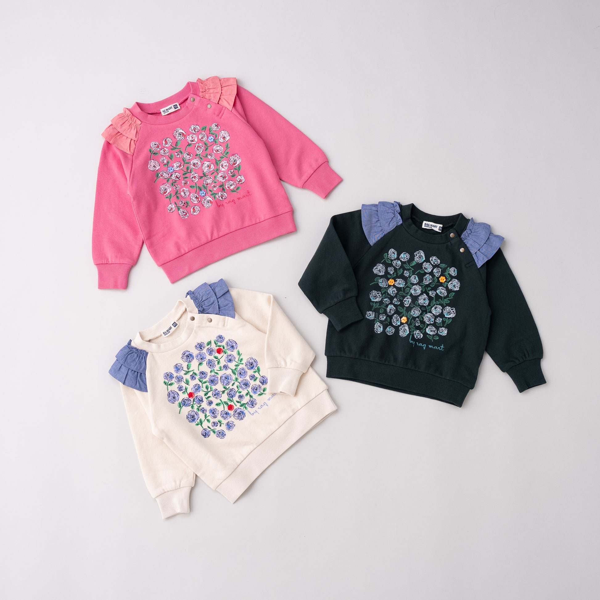 リバイバルデザインのフラワーモチーフが印象的な裏毛素材のトレーナー。肩口のフリルもアクセントになっています。シンプルなボトムやスカートとも相性抜群で、重ね着しやすい生地厚なので秋から春まで重宝します。