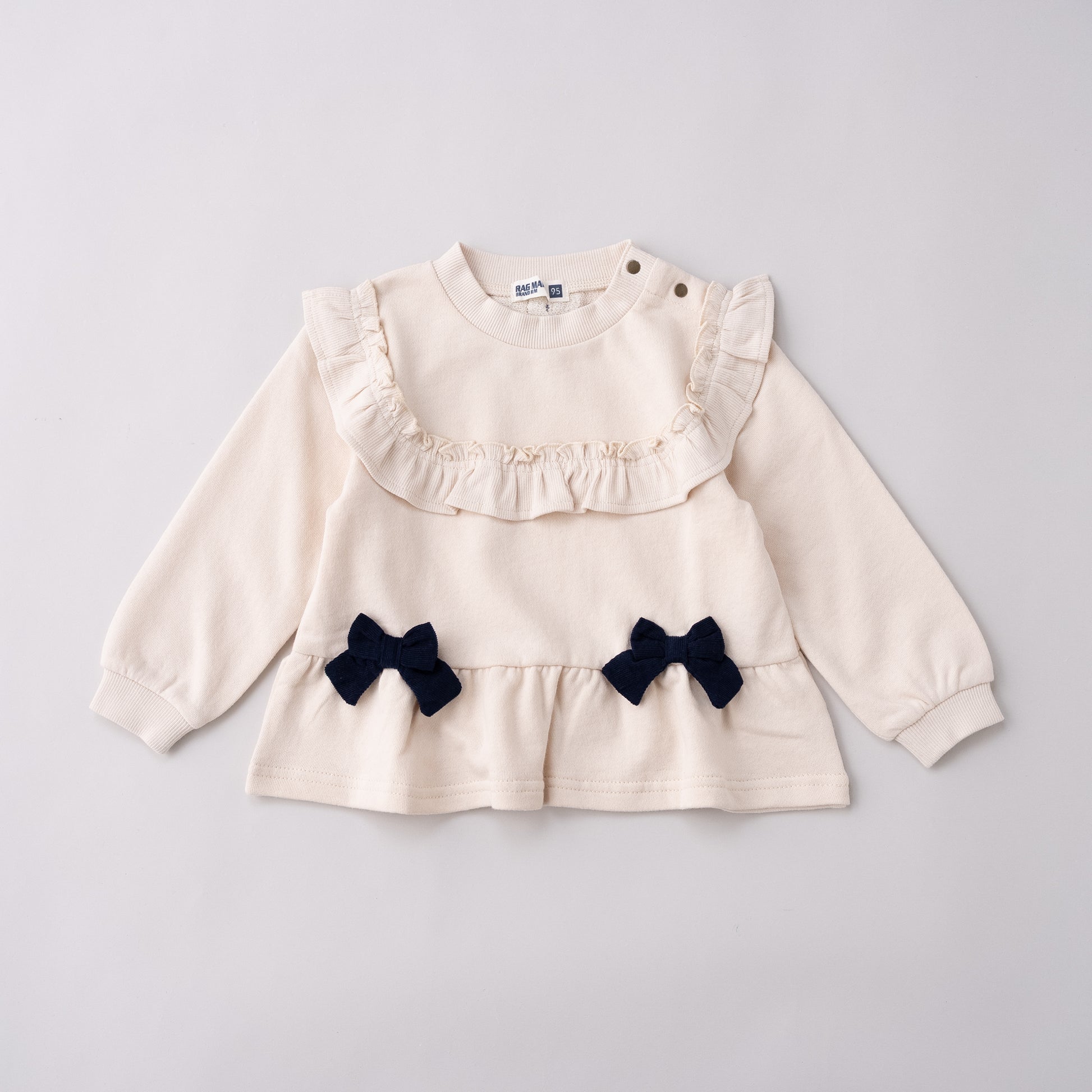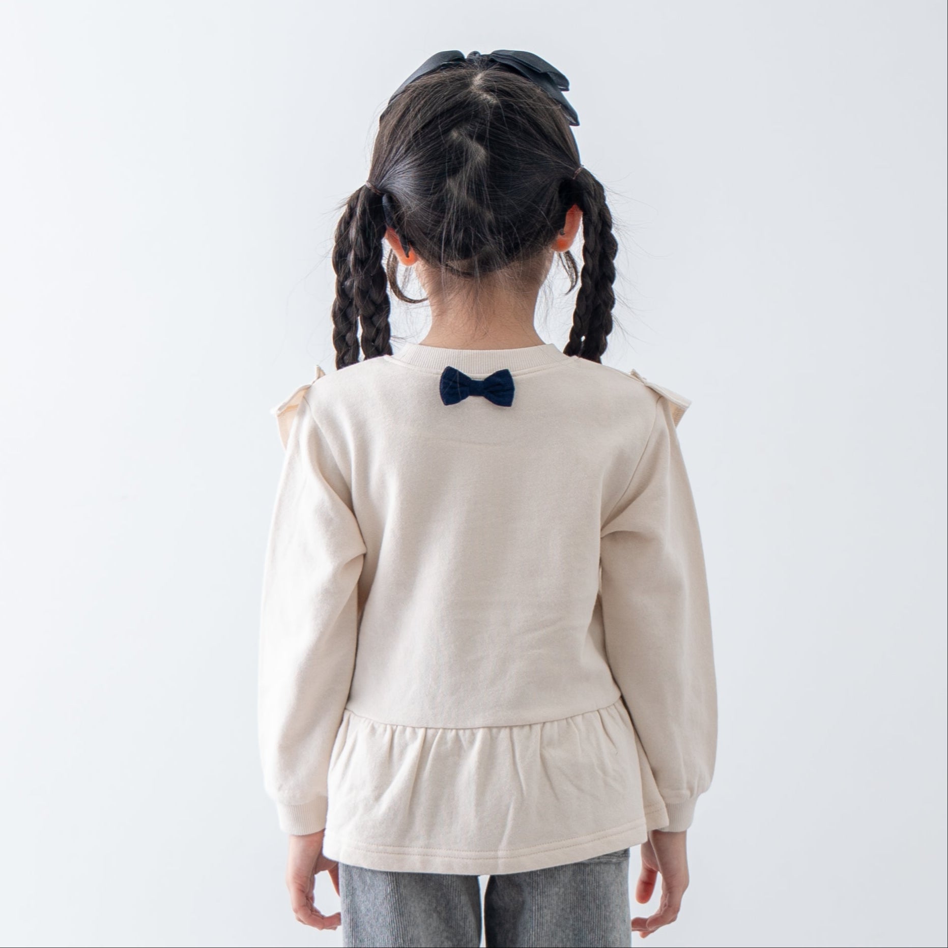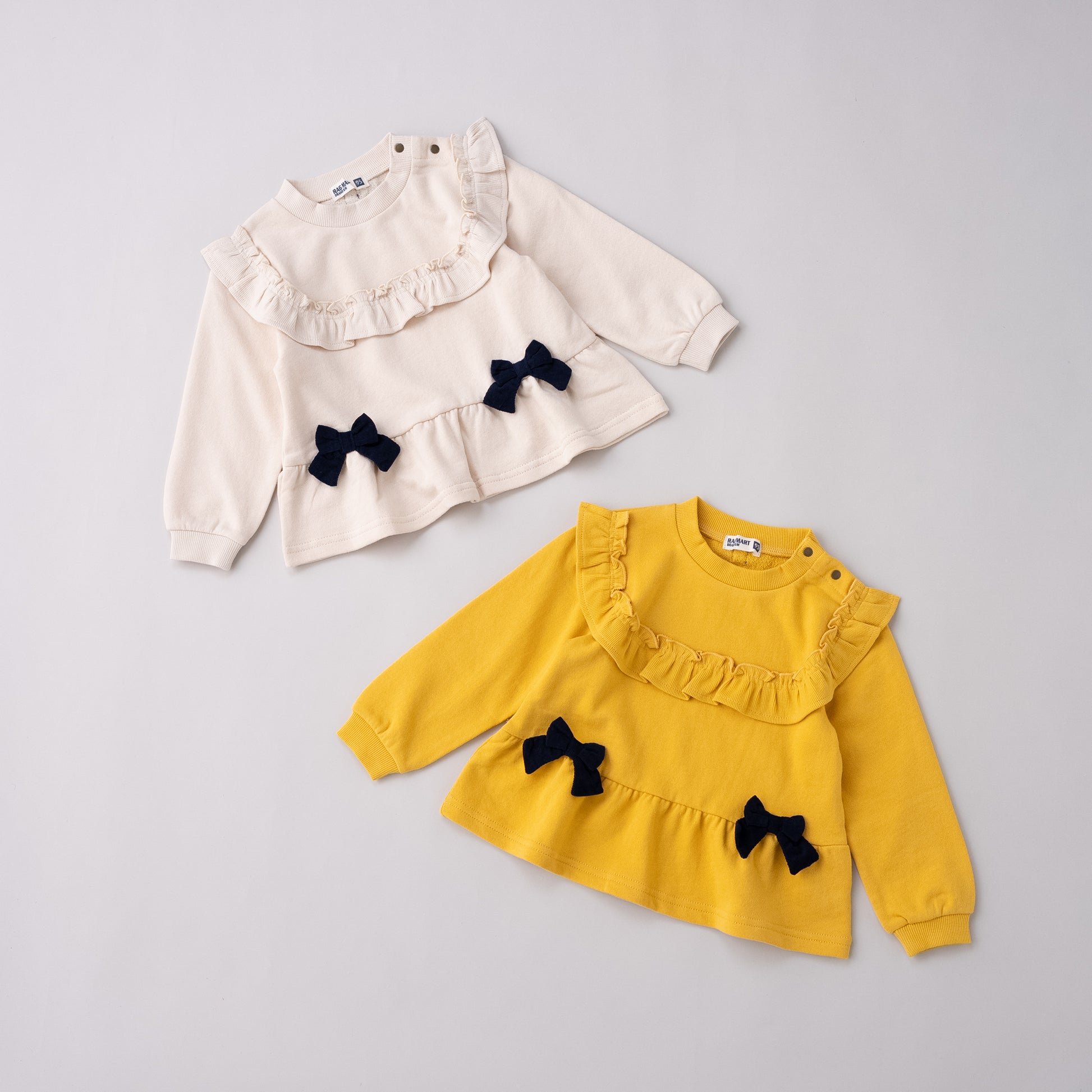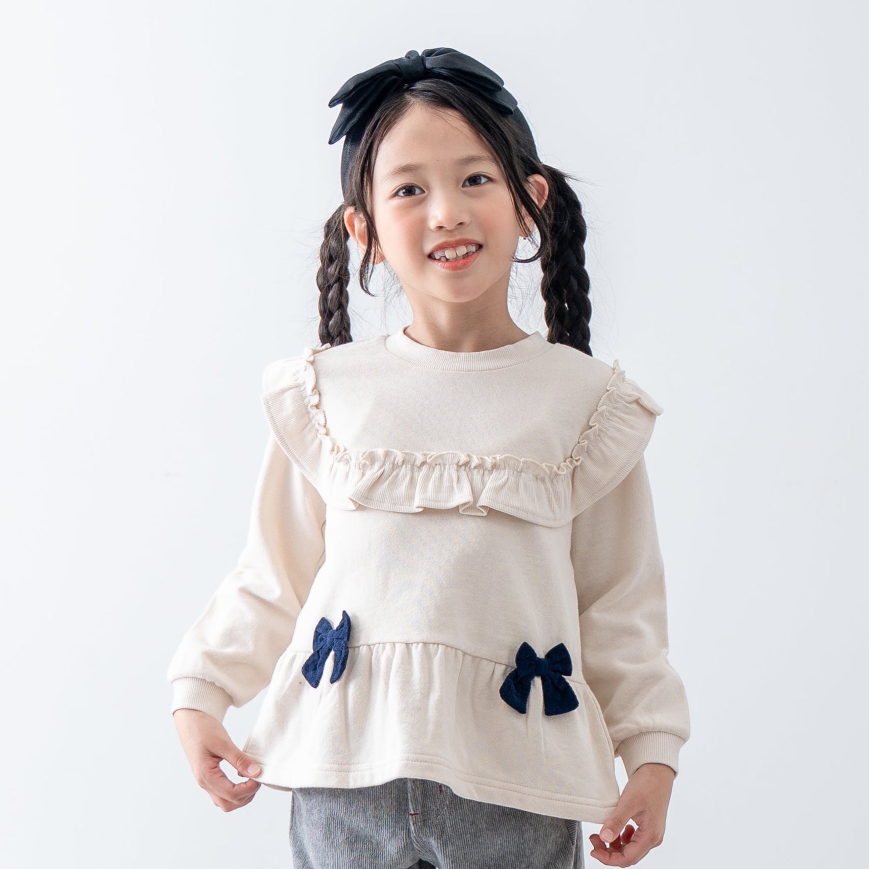 胸元のフリルと腹部のリボンが甘さたっぷりな裏毛素材のトレーナー。ボトムはボーイッシュな印象のものと合わせた甘×辛コーデがオススメです。コーデにひとつ、ポシェットやヘアバンドなどの小物をプラスして遊んでもおしゃれに着こなせます。