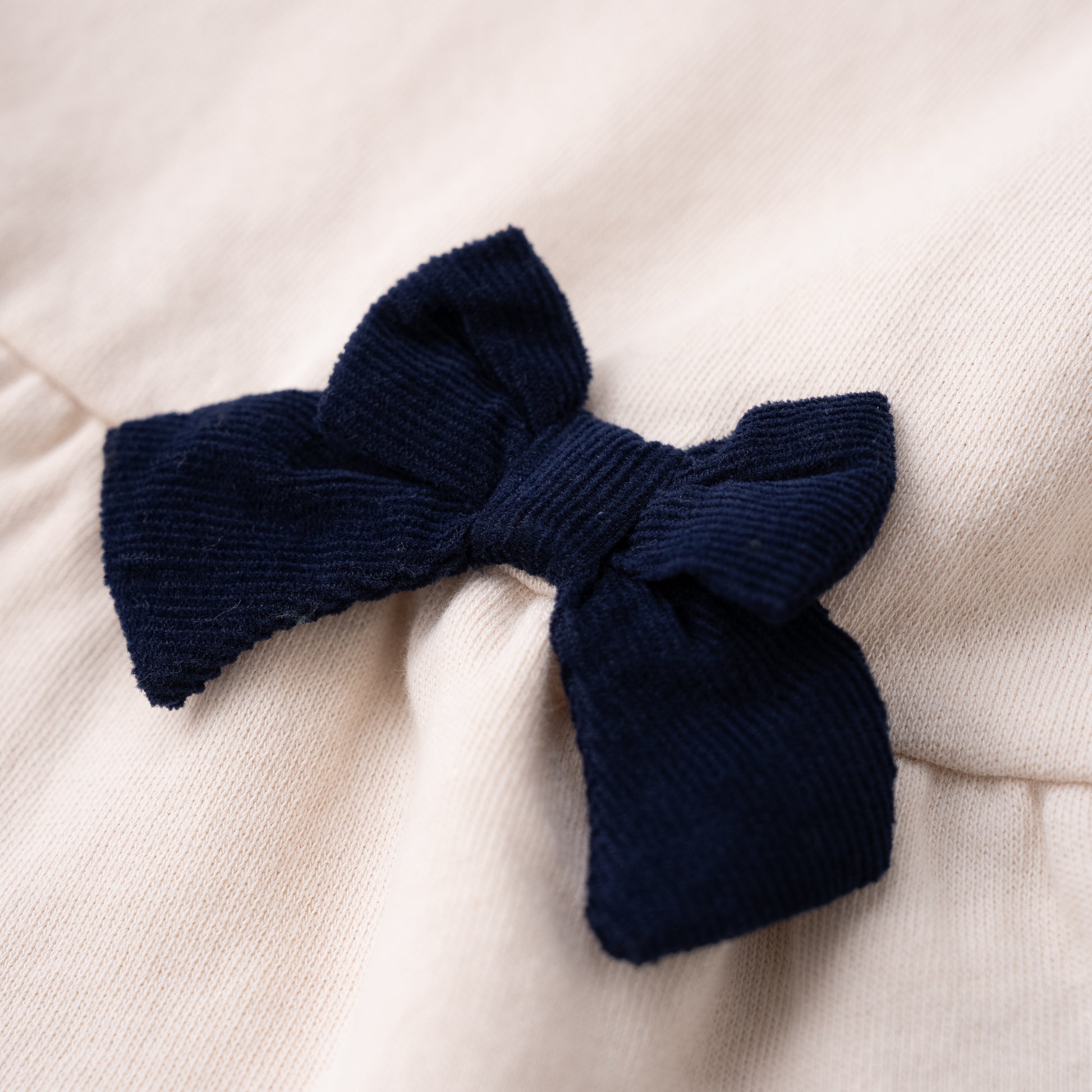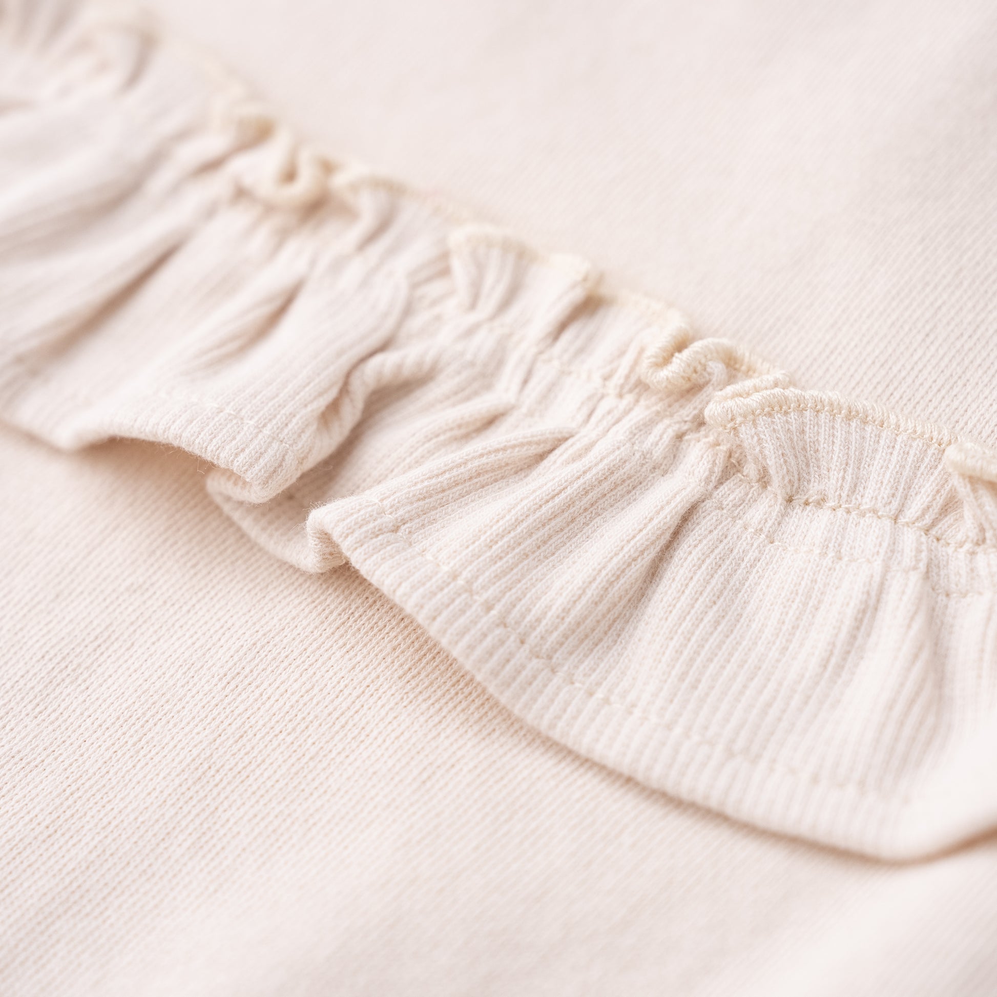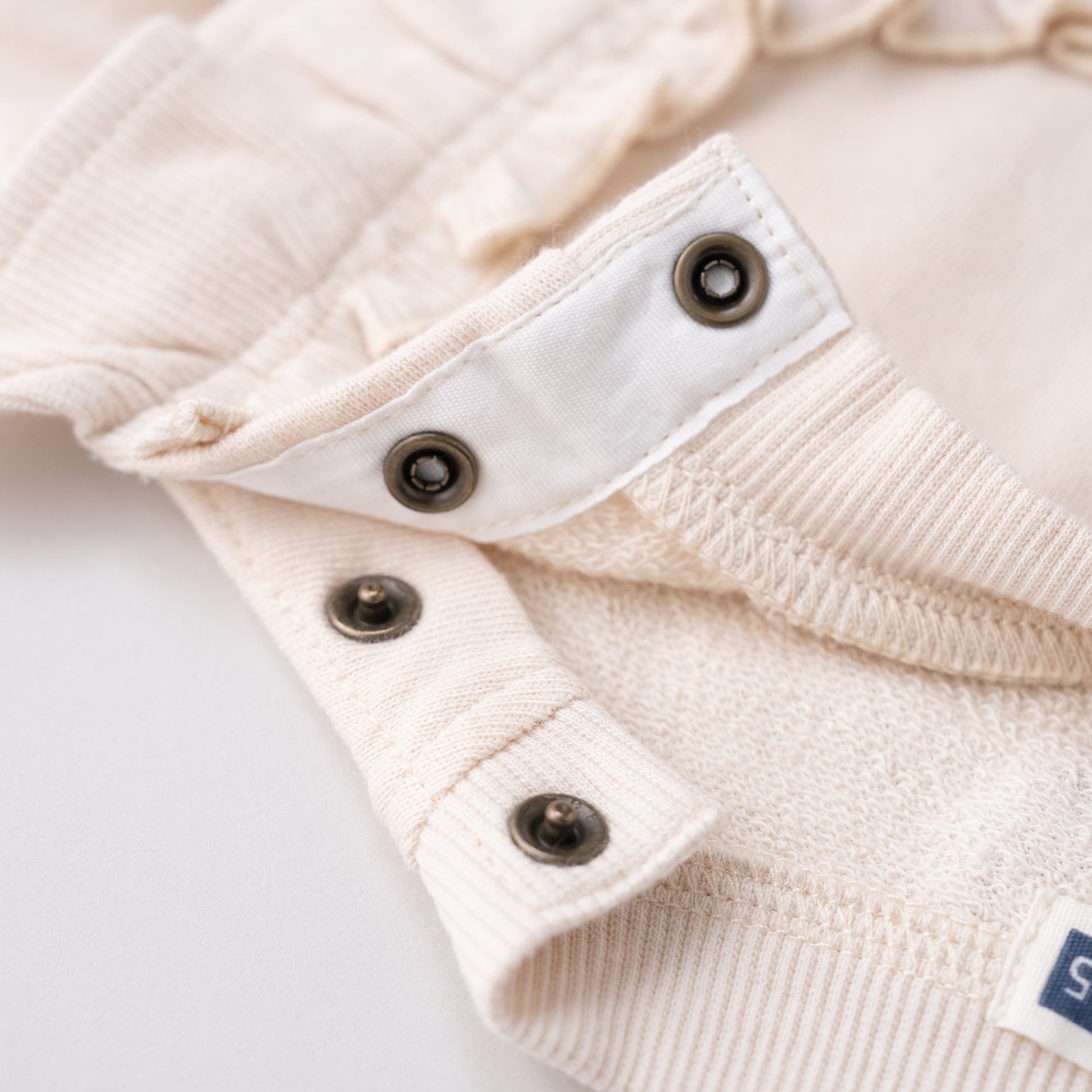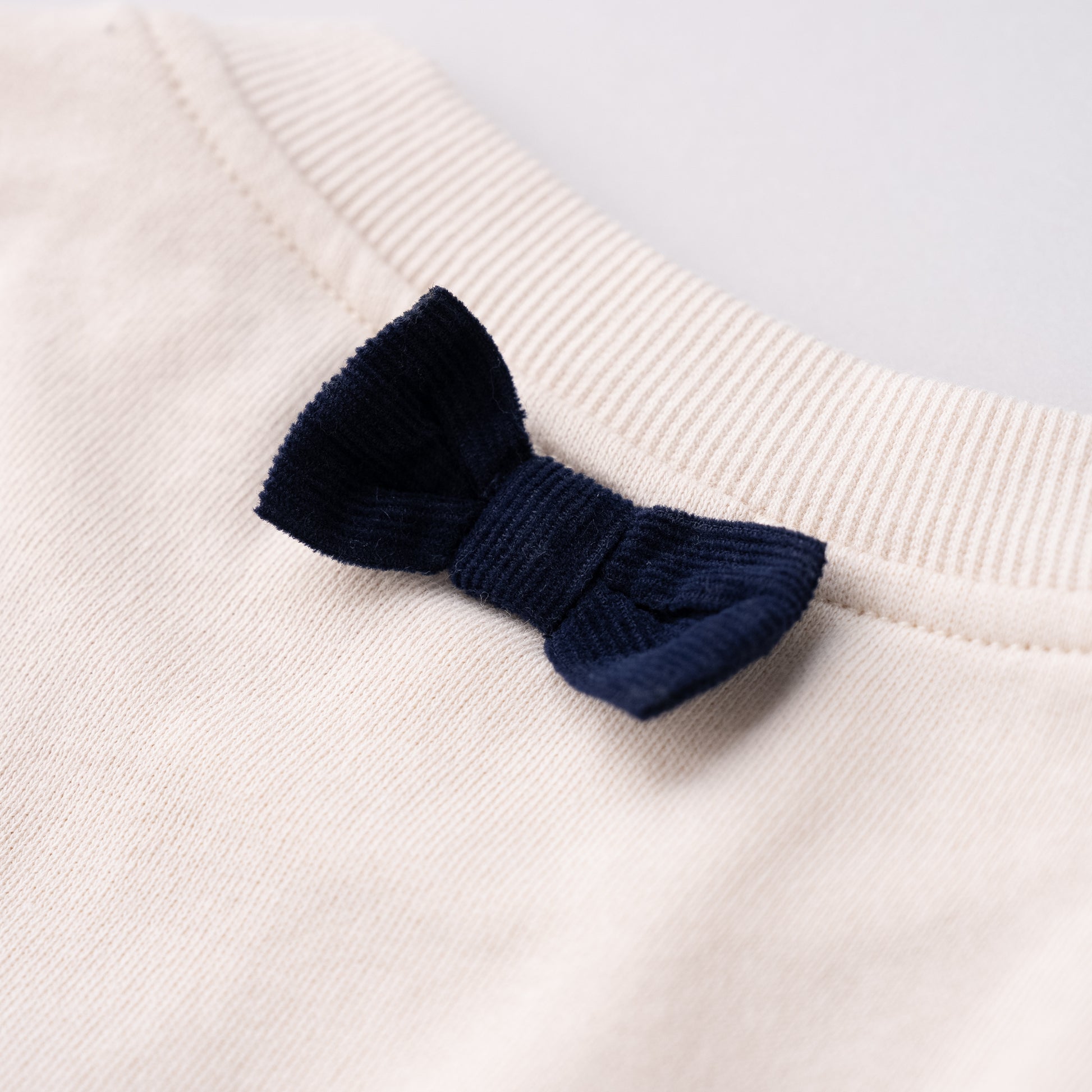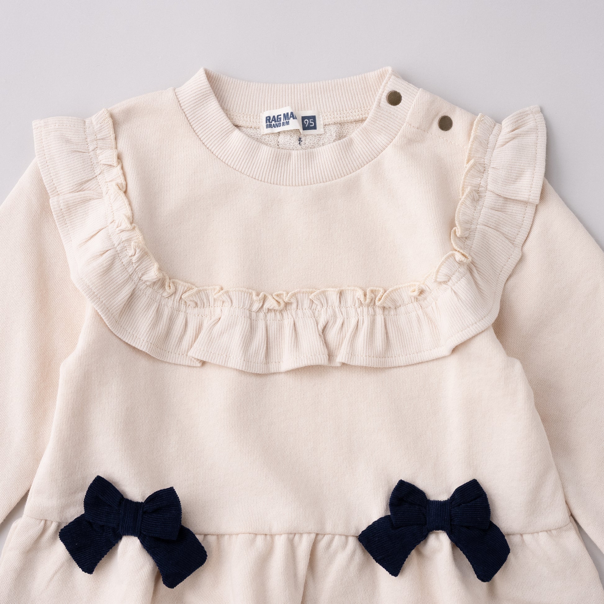 胸元のフリルと腹部のリボンが甘さたっぷりな裏毛素材のトレーナー。ボトムはボーイッシュな印象のものと合わせた甘×辛コーデがオススメです。コーデにひとつ、ポシェットやヘアバンドなどの小物をプラスして遊んでもおしゃれに着こなせます。
