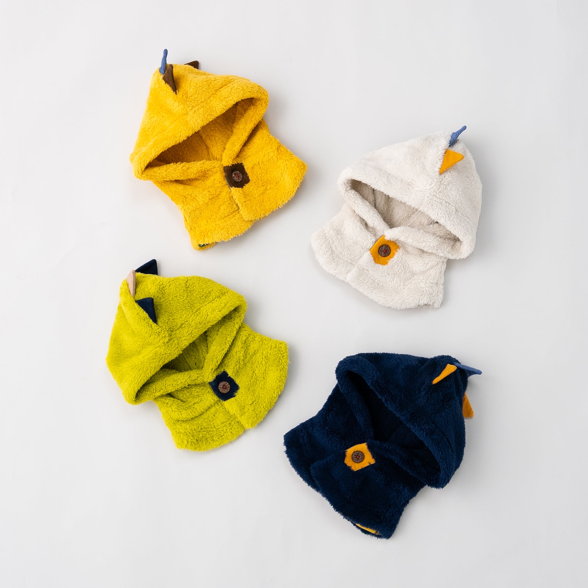 ラグマートの秋冬の定番となったフードネックウォーマーは、見た目もかわいく肌触りが心地よいファー素材。フードとネックウォーマーが一体化したデザインで、これひとつで首元からお耳、頭まで温めてくれる優れモノ。同素材でベビーのティペットがあり、兄弟姉妹のお揃いにオススメです。