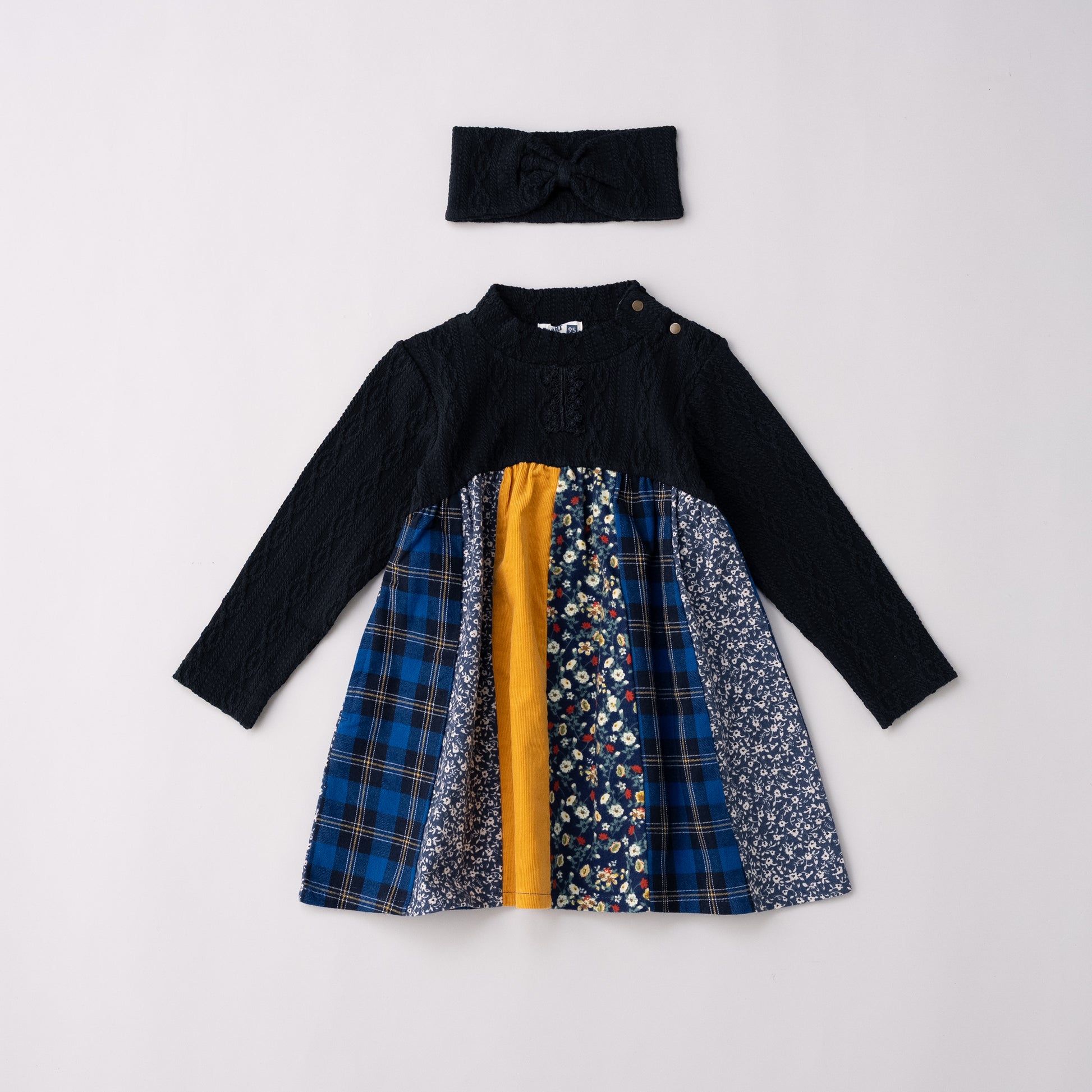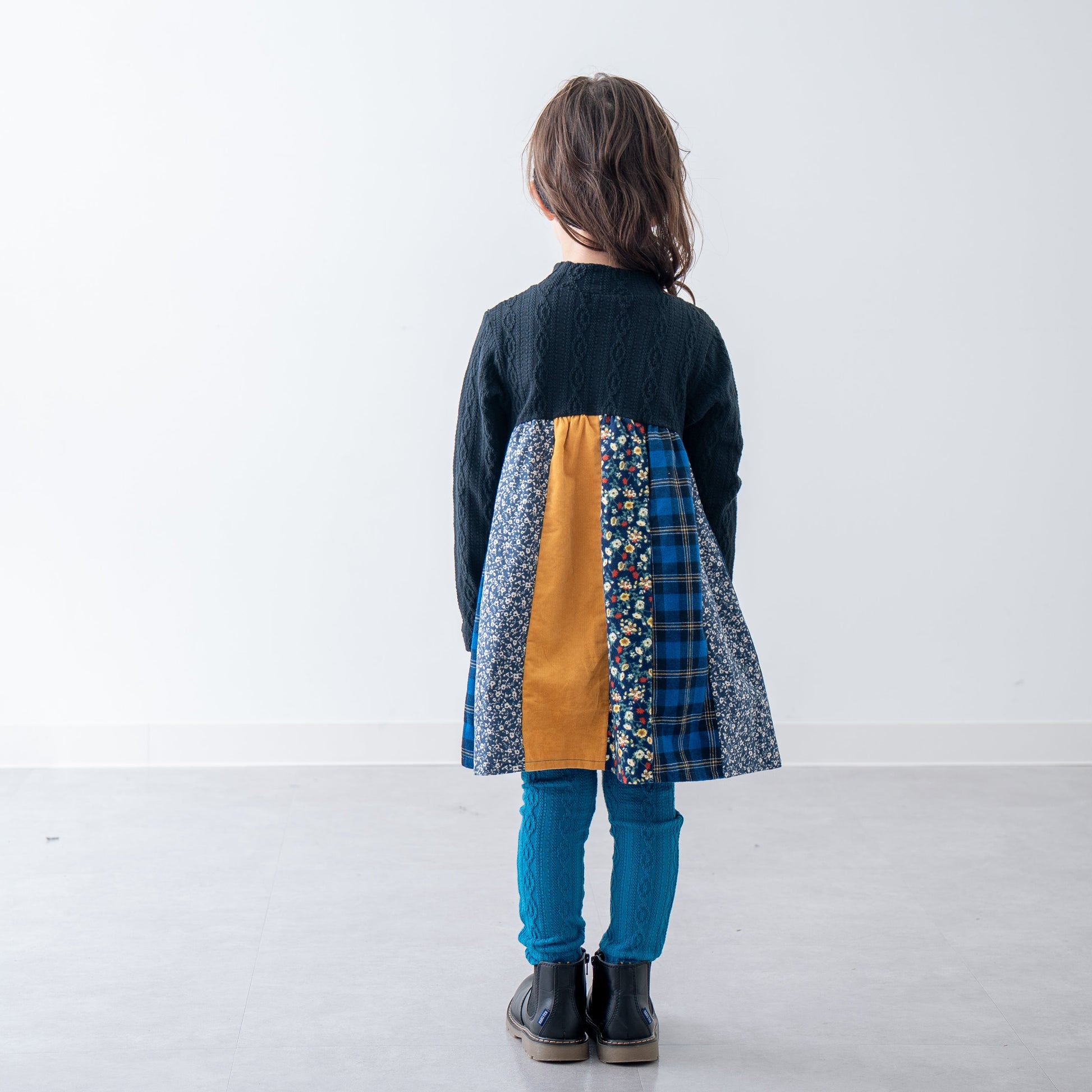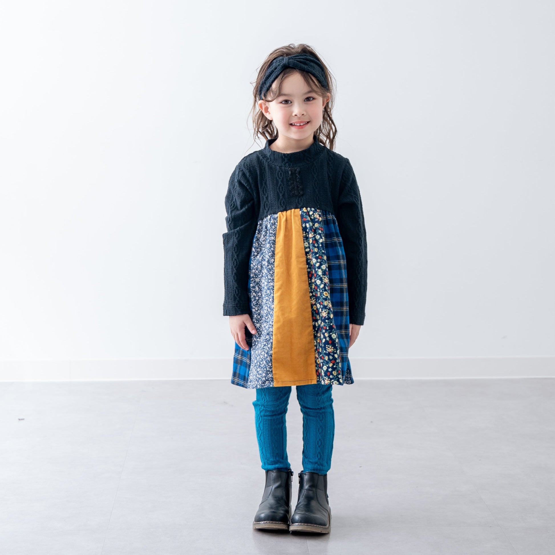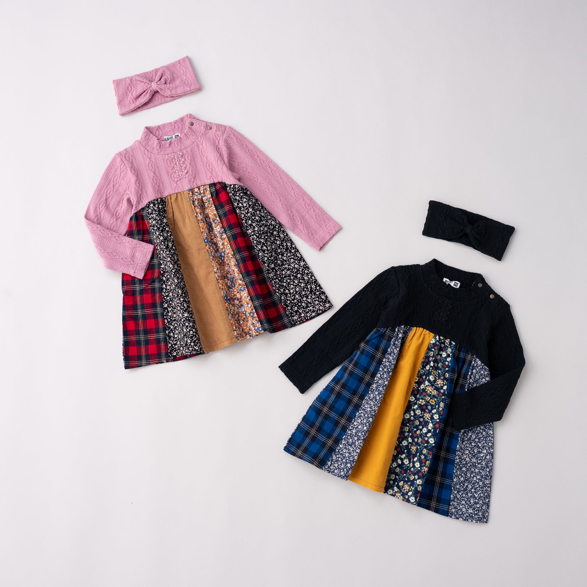 胸元からのフレアなシルエットがガーリーな印象のワンピース。スタイリングのアクセントになるヘアバンドがセットになっています。ケーブルニットとパッチワークのコンビネーションが絶妙です。