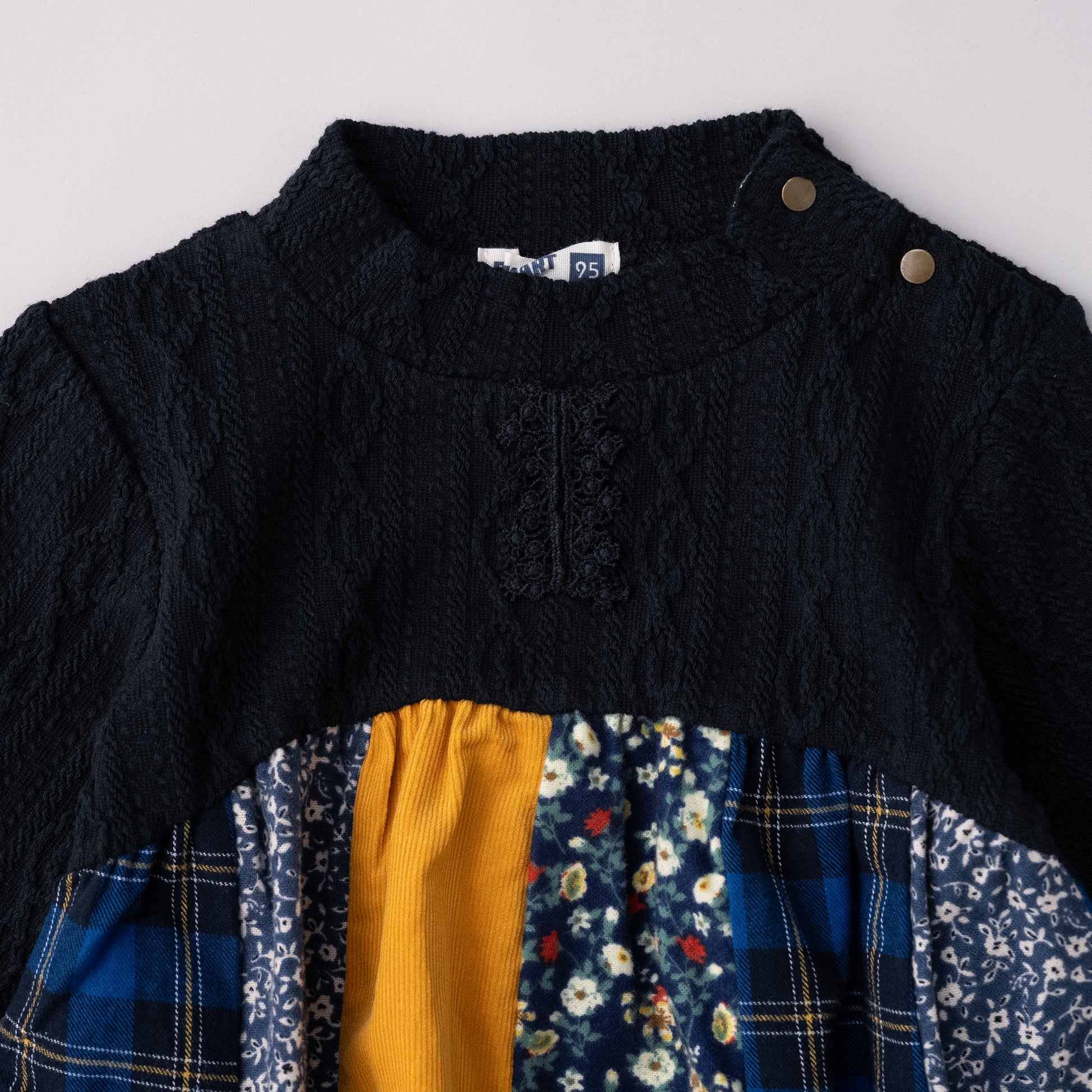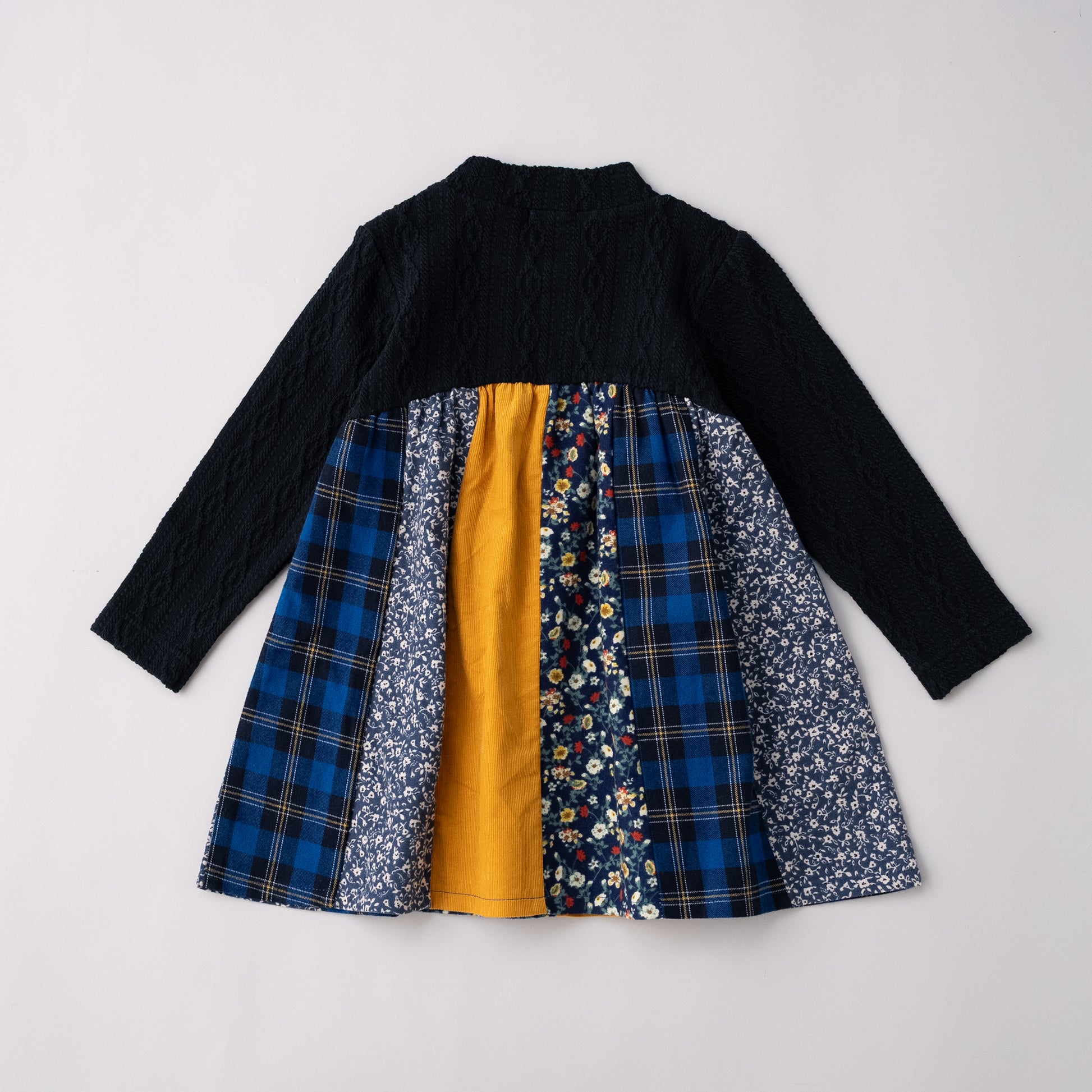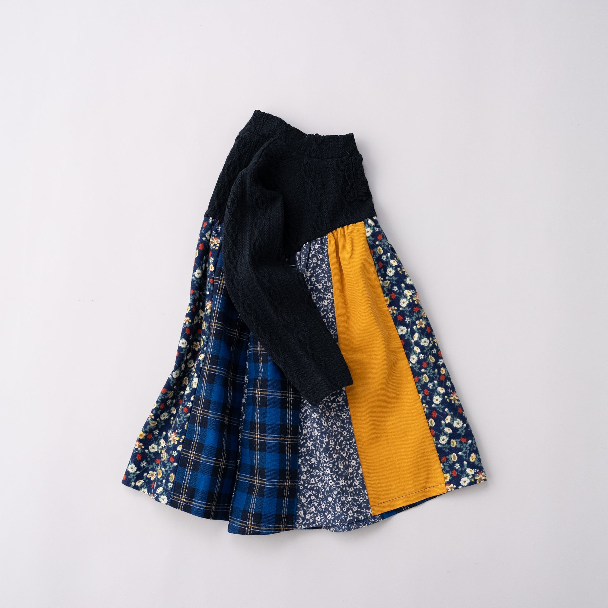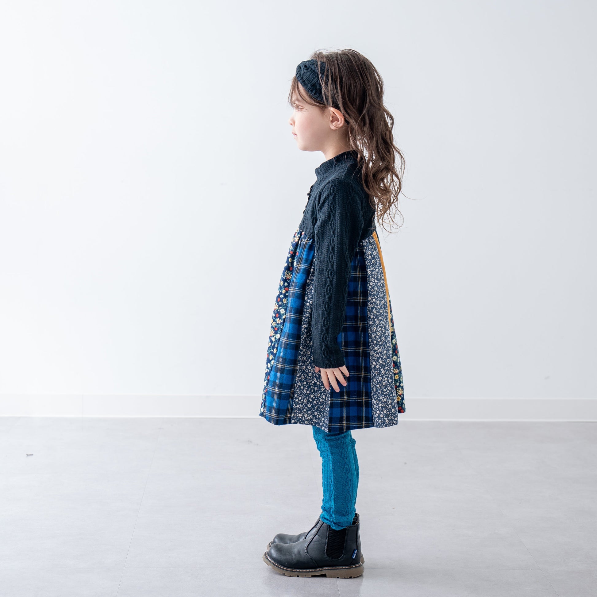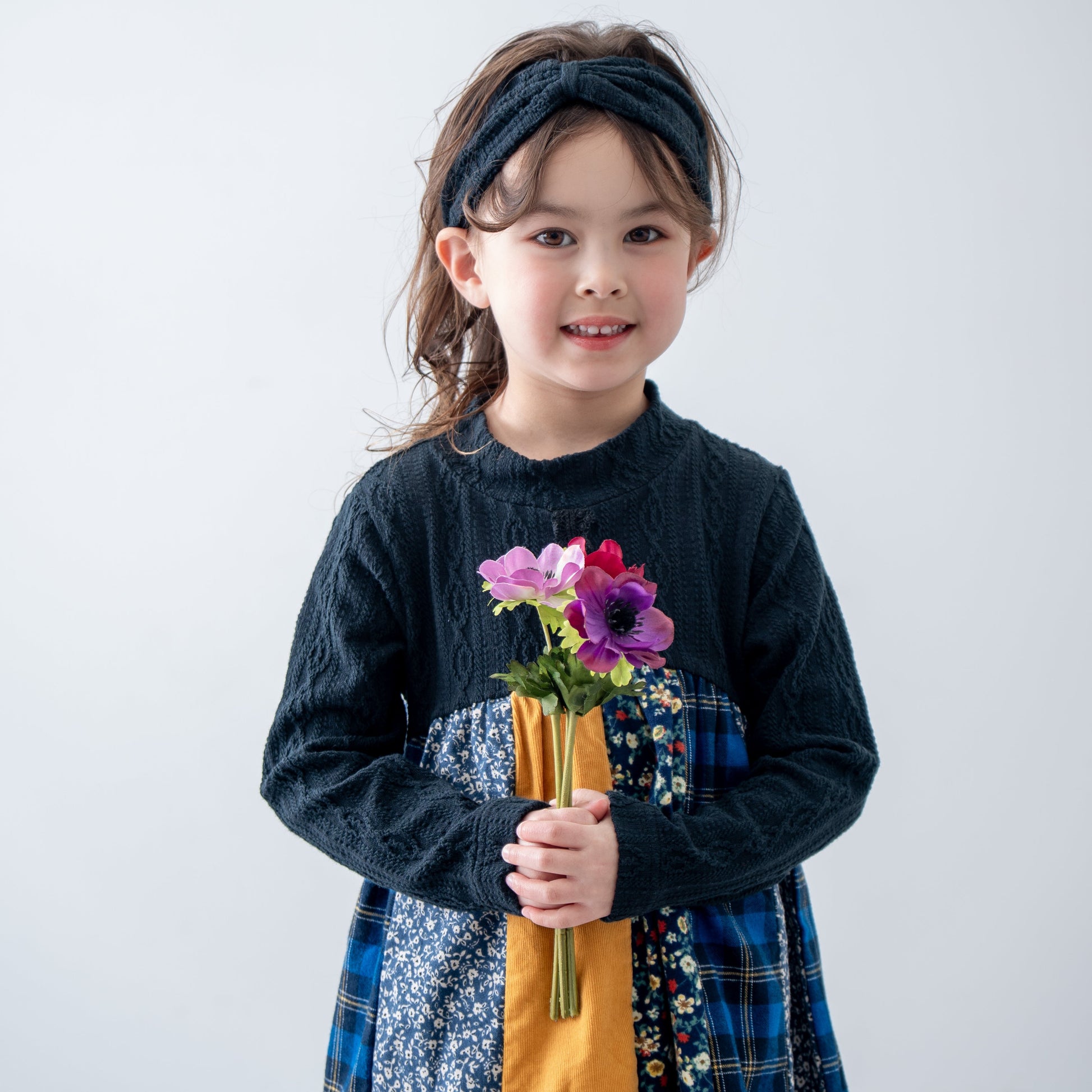 胸元からのフレアなシルエットがガーリーな印象のワンピース。スタイリングのアクセントになるヘアバンドがセットになっています。ケーブルニットとパッチワークのコンビネーションが絶妙です。