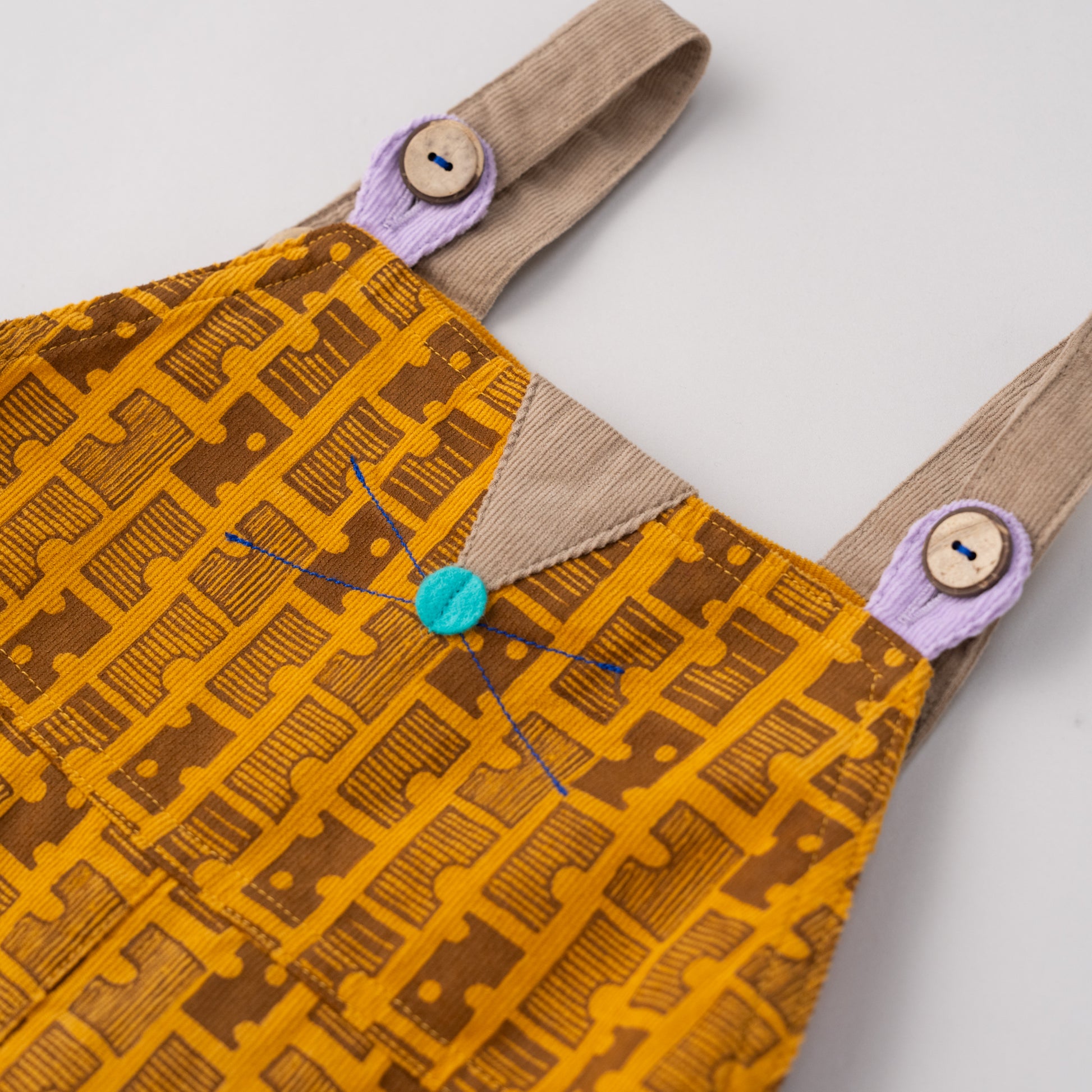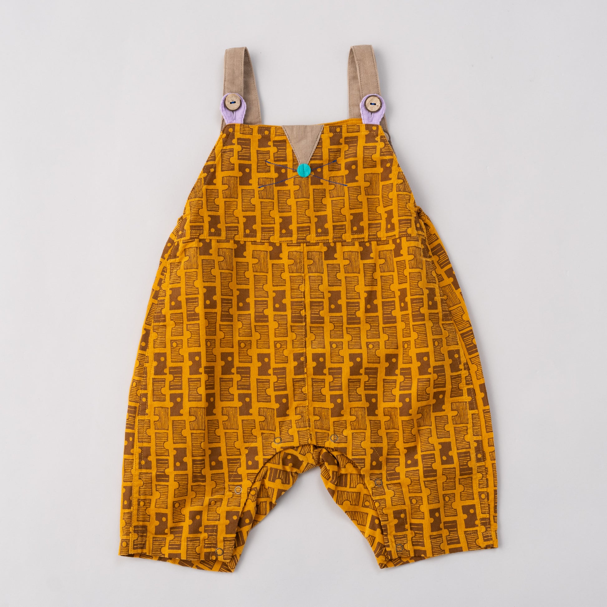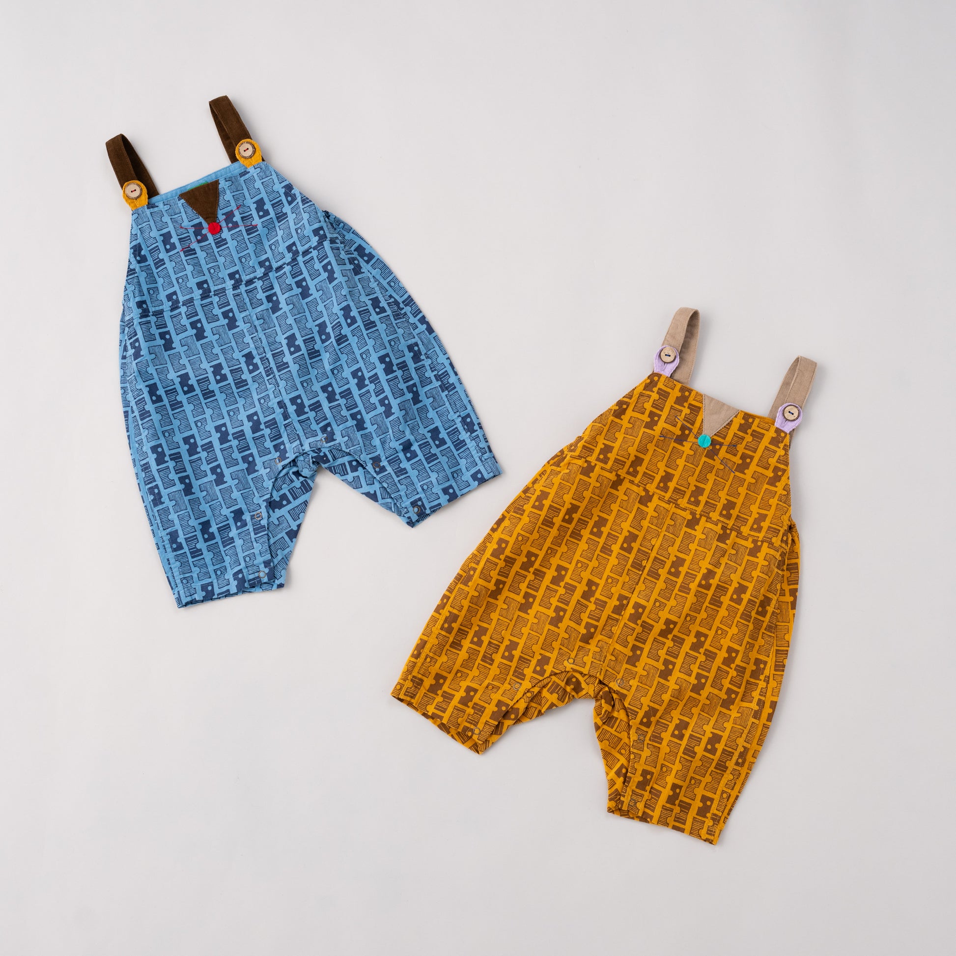 ベビーサロペットは柔らかなミジンコール素材を使用し、全体的に丸いシルエットが赤ちゃんらしくかわいいデザイン。個性的な総柄でユニセックスにお使いいただけます。