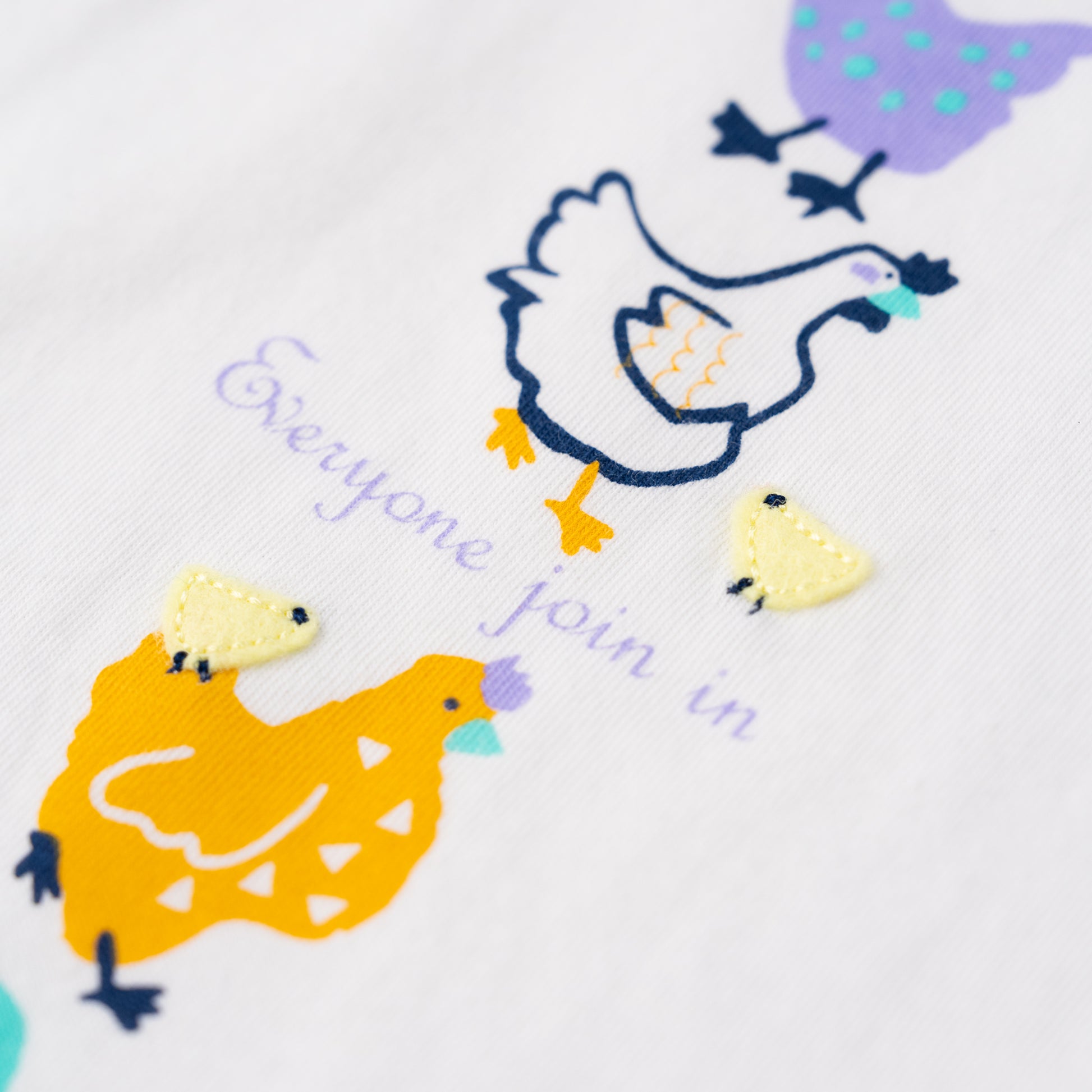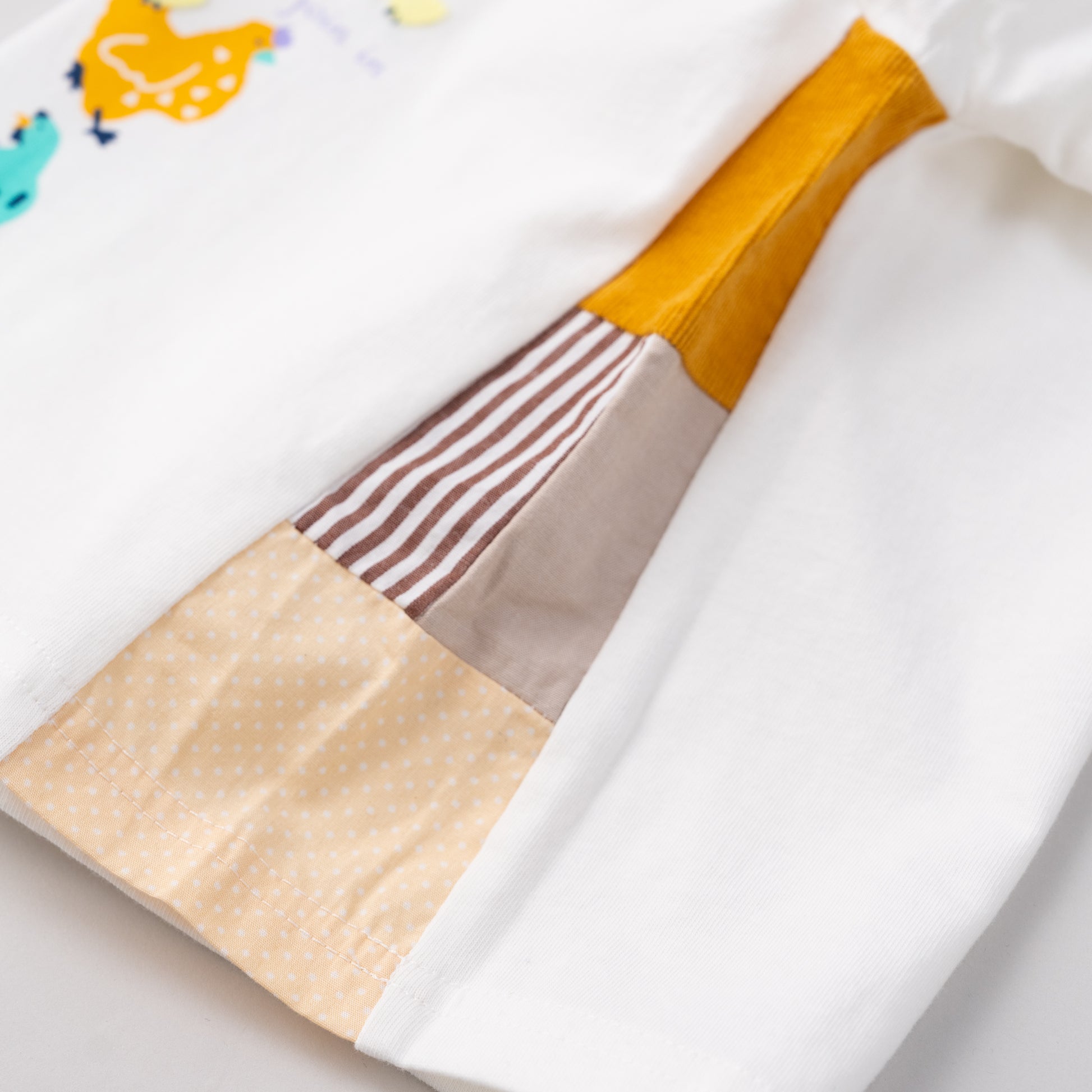 ニワトリさんのプリントがかわいいベビーTシャツ。脇にチラリと見えるパッチワークの切り替えもアクセントになっているデザイン。着心地の良い天竺素材は秋~春まで大活躍間違いなしです。