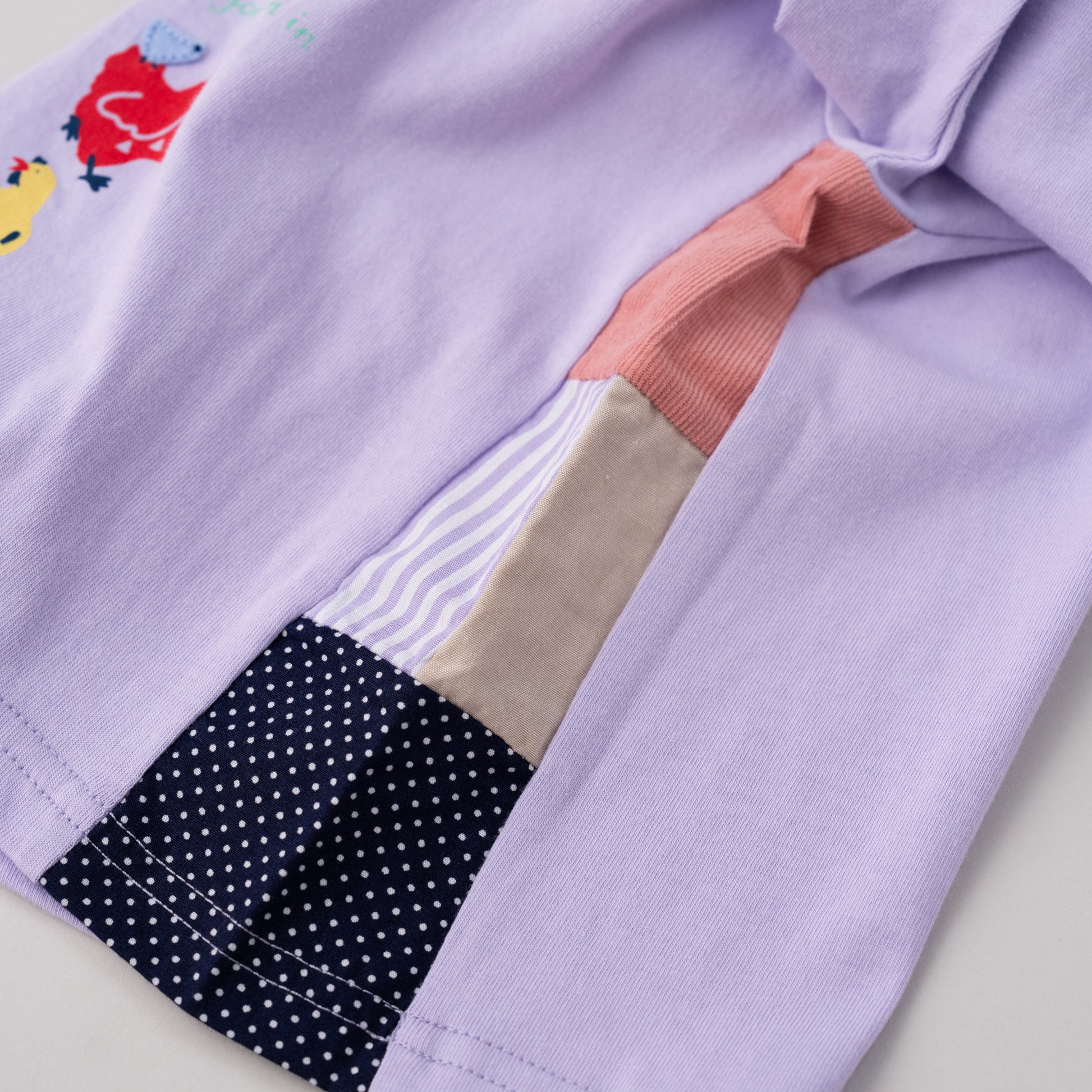 ニワトリさんのプリントがかわいいベビーTシャツ。脇にチラリと見えるパッチワークの切り替えもアクセントになっているデザイン。着心地の良い天竺素材は秋~春まで大活躍間違いなしです。