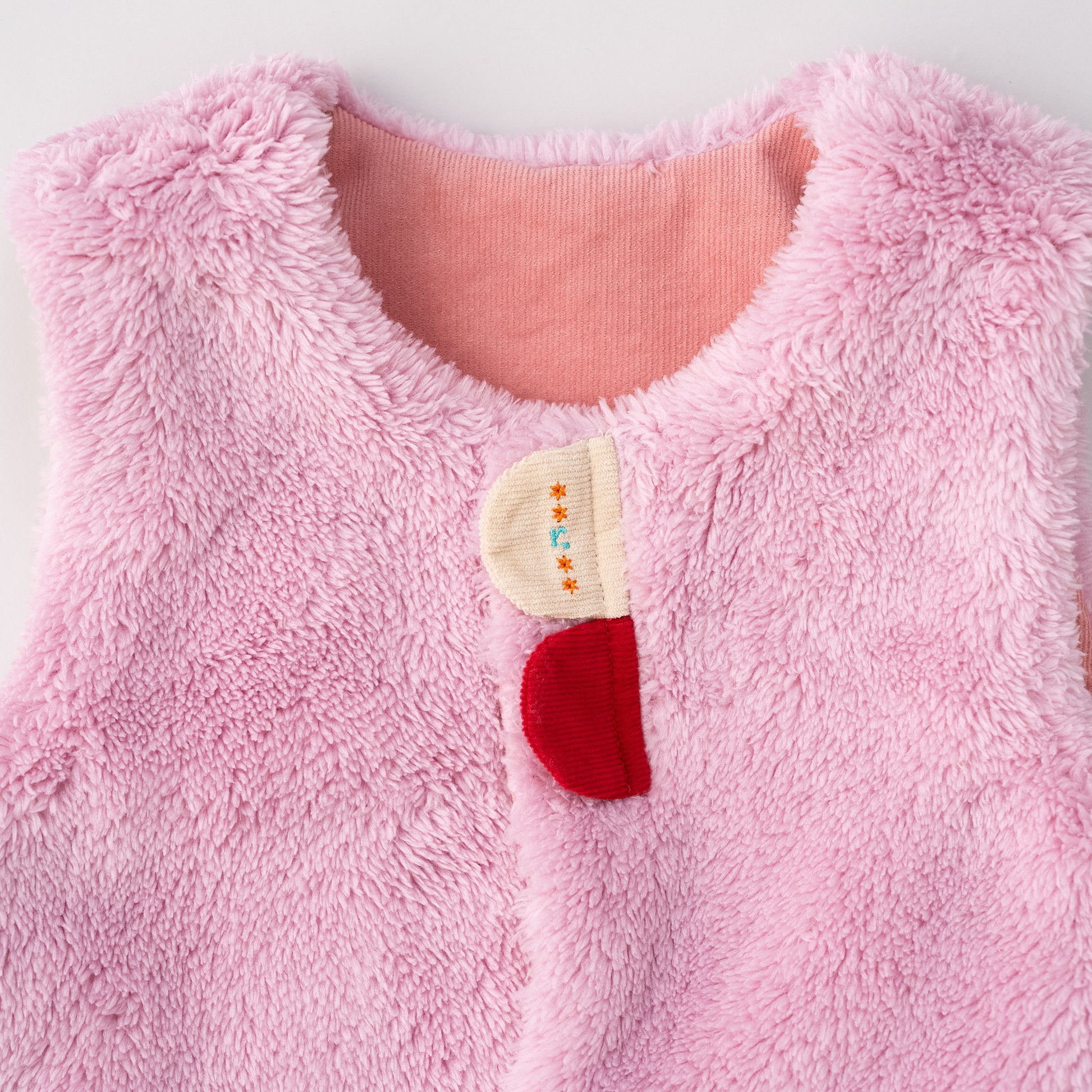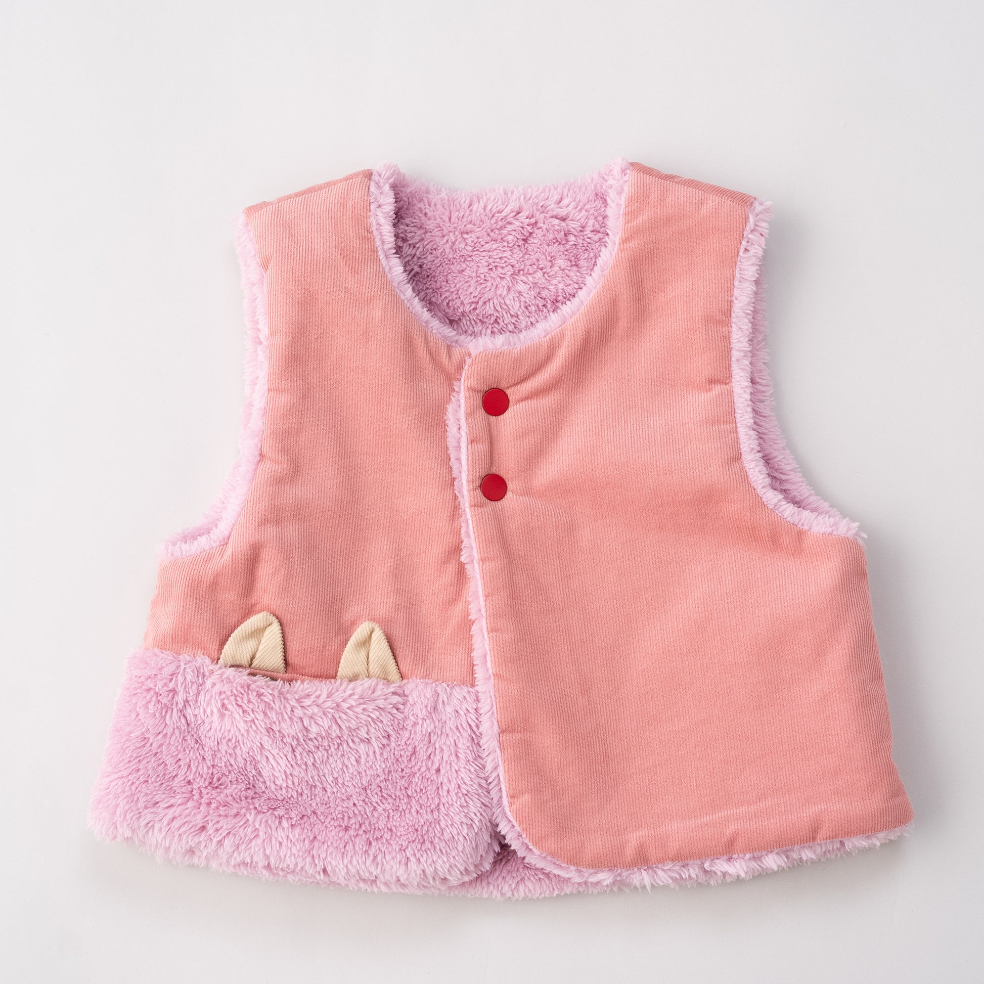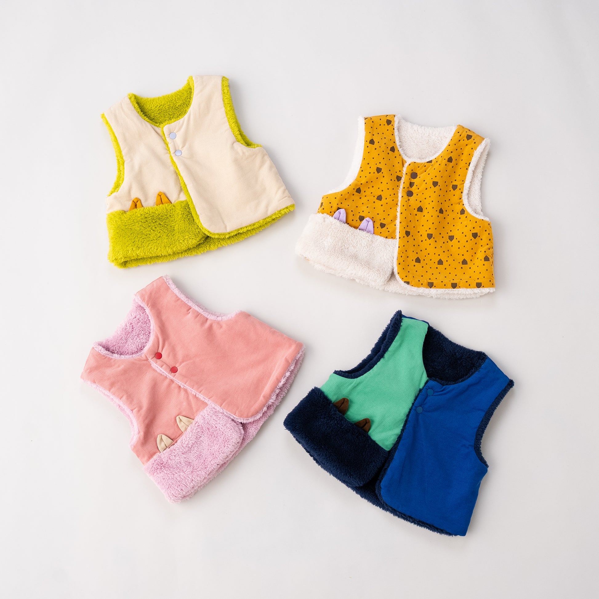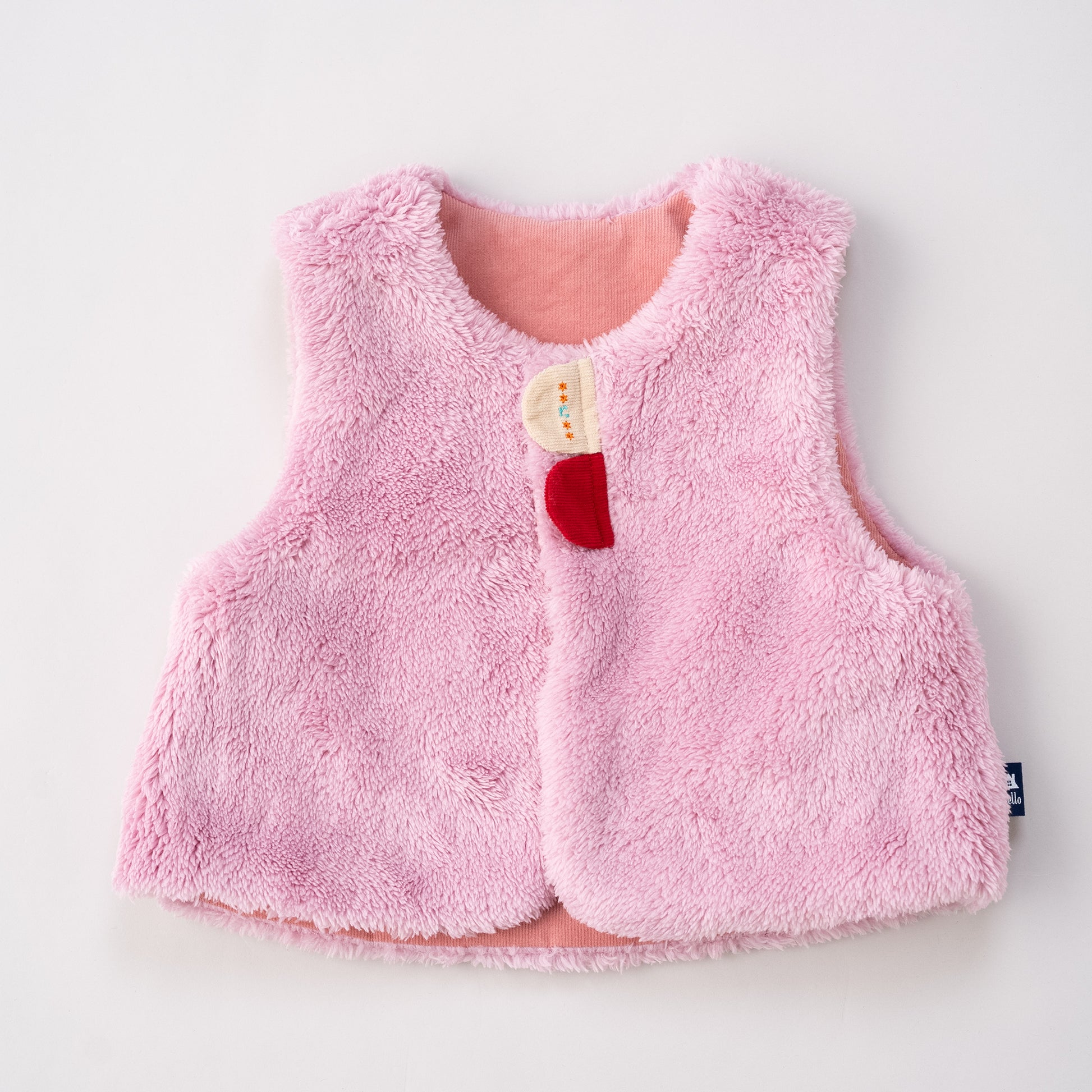 柔らかなミジンコールとファーのベビーベストは、ちょっとしたお出かけや室内でも羽織りやすいデザイン。プリントや配色カラーがアクセントになっており、リバーシブルでお使いいただけます。
