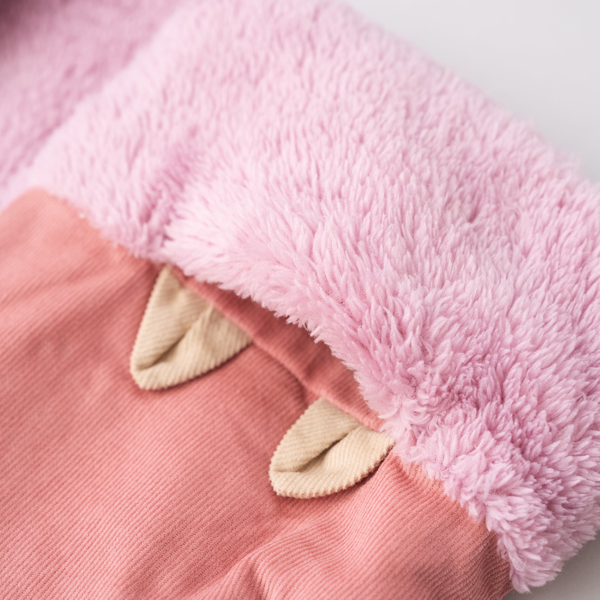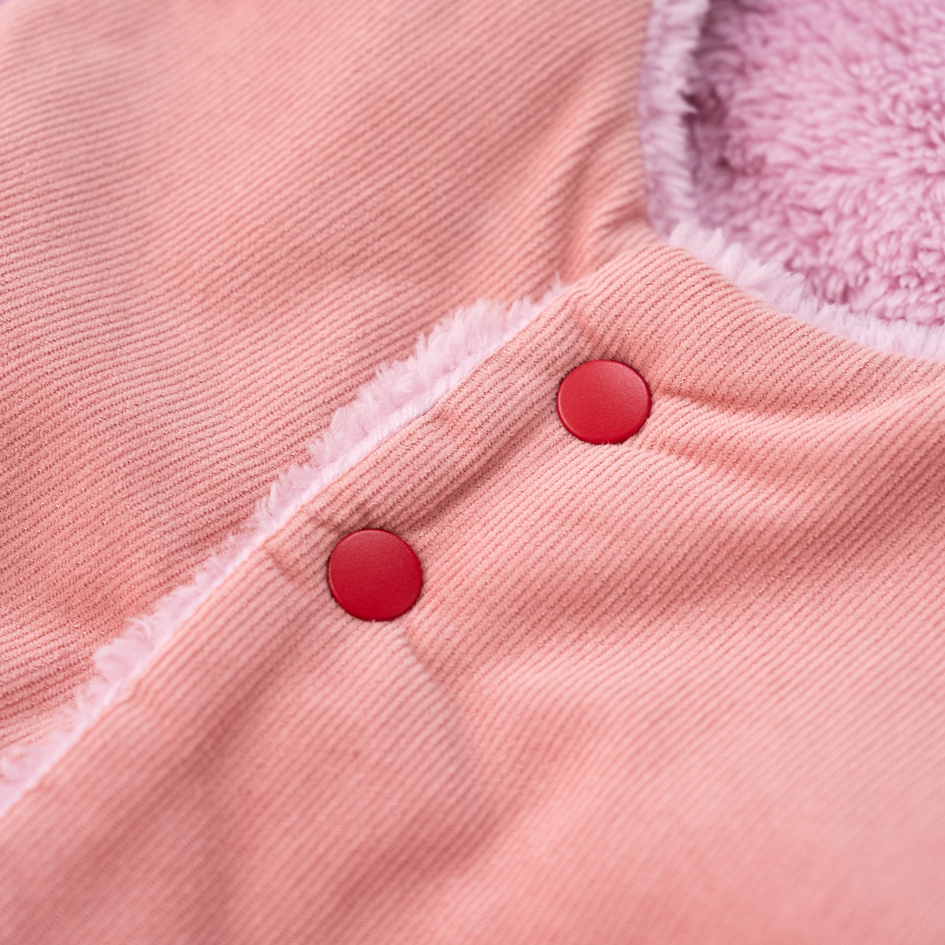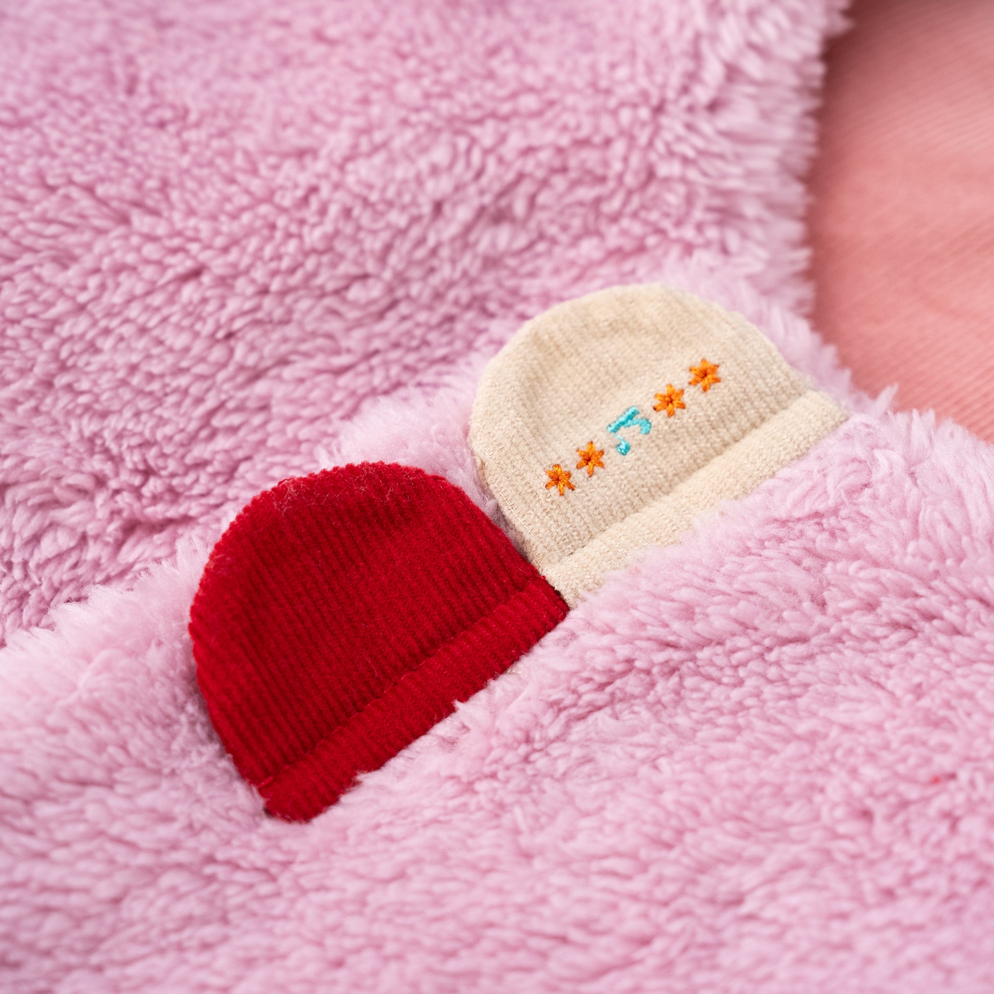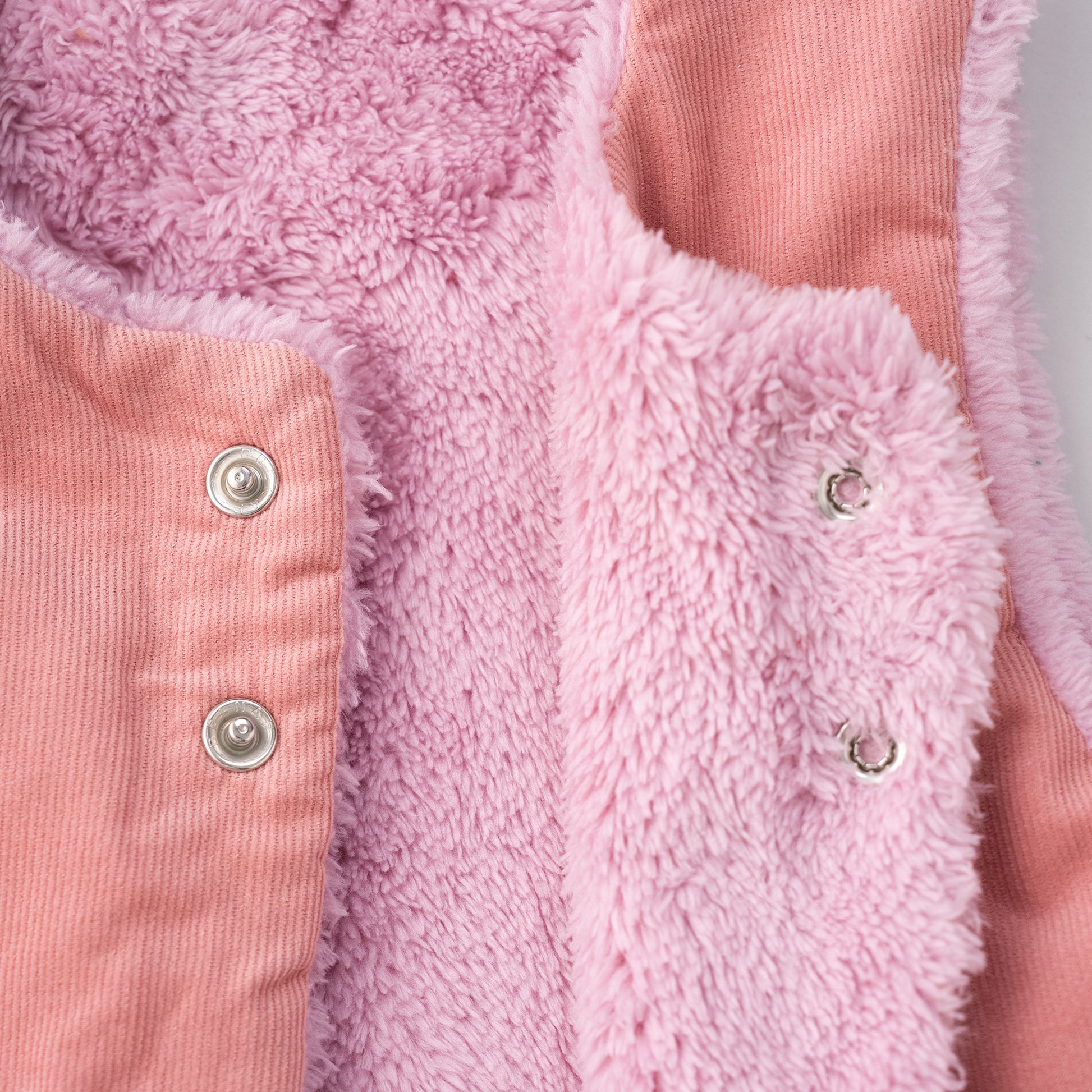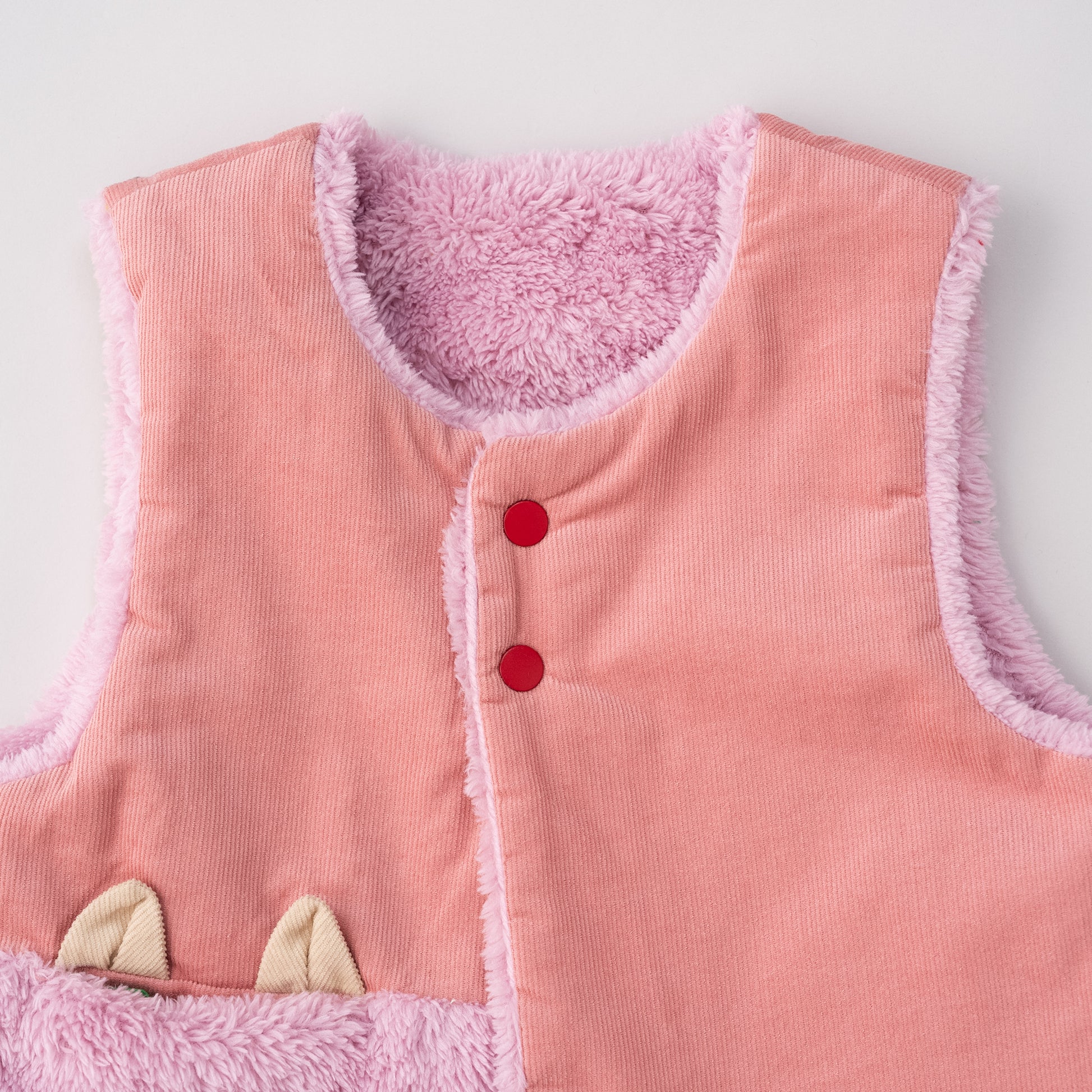 柔らかなミジンコールとファーのベビーベストは、ちょっとしたお出かけや室内でも羽織りやすいデザイン。プリントや配色カラーがアクセントになっており、リバーシブルでお使いいただけます。