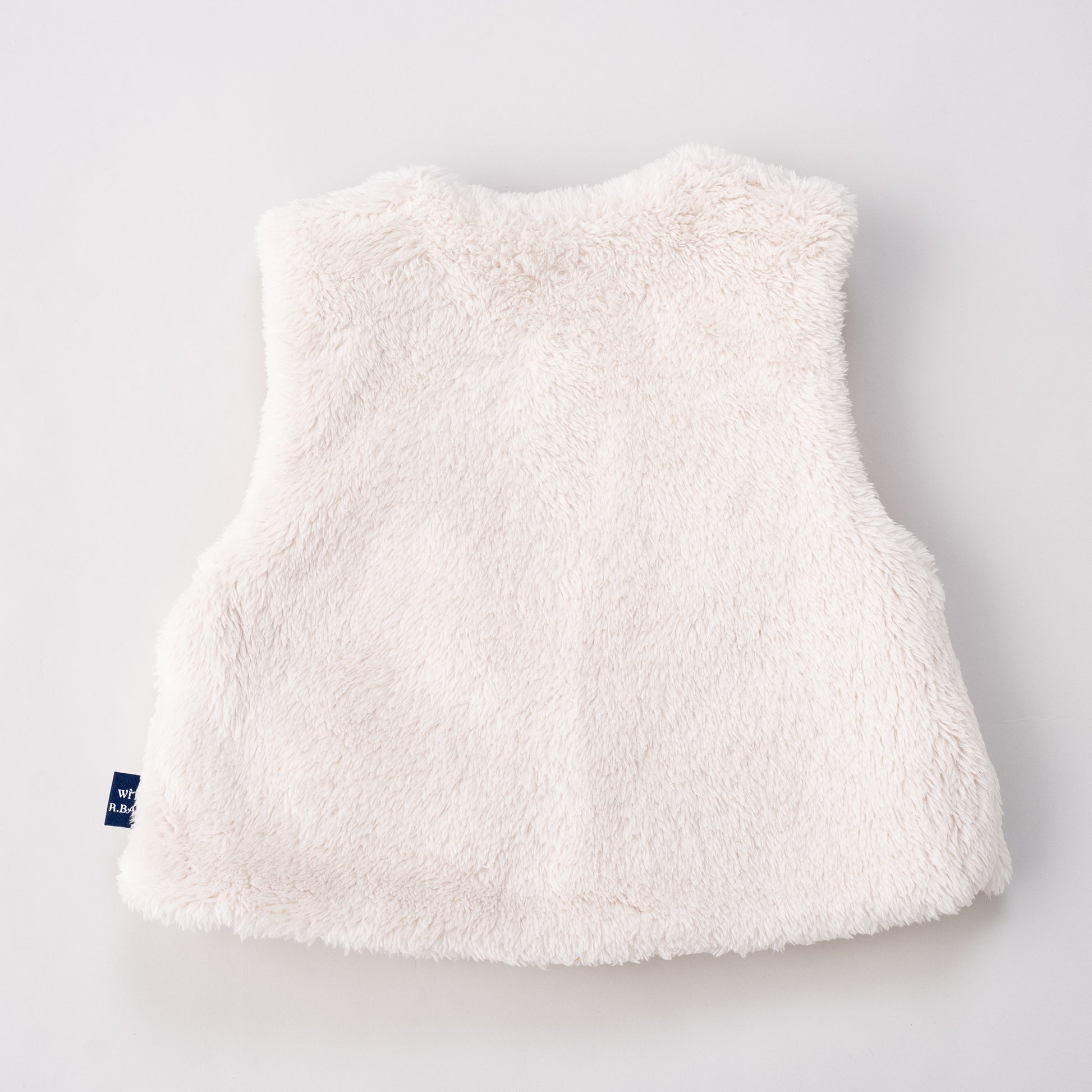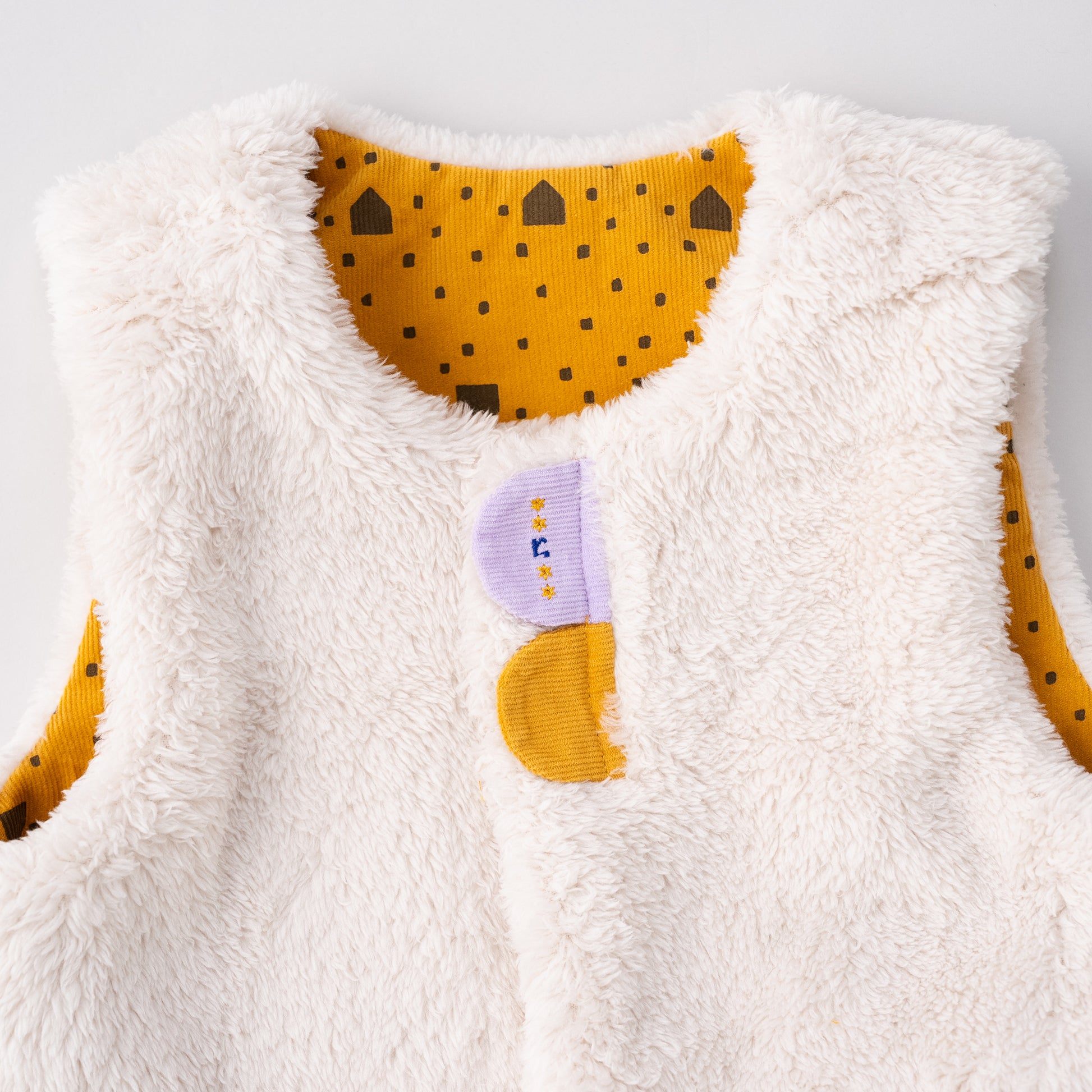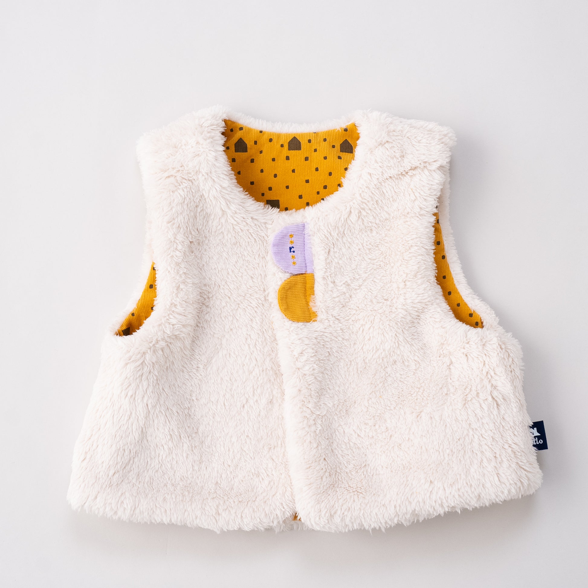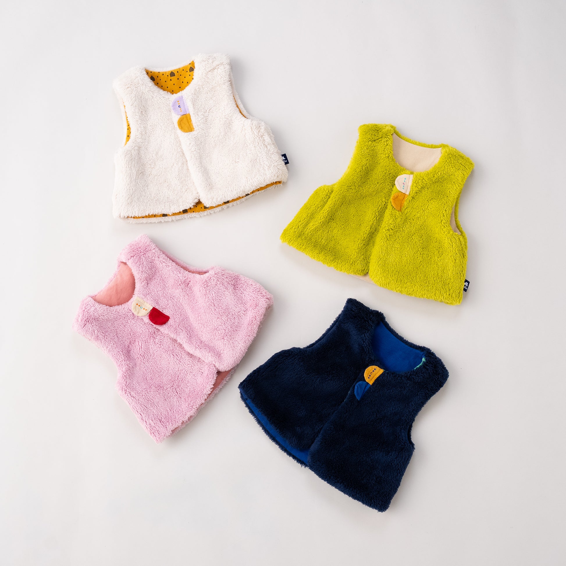 柔らかなミジンコールとファーのベビーベストは、ちょっとしたお出かけや室内でも羽織りやすいデザイン。プリントや配色カラーがアクセントになっており、リバーシブルでお使いいただけます。