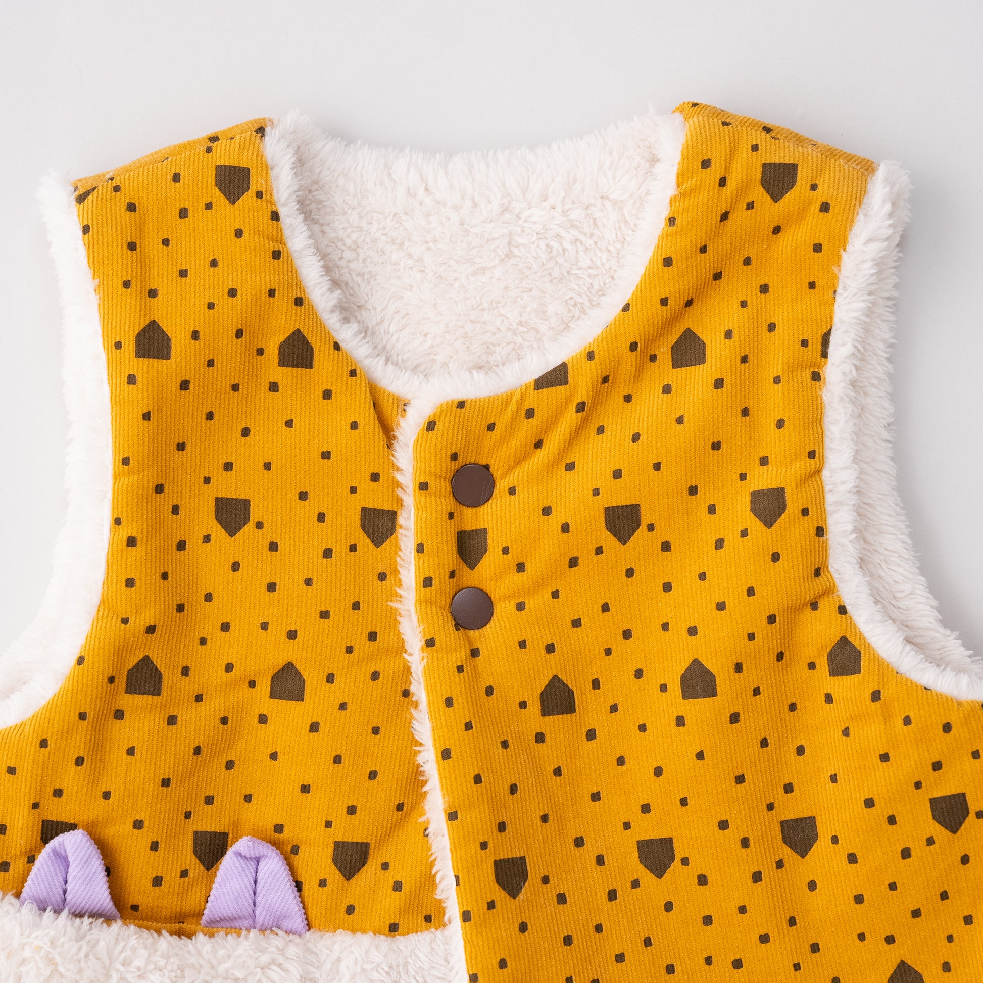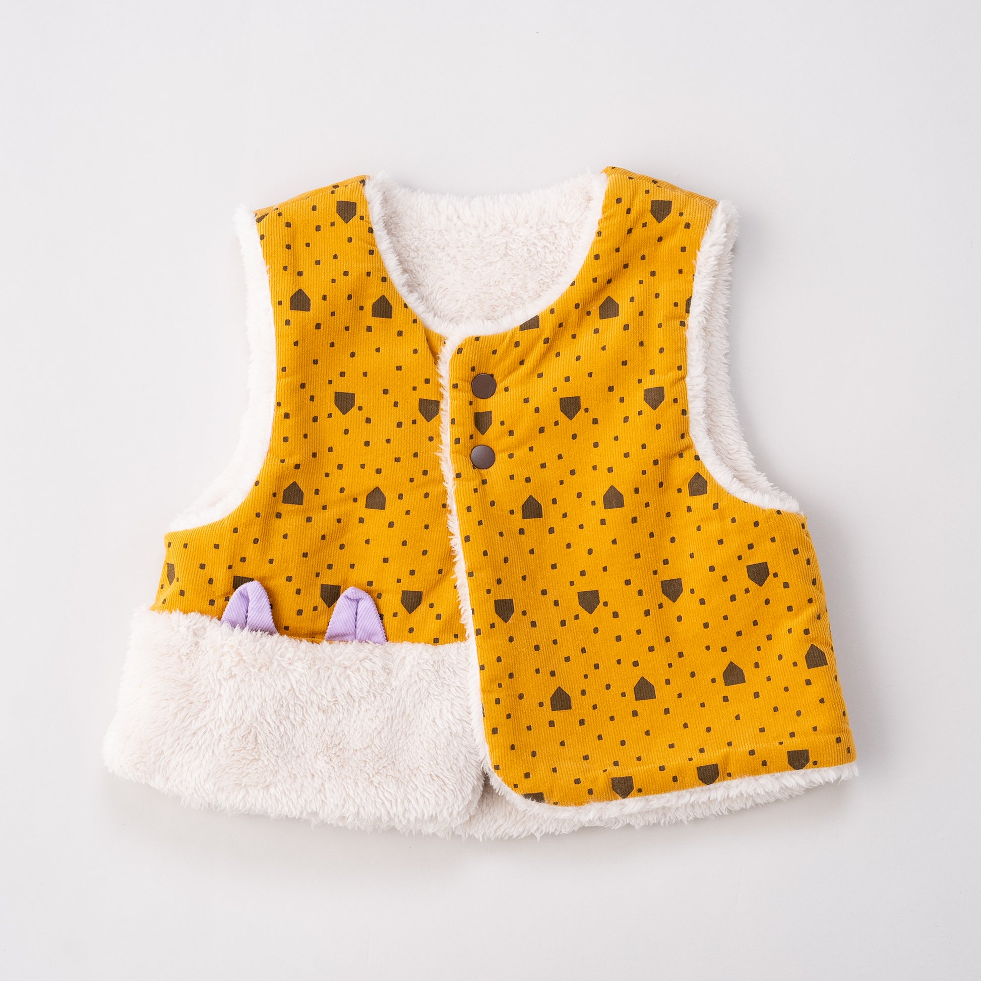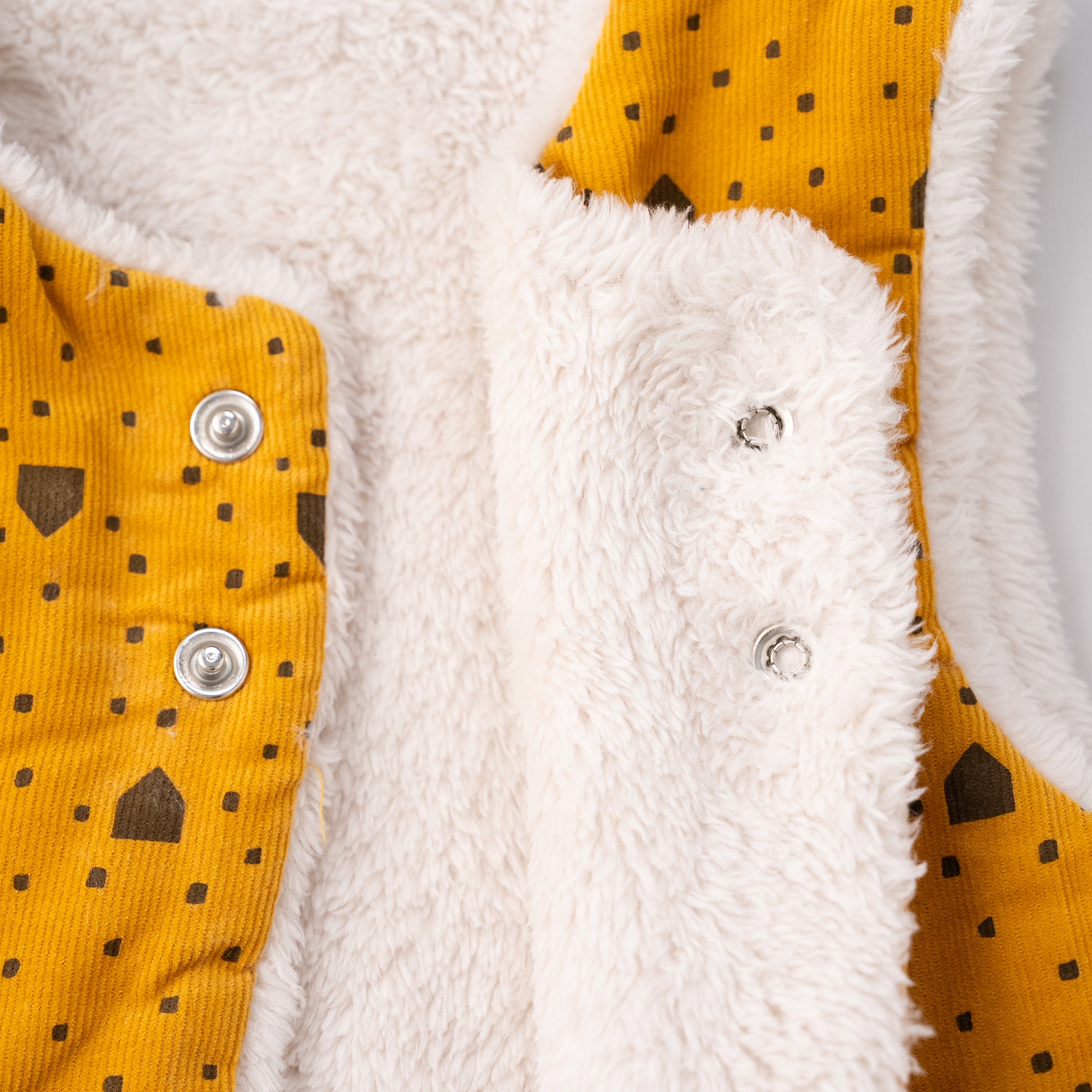 柔らかなミジンコールとファーのベビーベストは、ちょっとしたお出かけや室内でも羽織りやすいデザイン。プリントや配色カラーがアクセントになっており、リバーシブルでお使いいただけます。