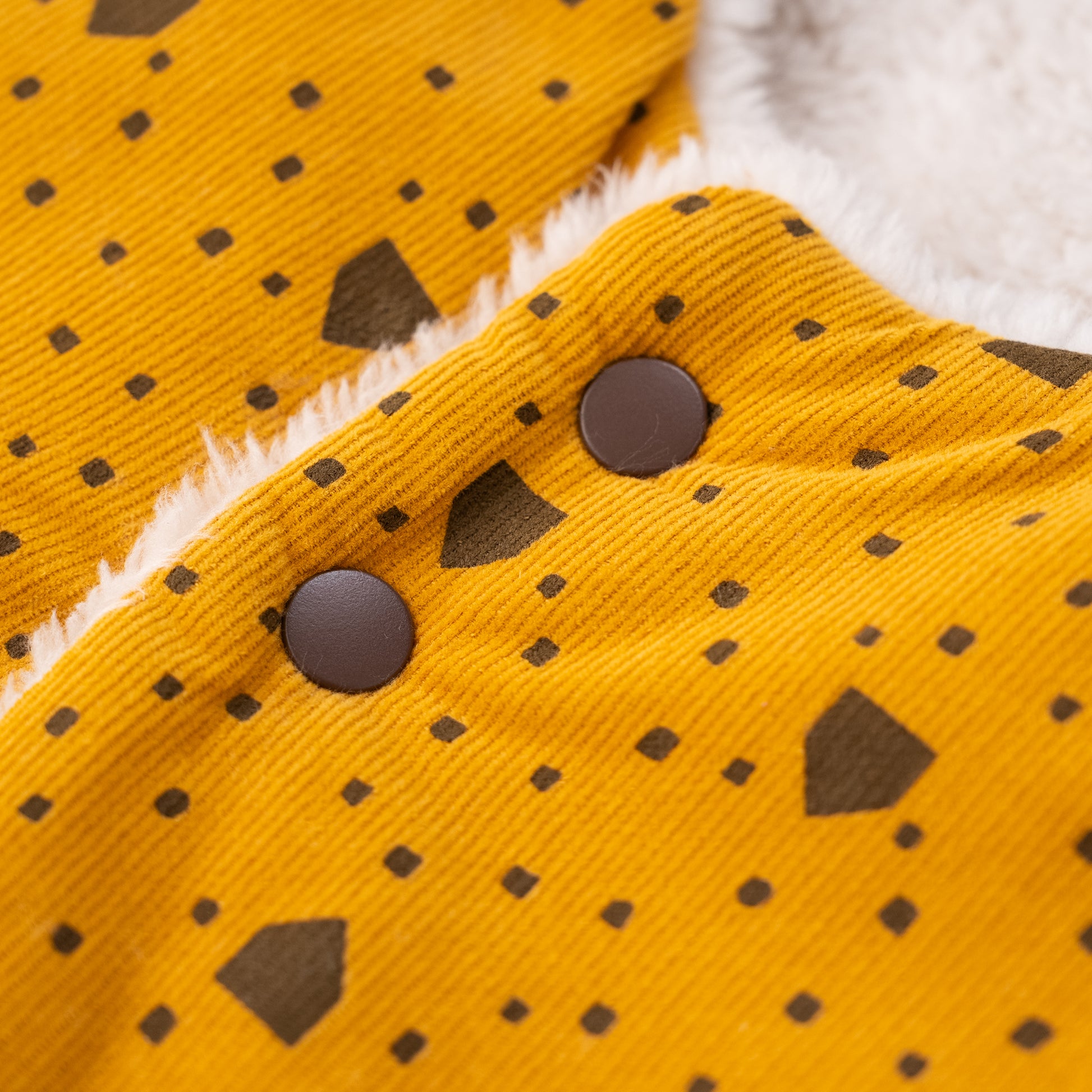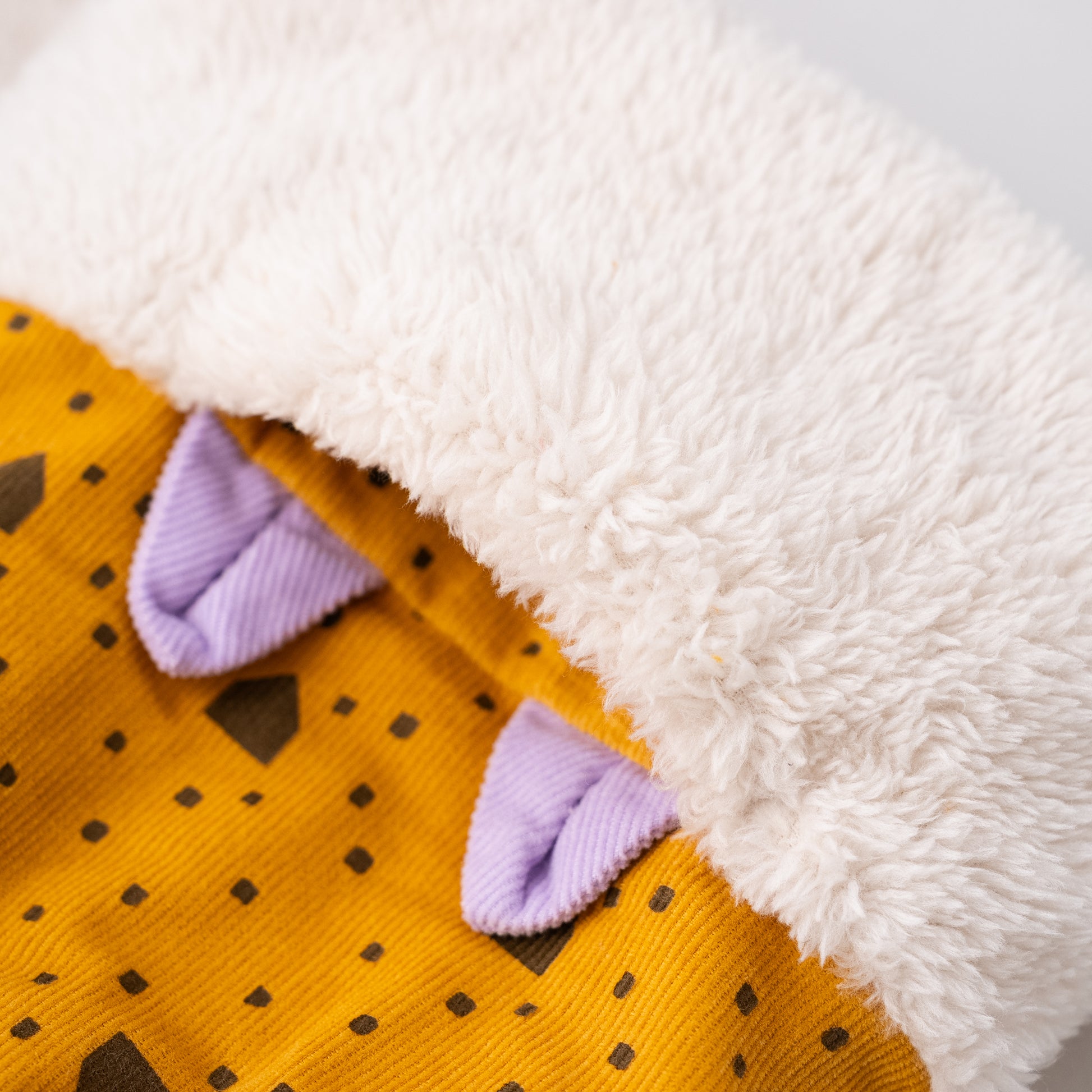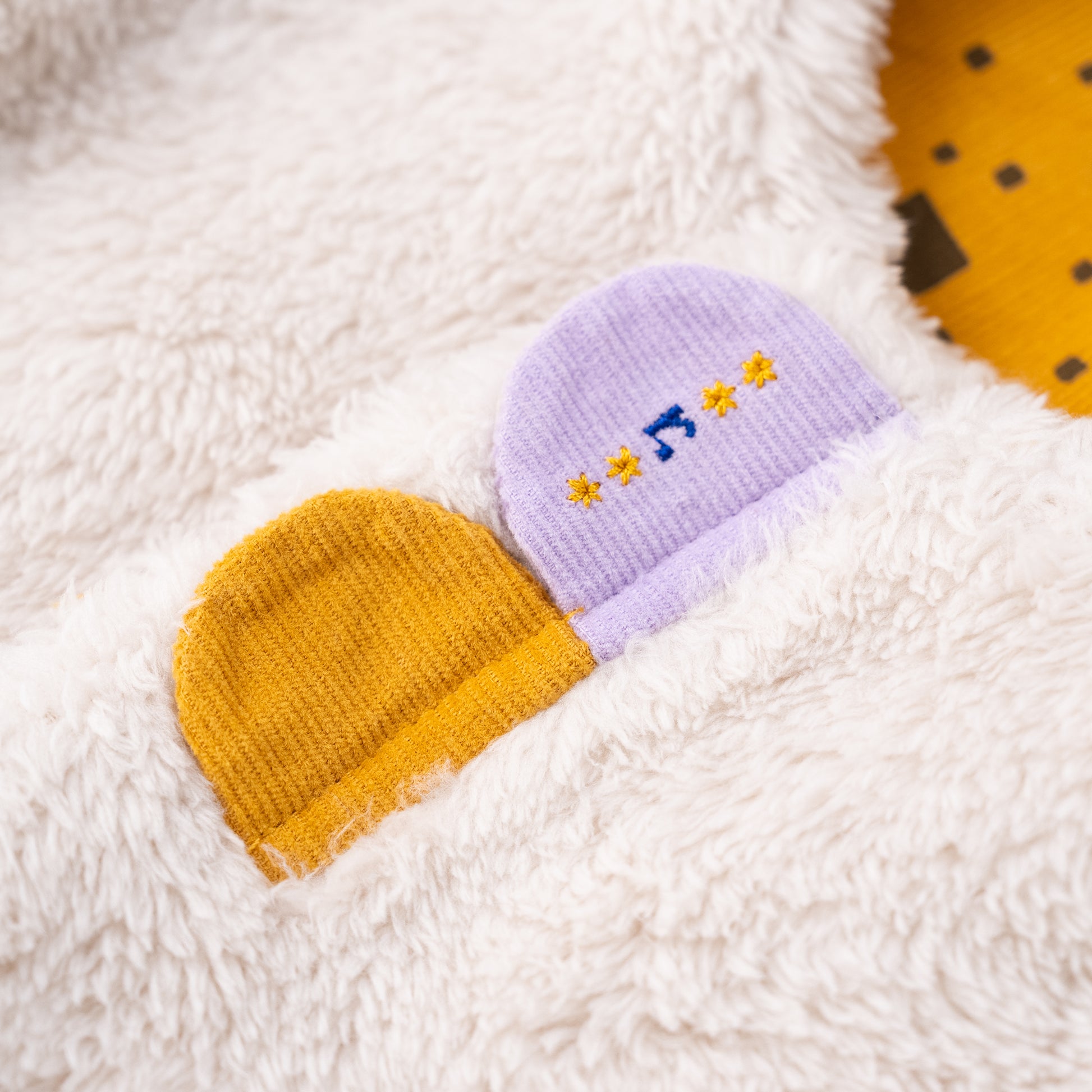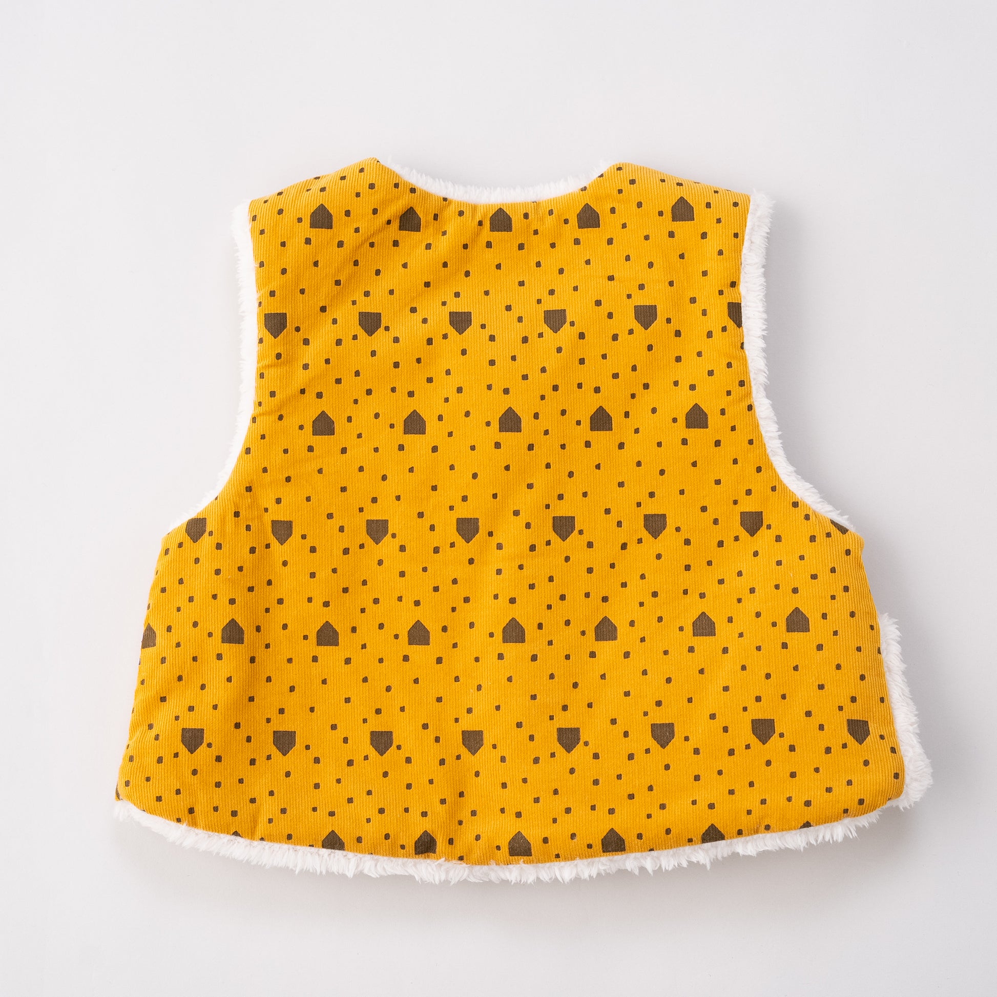 柔らかなミジンコールとファーのベビーベストは、ちょっとしたお出かけや室内でも羽織りやすいデザイン。プリントや配色カラーがアクセントになっており、リバーシブルでお使いいただけます。