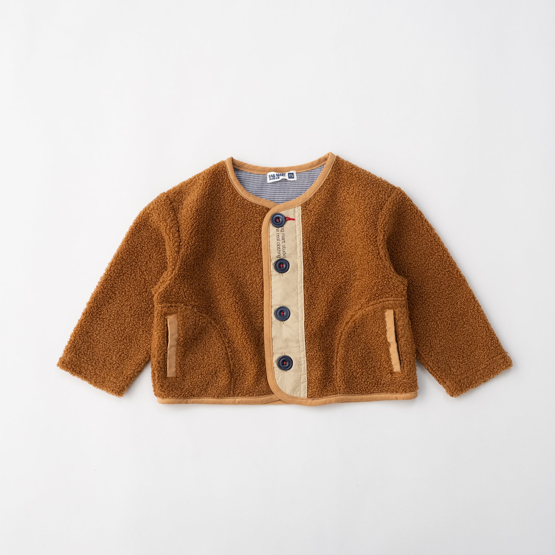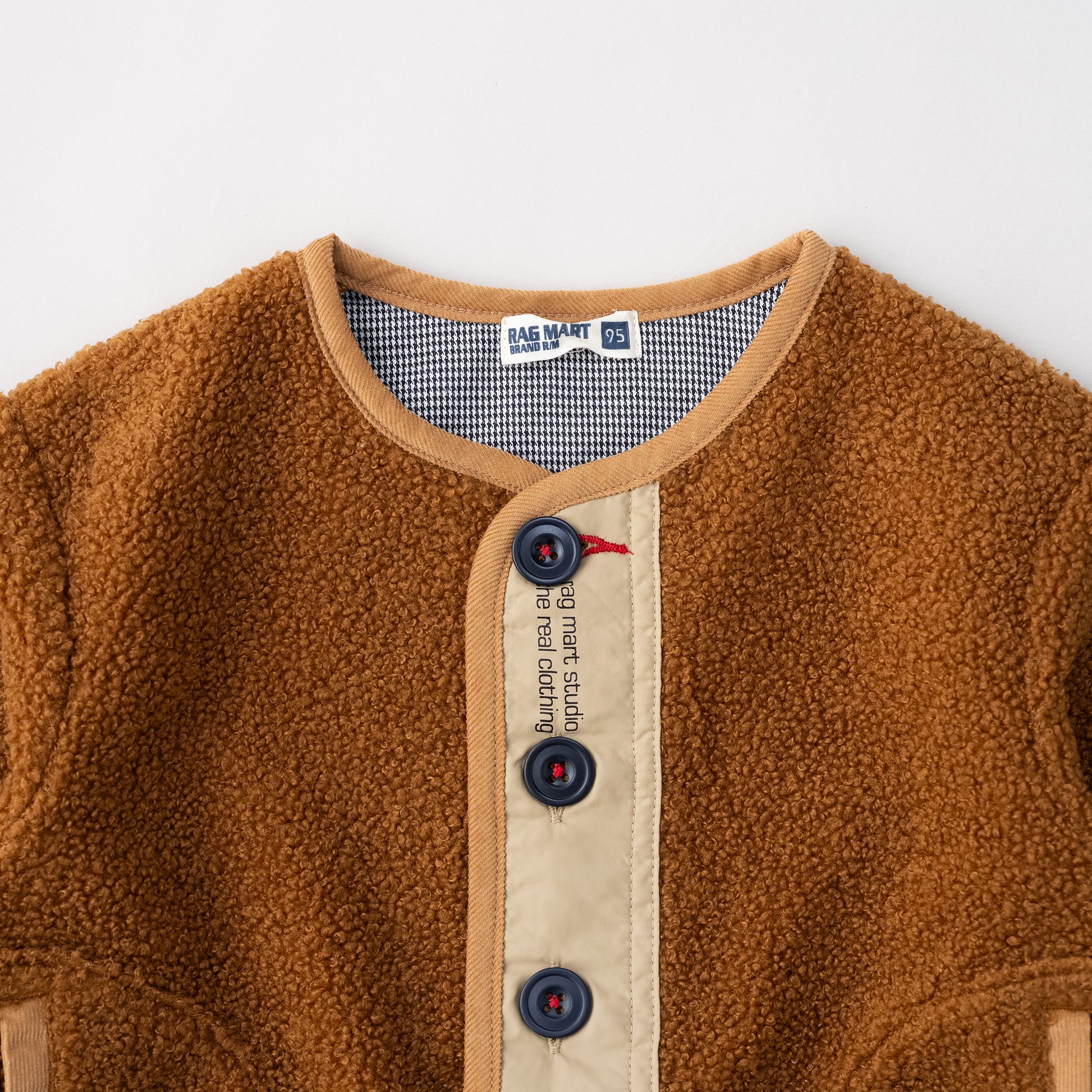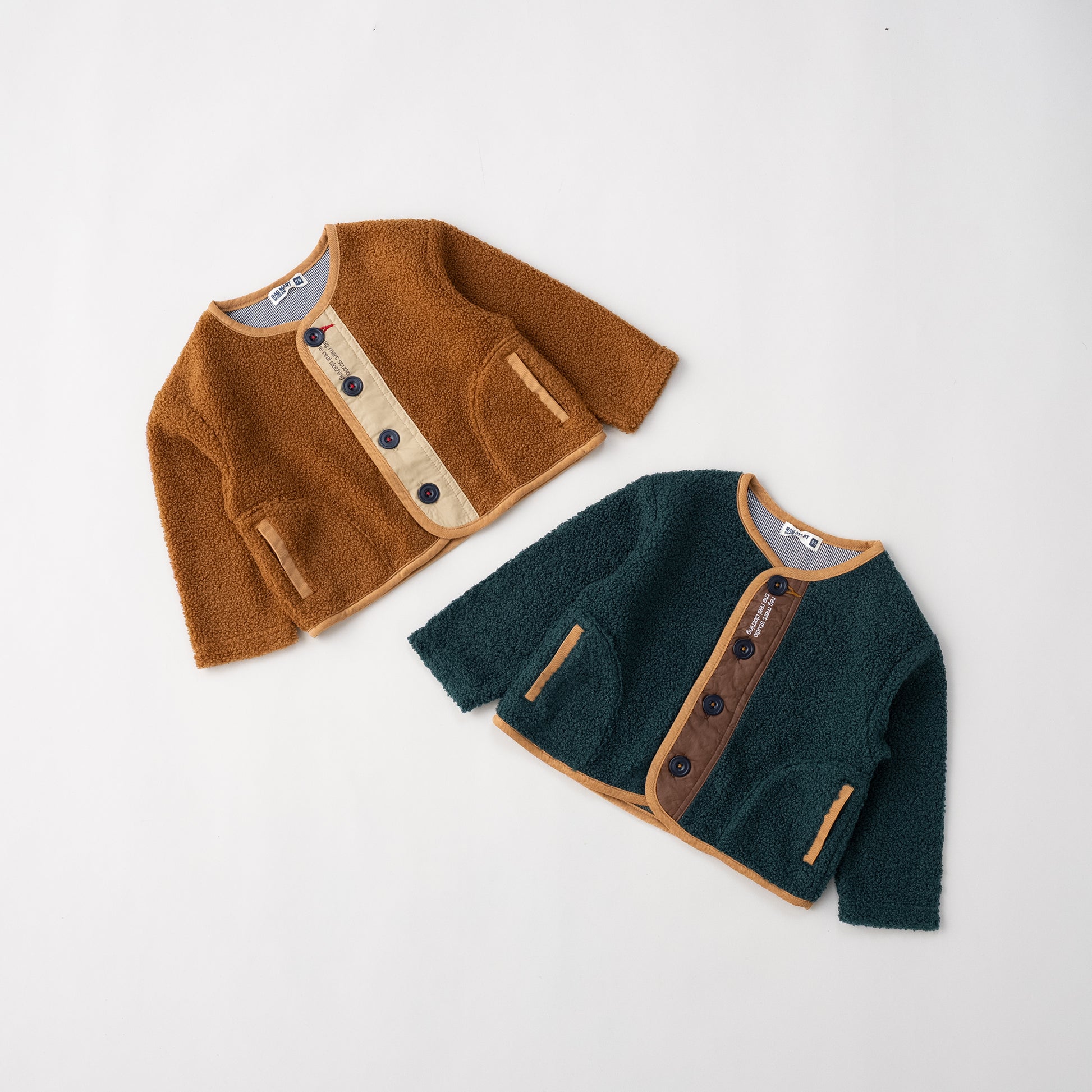 ウォーム感たっぷりなボア素材のカーディガンは、パイピングや前立てのデザインがアクセントに。もこもことしたボアは程よい厚みがあり、本格的なアウターを着るまでの羽織として活躍します。どちらのカラーもユニセックスに使っていただけます。