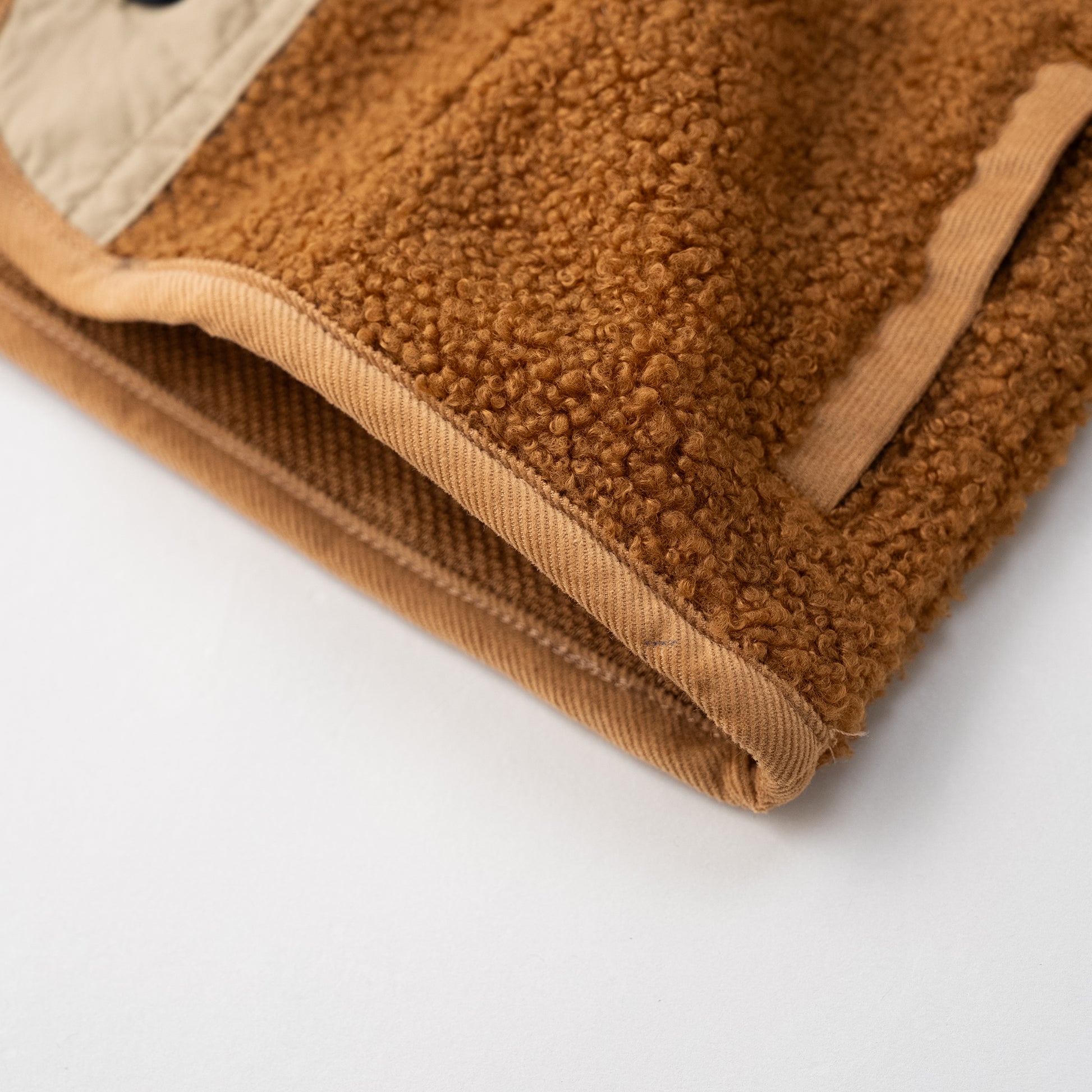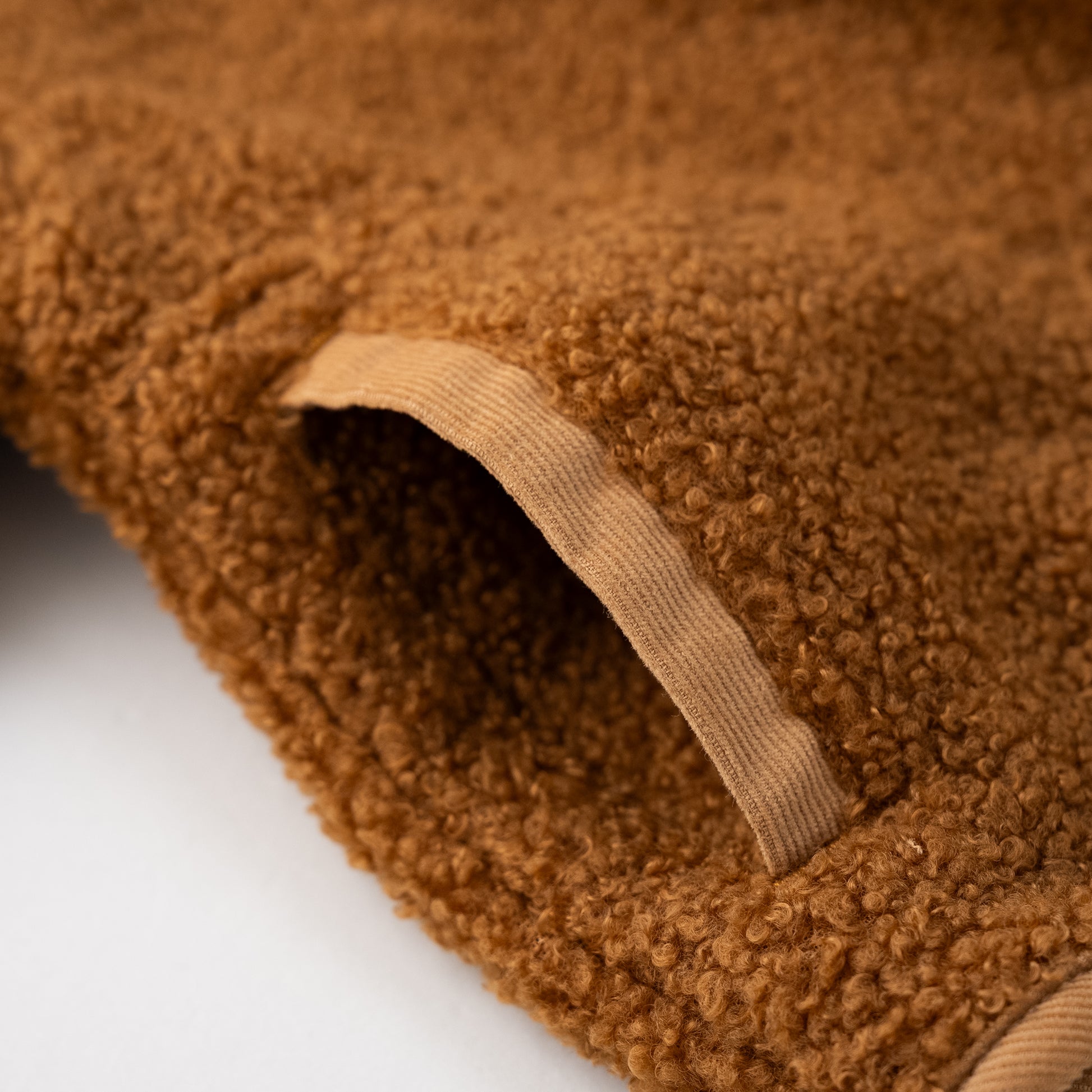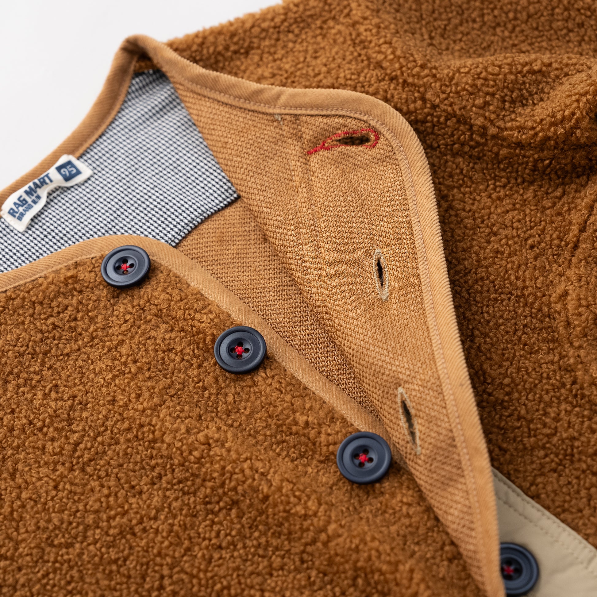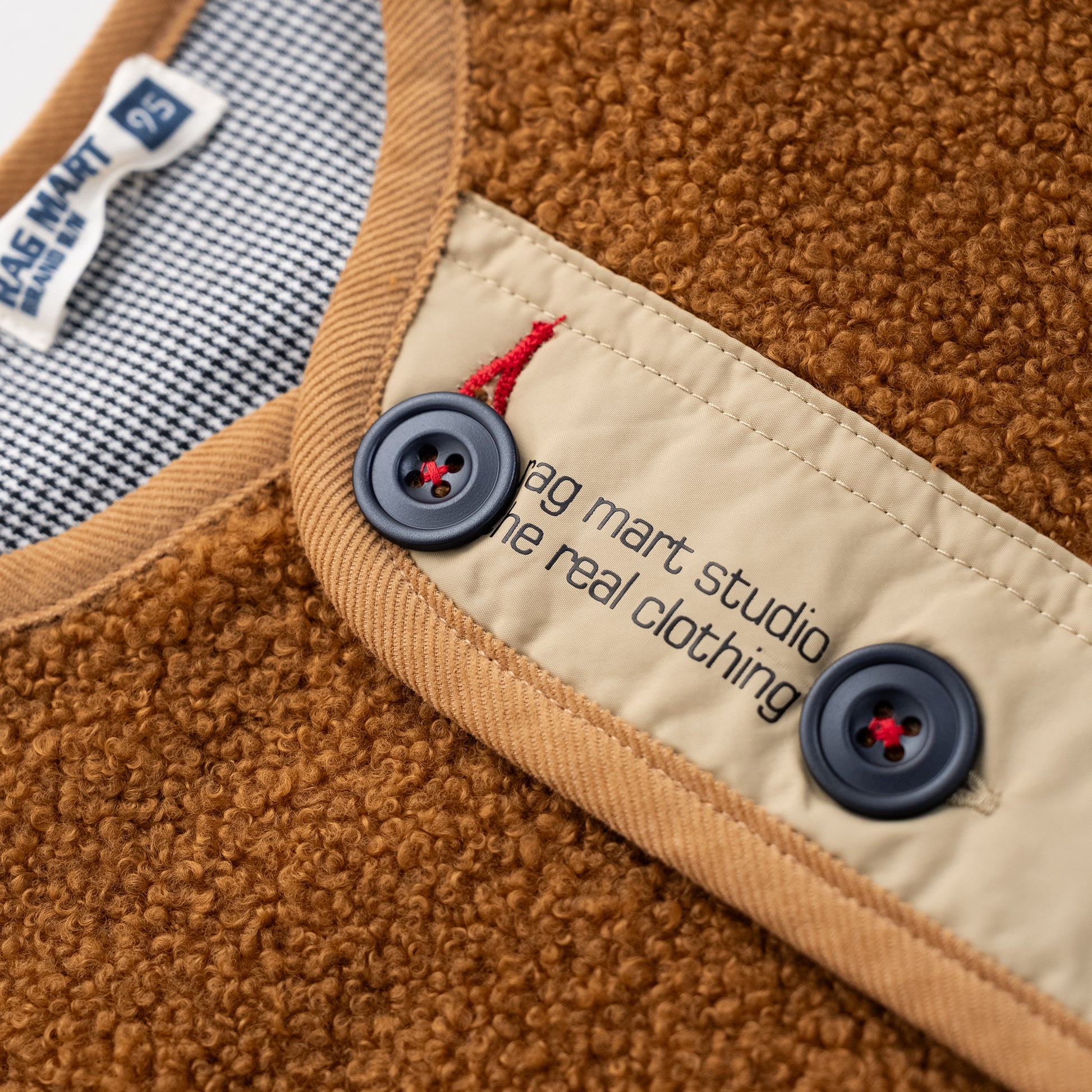 ウォーム感たっぷりなボア素材のカーディガンは、パイピングや前立てのデザインがアクセントに。もこもことしたボアは程よい厚みがあり、本格的なアウターを着るまでの羽織として活躍します。どちらのカラーもユニセックスに使っていただけます。
