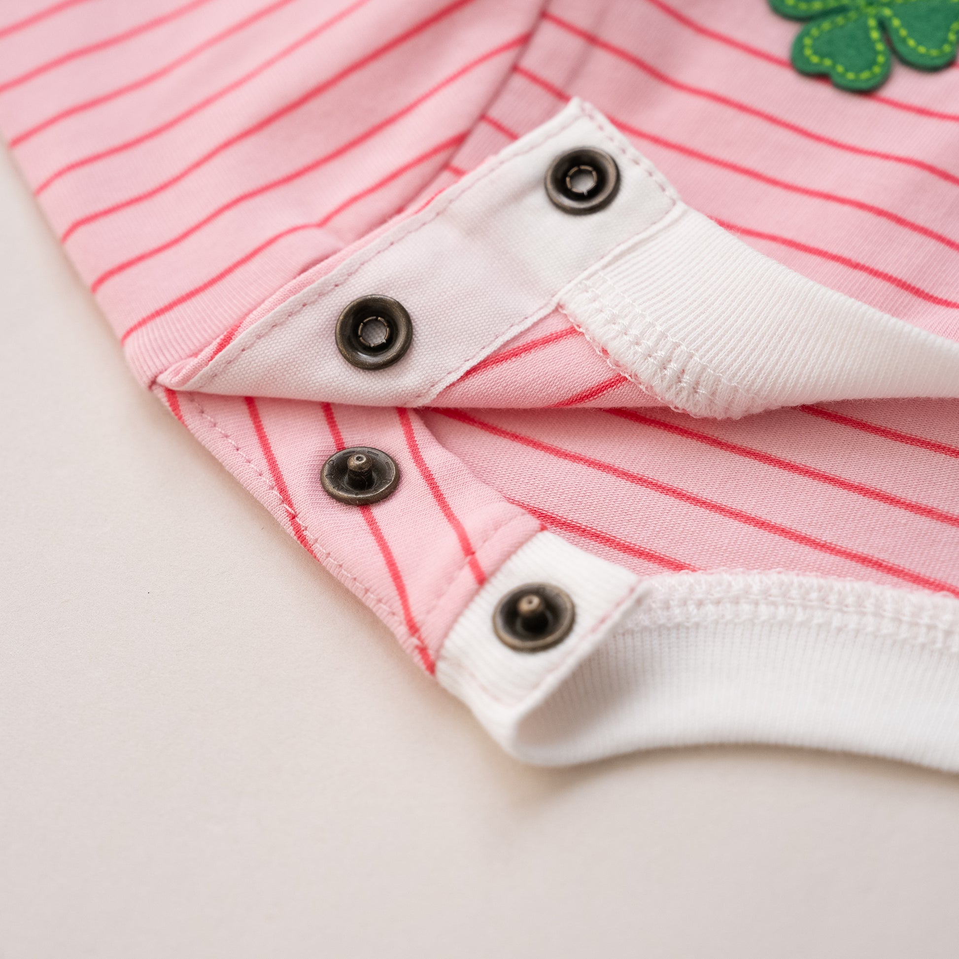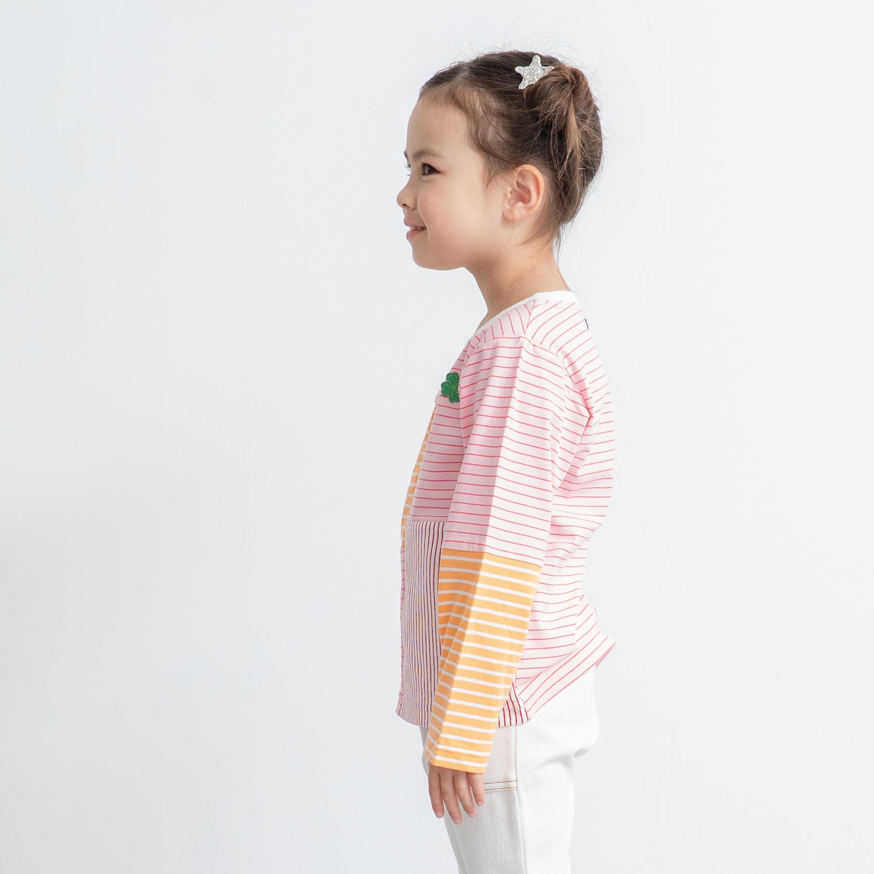 ボーダー生地の切り替えが楽しいポップなTシャツは、胸元のクローバーのワッペンがポイント。天竺素材で着心地良く、ロングシーズン活躍します。