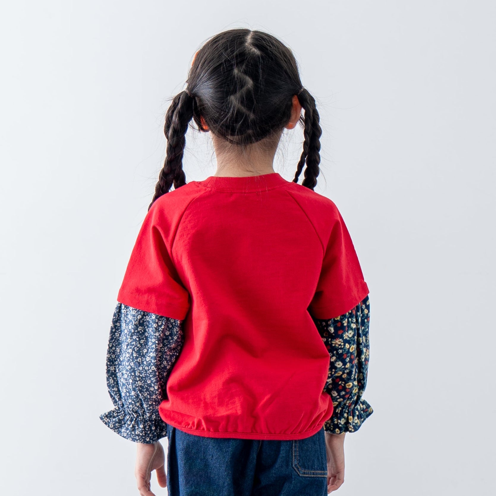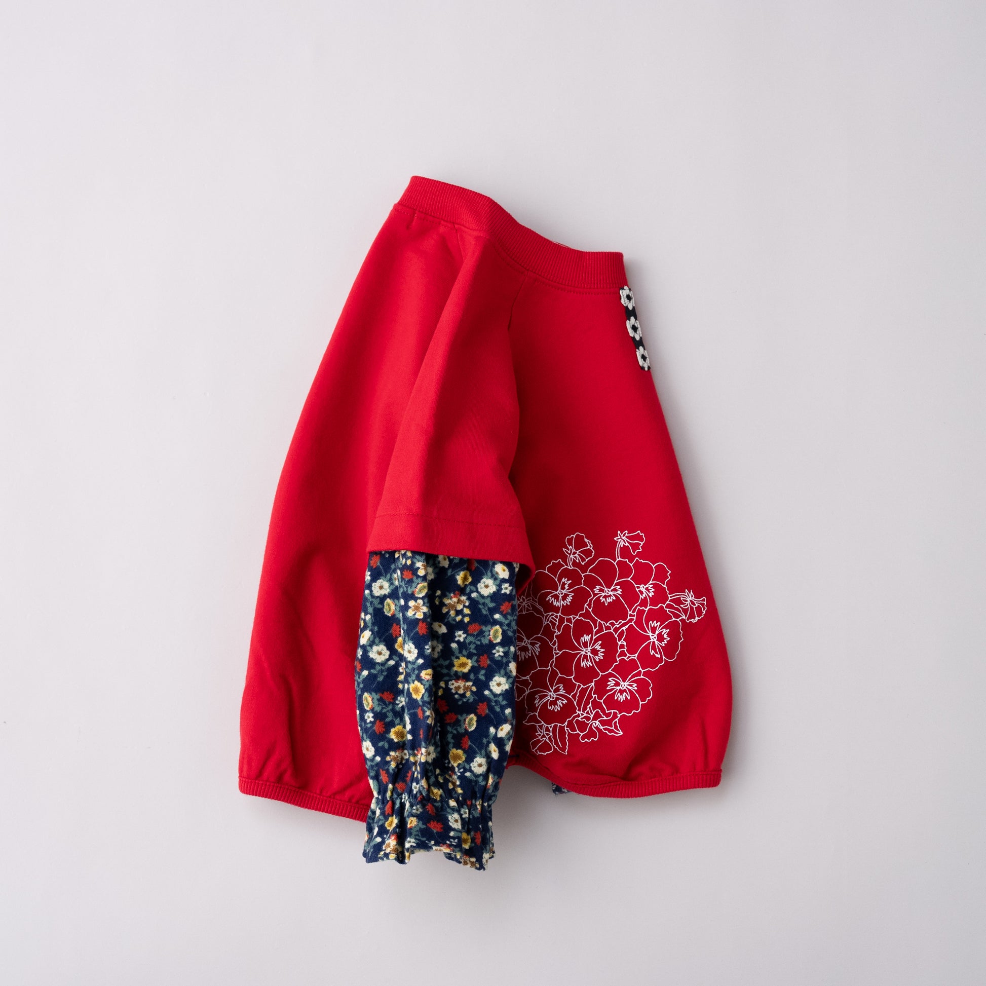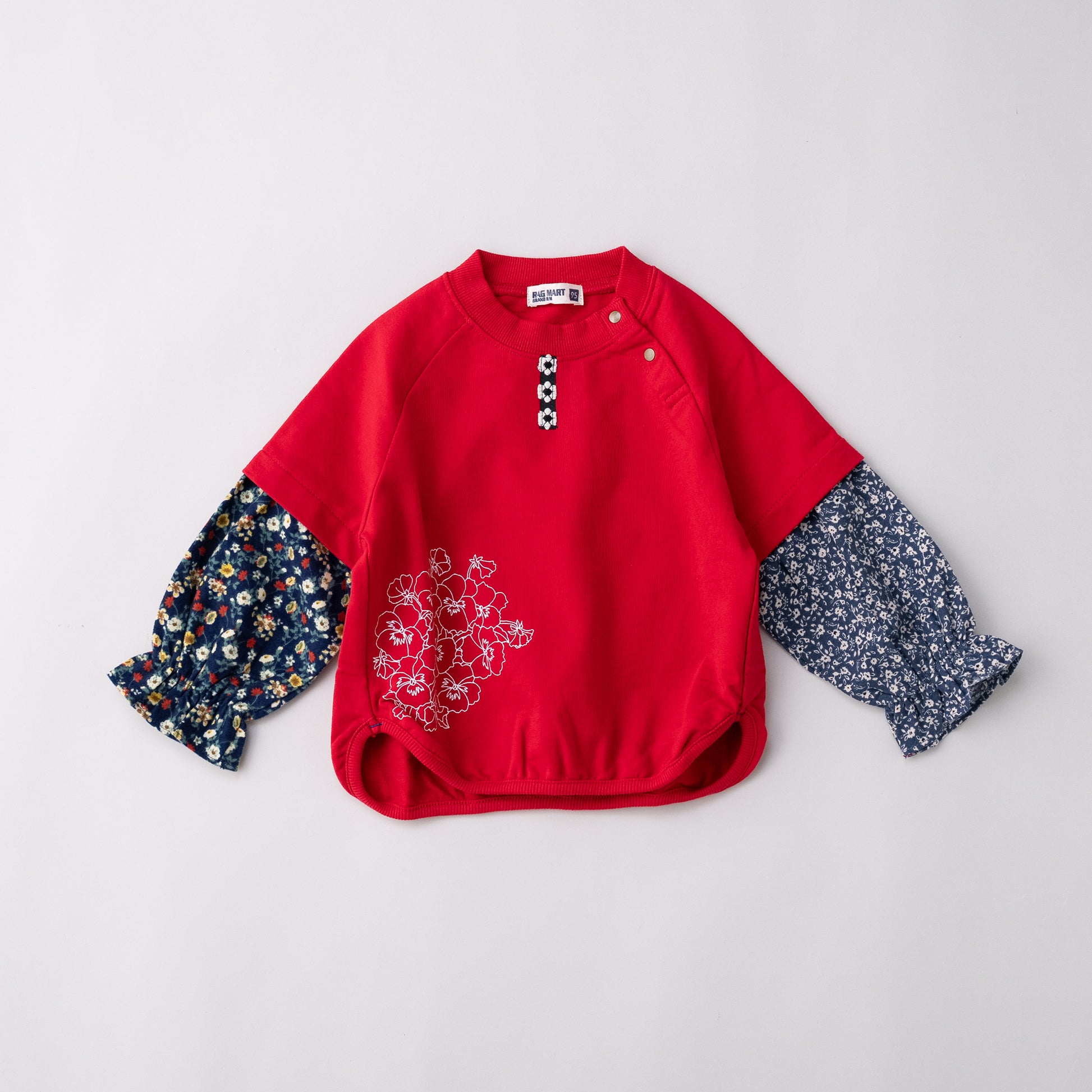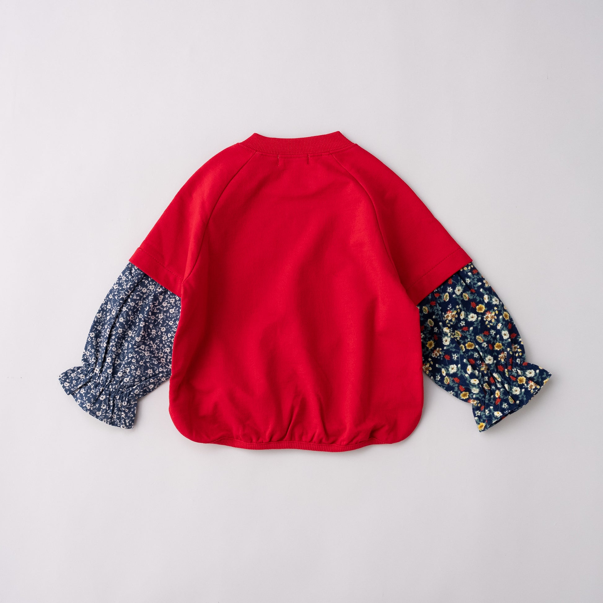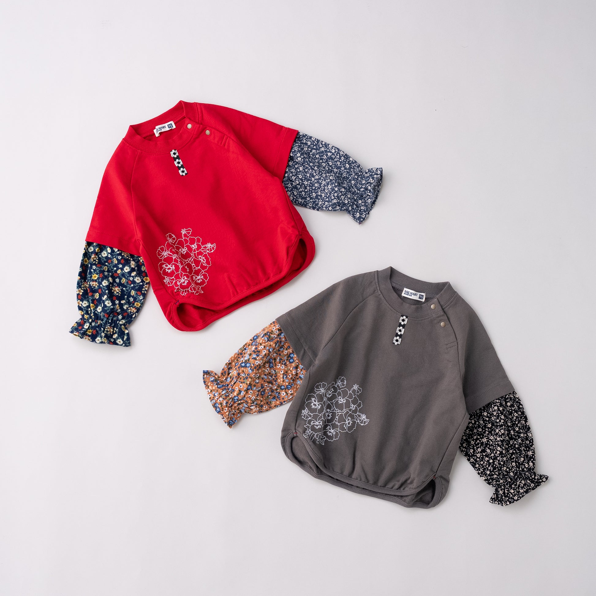 お袖がブラウスを重ね着したようなリメイクデザインのトレーナー。丸みのある裾シルエットや袖の柄も左右違うところもポイント。シンプルなボトムとのカジュアルコーデがオススメです。