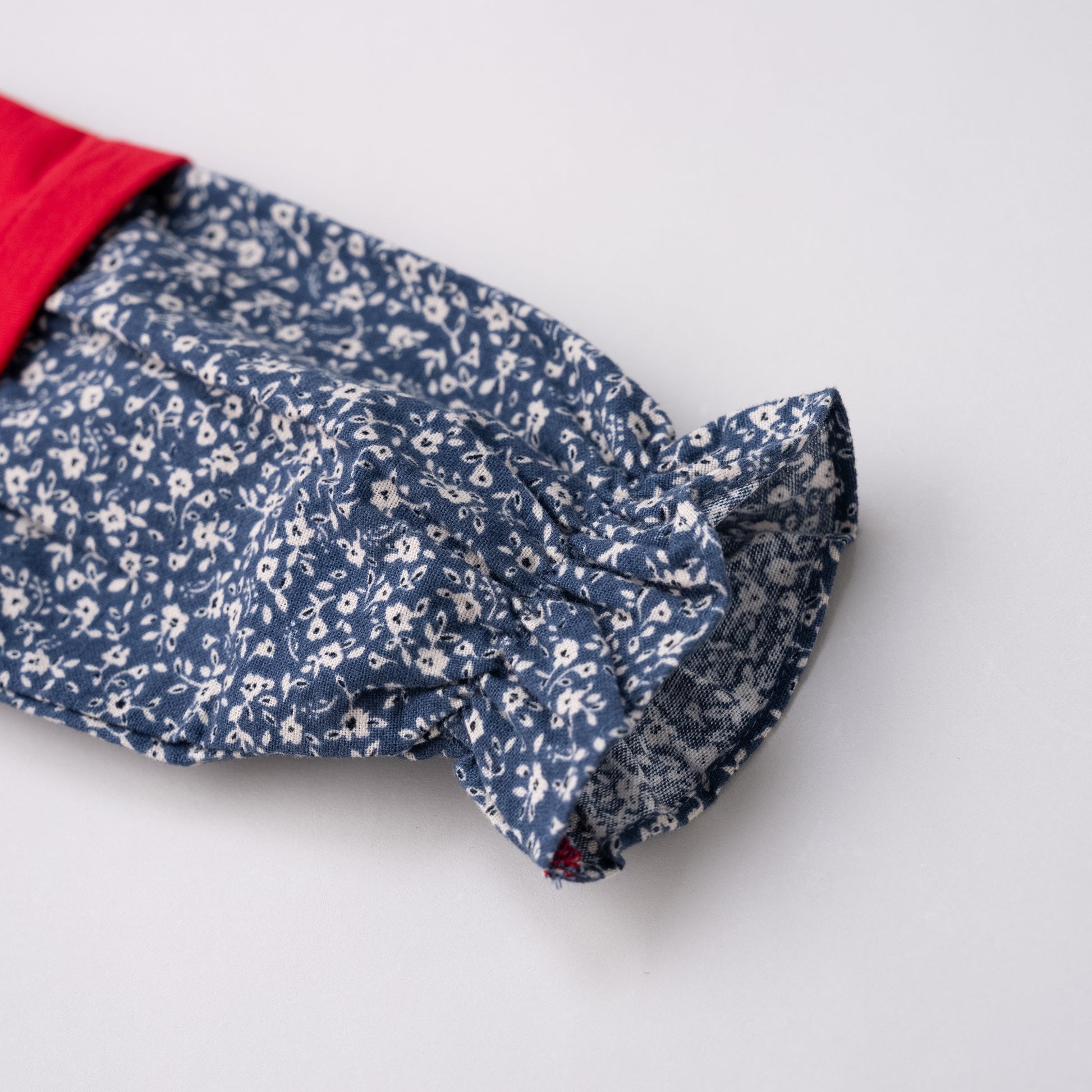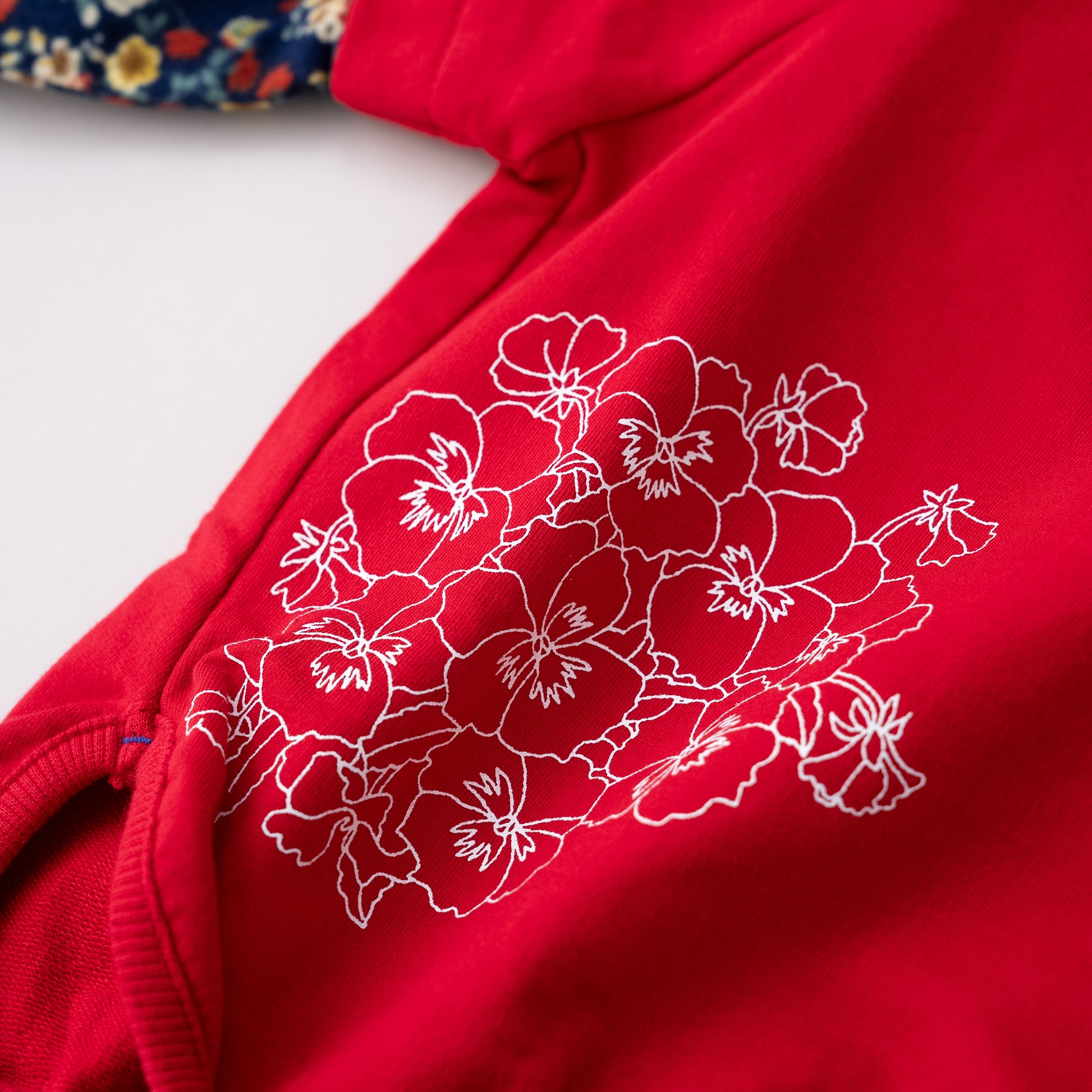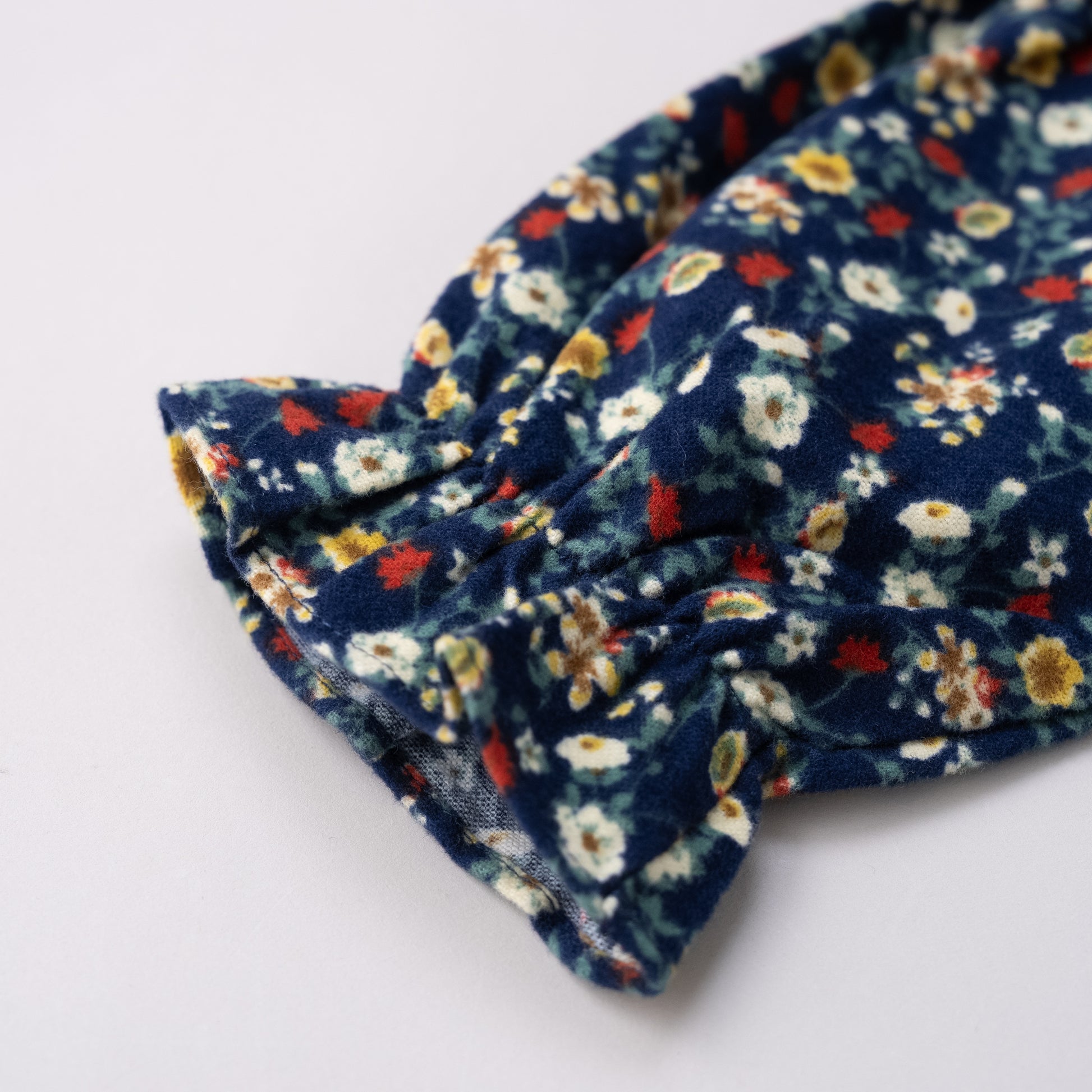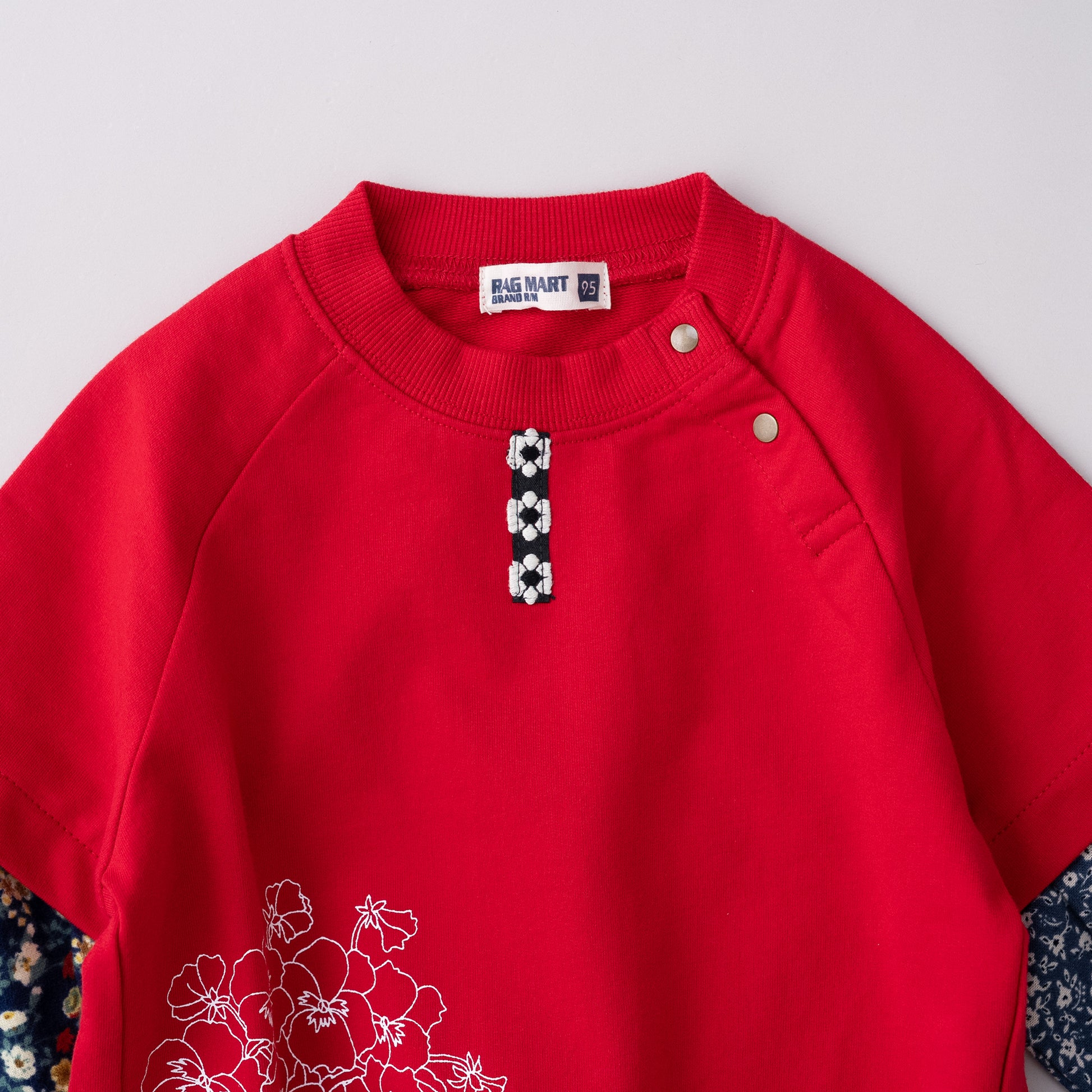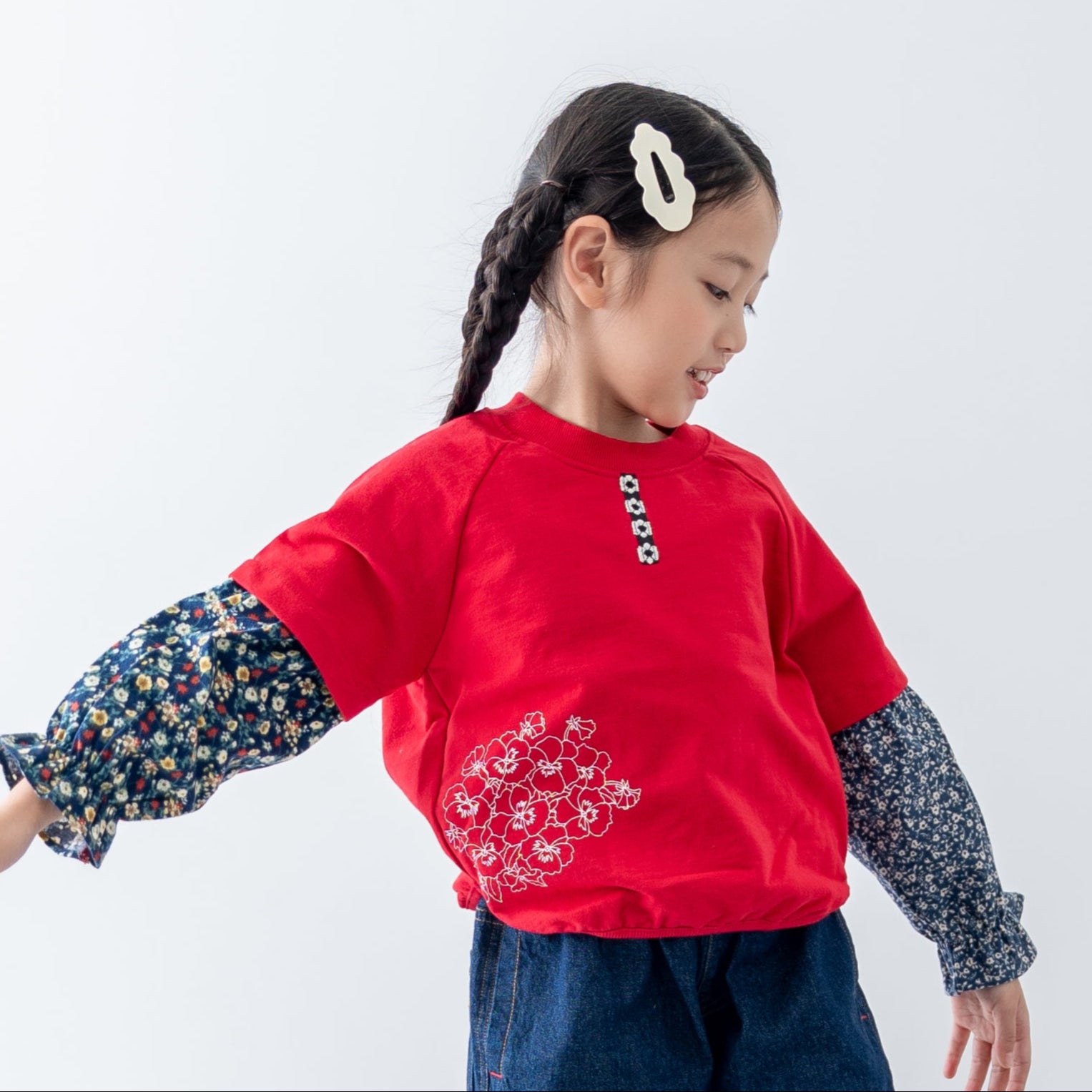 お袖がブラウスを重ね着したようなリメイクデザインのトレーナー。丸みのある裾シルエットや袖の柄も左右違うところもポイント。シンプルなボトムとのカジュアルコーデがオススメです。
