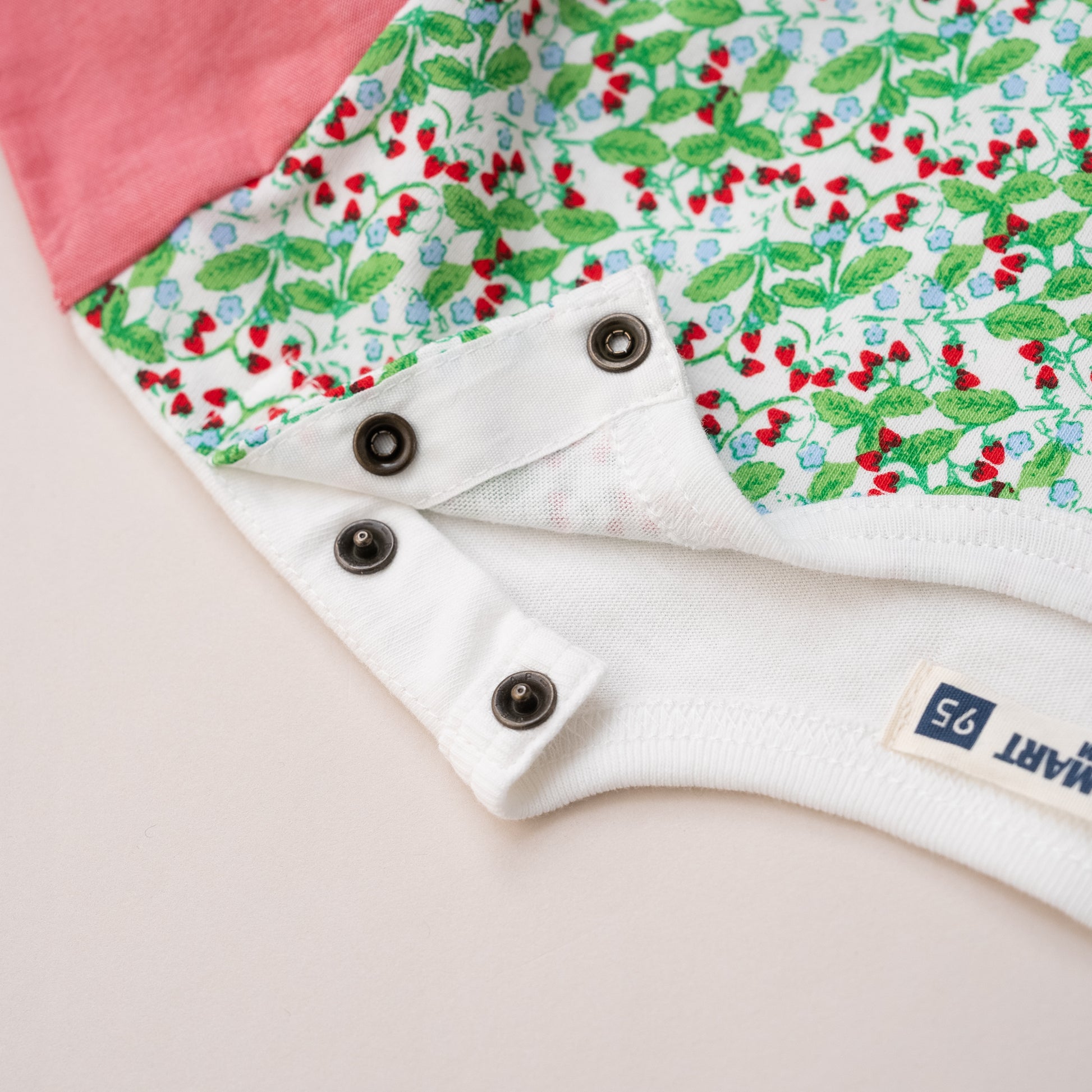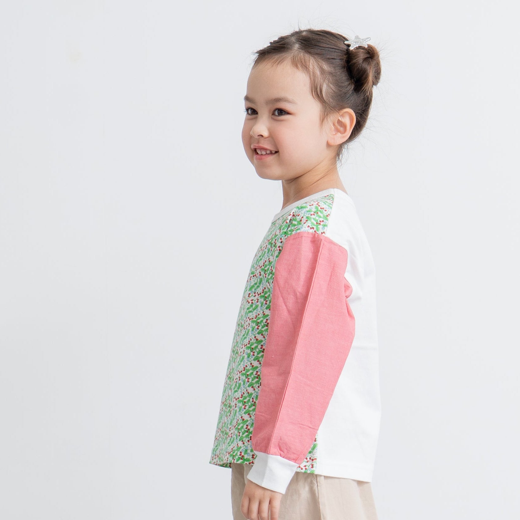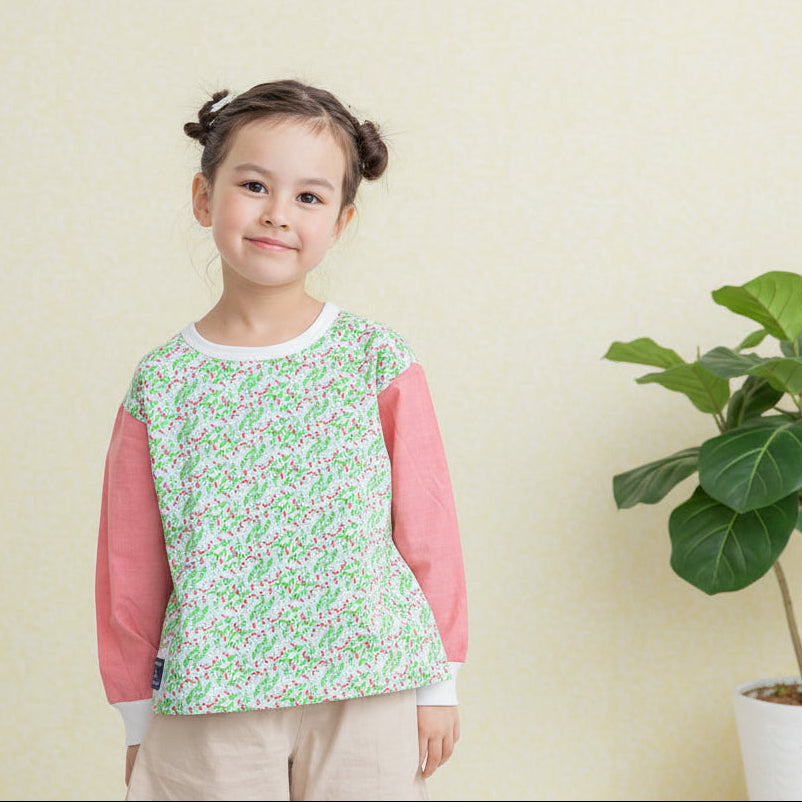 お袖素材の切り替えが可愛い、わくわくする春らしい総柄Tシャツ。同柄のベビーカバーオールがあり、兄弟姉妹でお揃いを楽しんでいただけます。