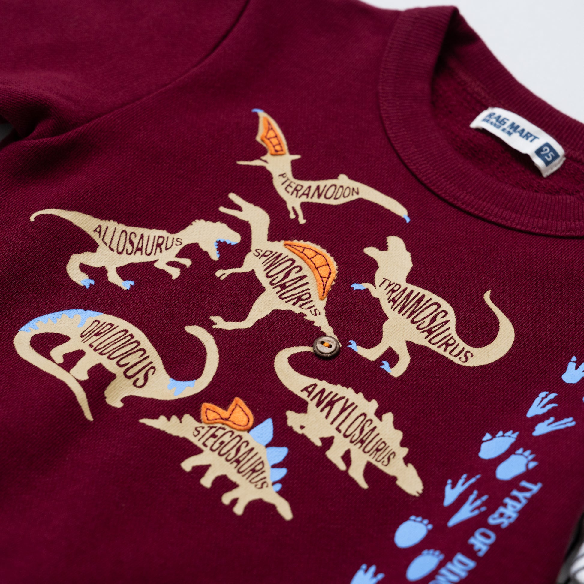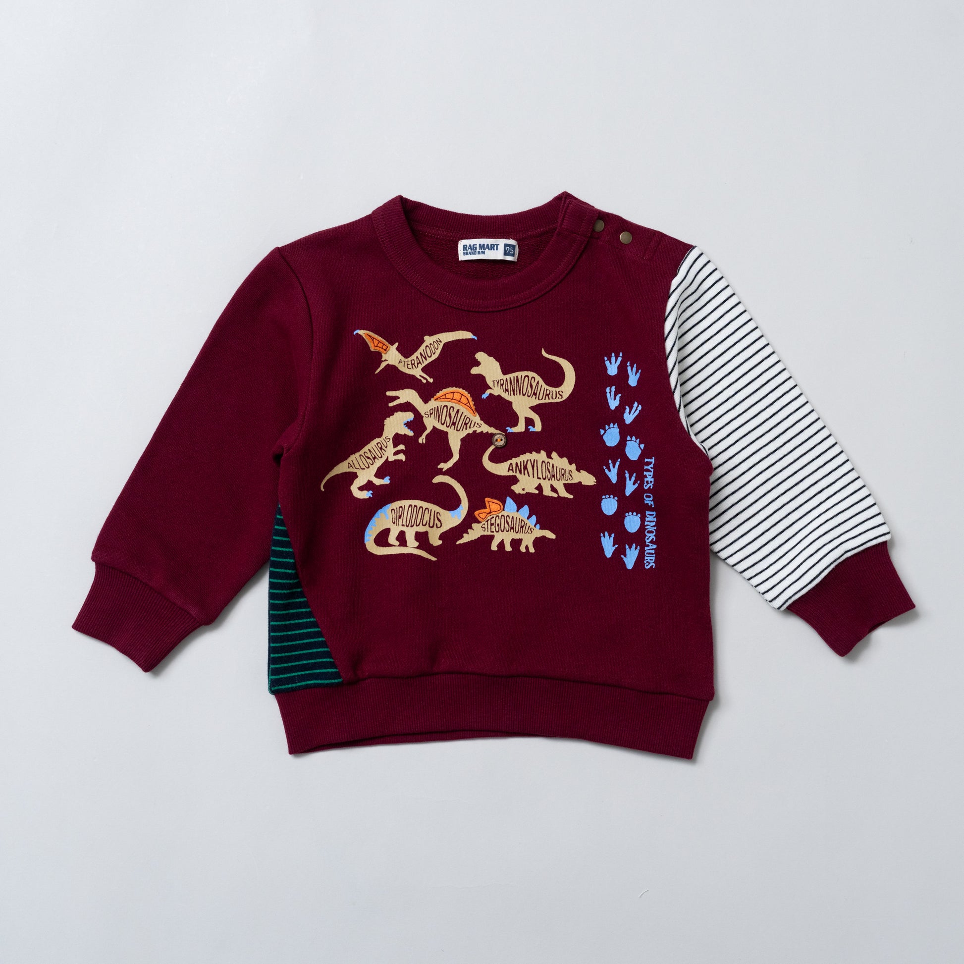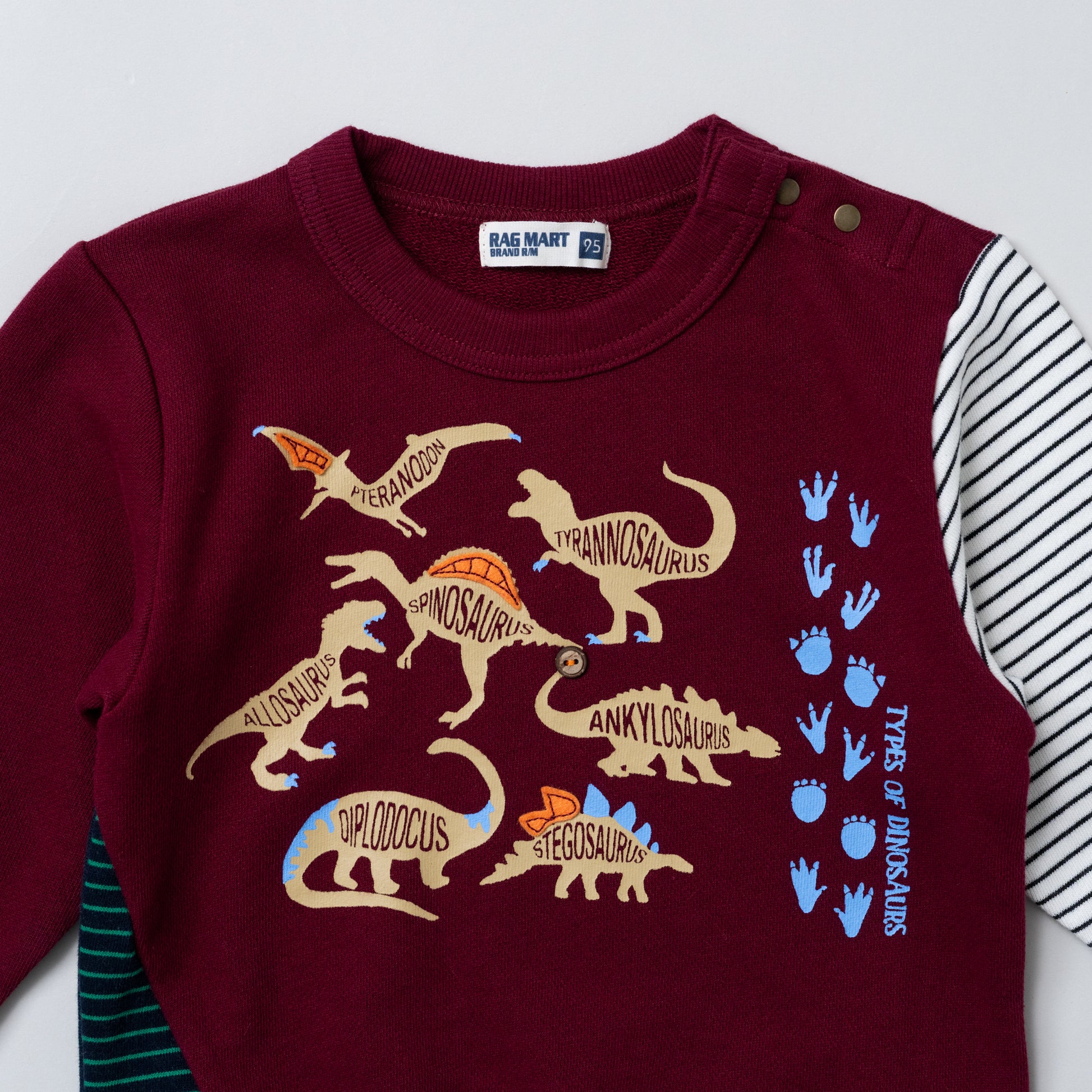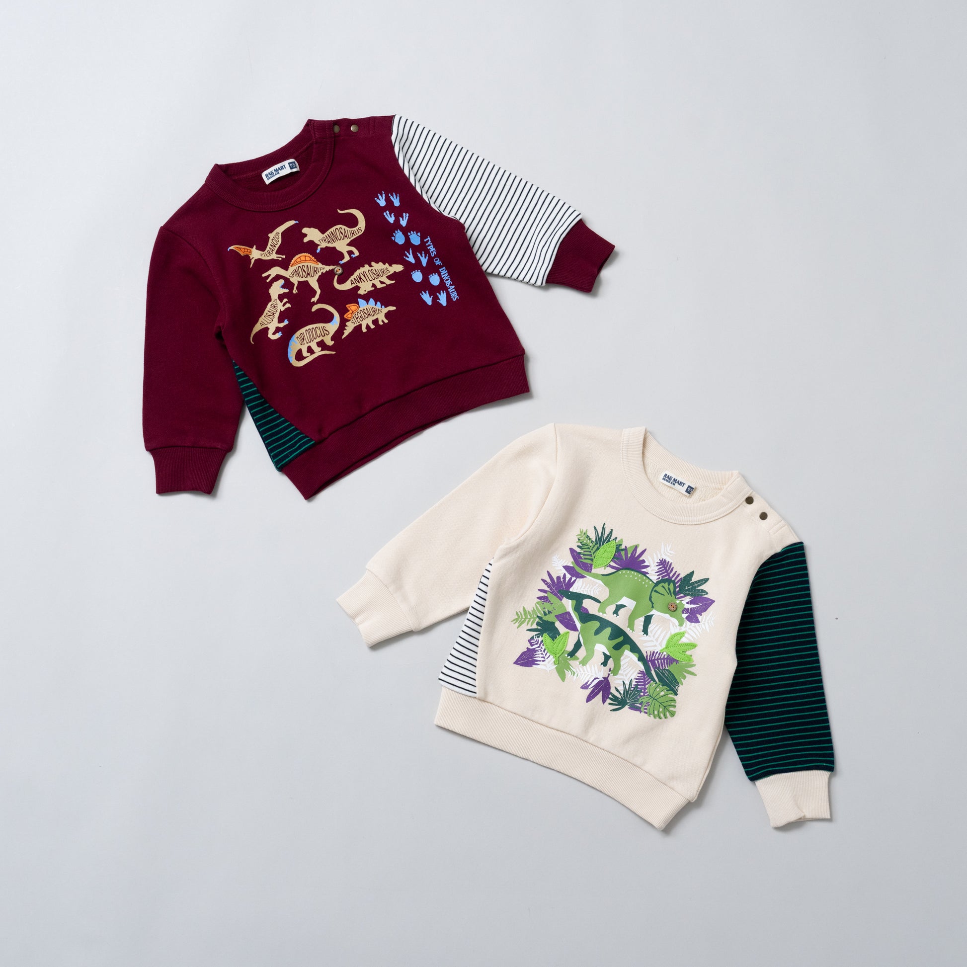 男の子が大好きな、恐竜をモチーフにしたトレーナー。袖の切り替えも楽しい1枚。裏毛素材のトレーナーは春先まで大活躍します。