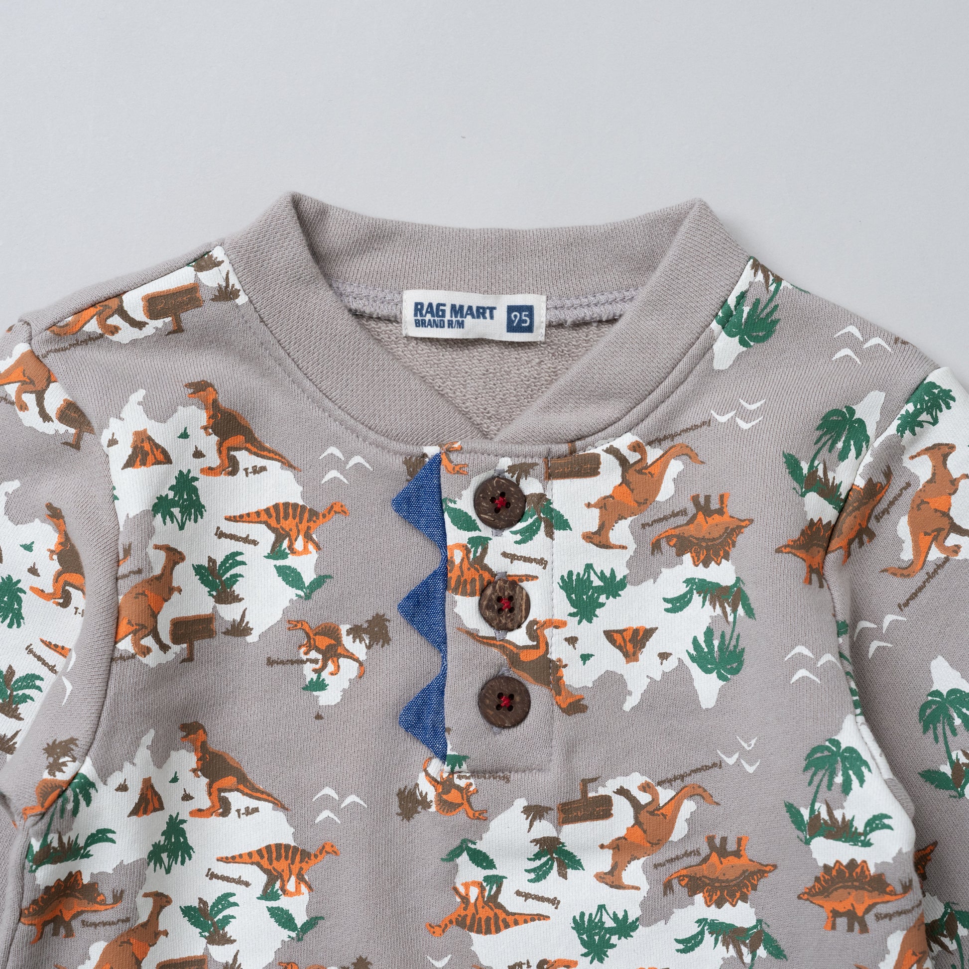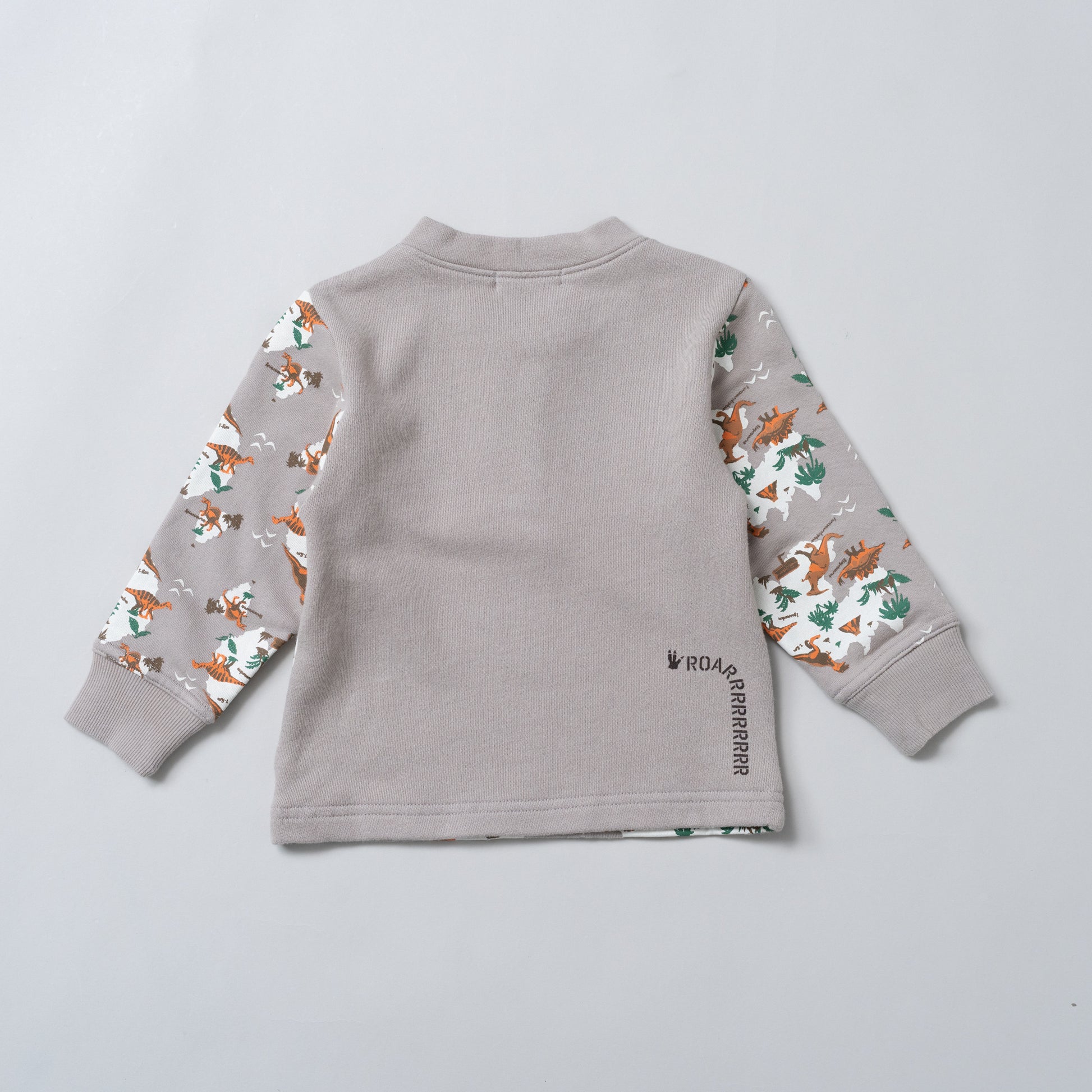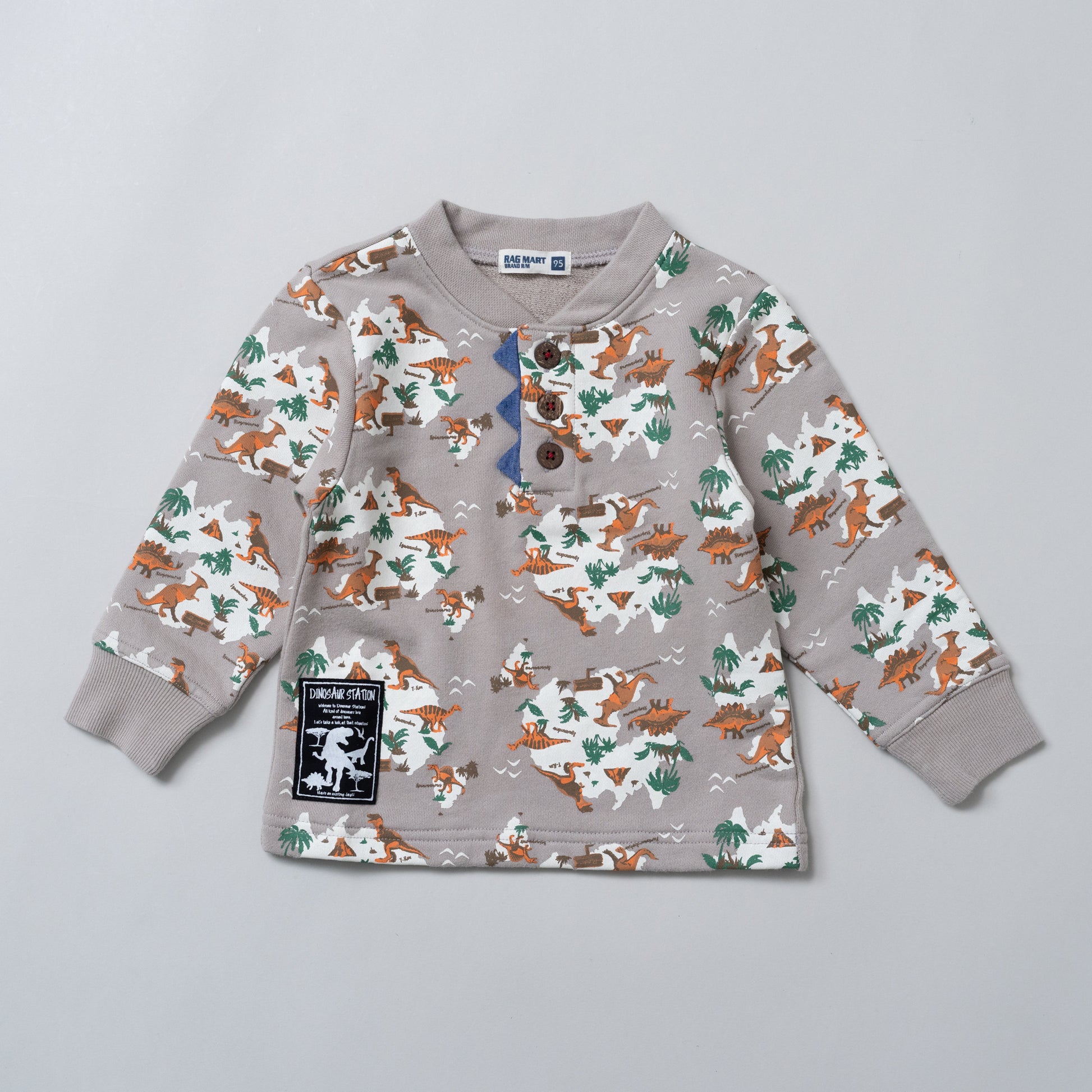 恐竜の総柄プリントが印象的な裏毛トレーナーは、ヘンリーネックのボタン部分にアクセントのあるデザインです。裏毛素材のトレーナーは春先まで大活躍します。