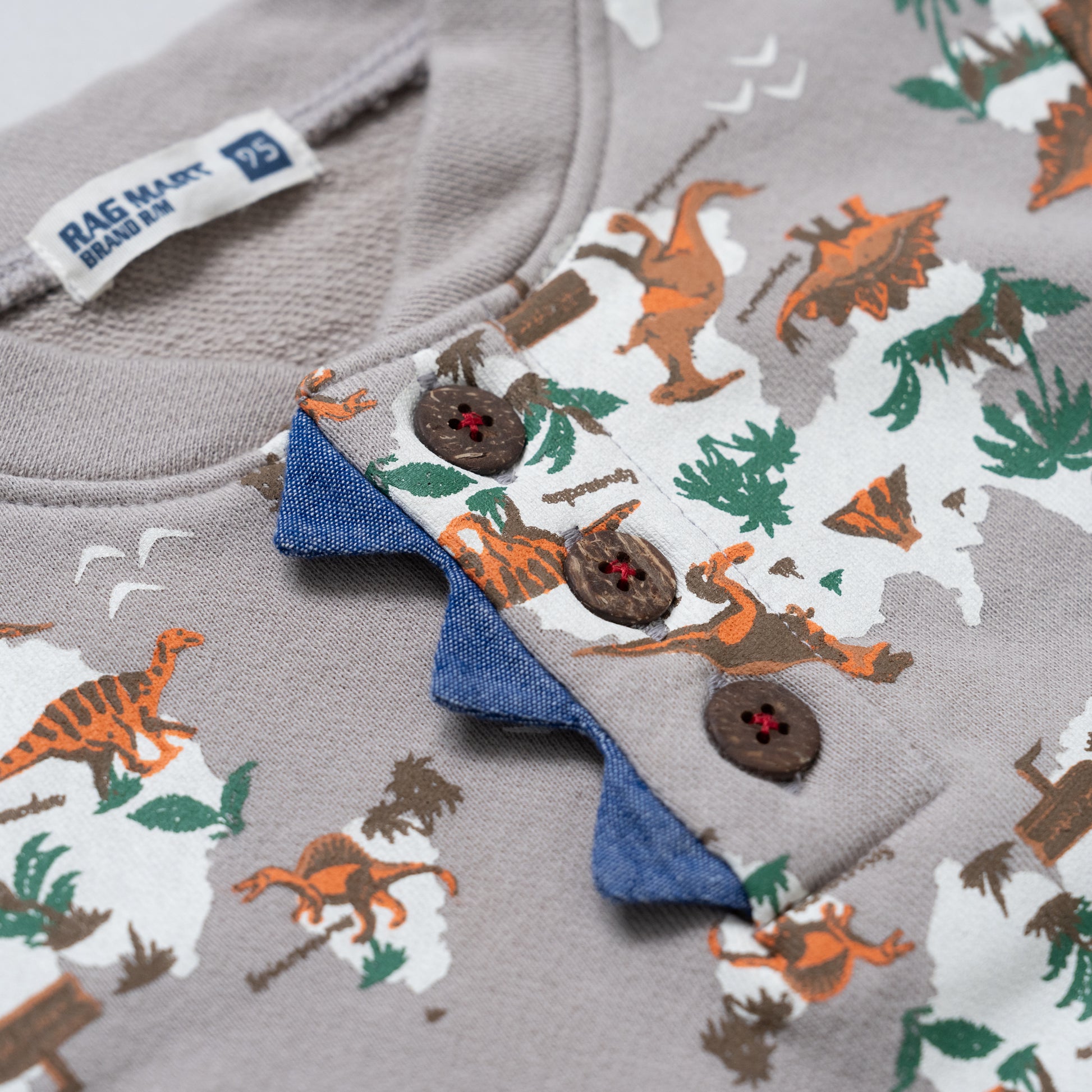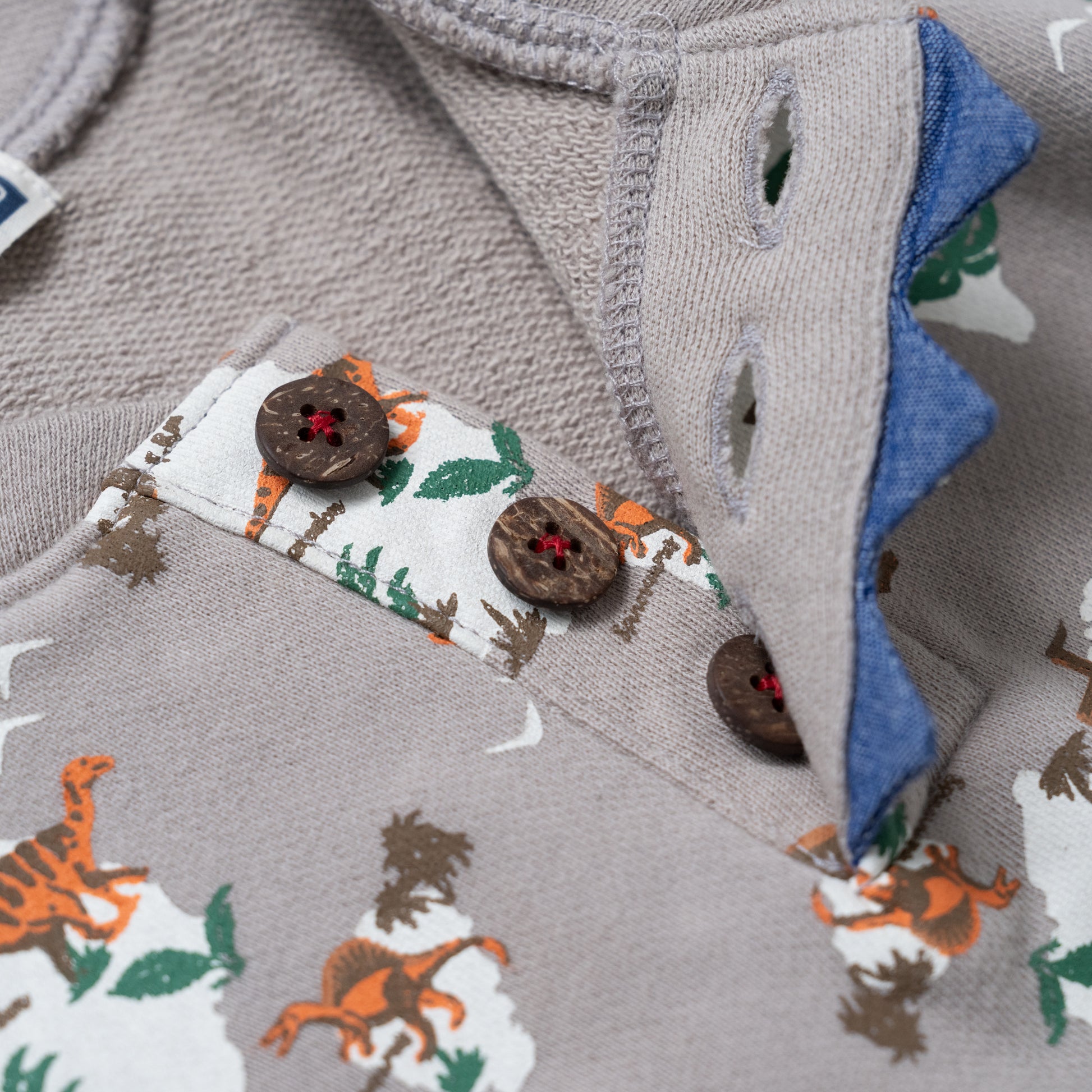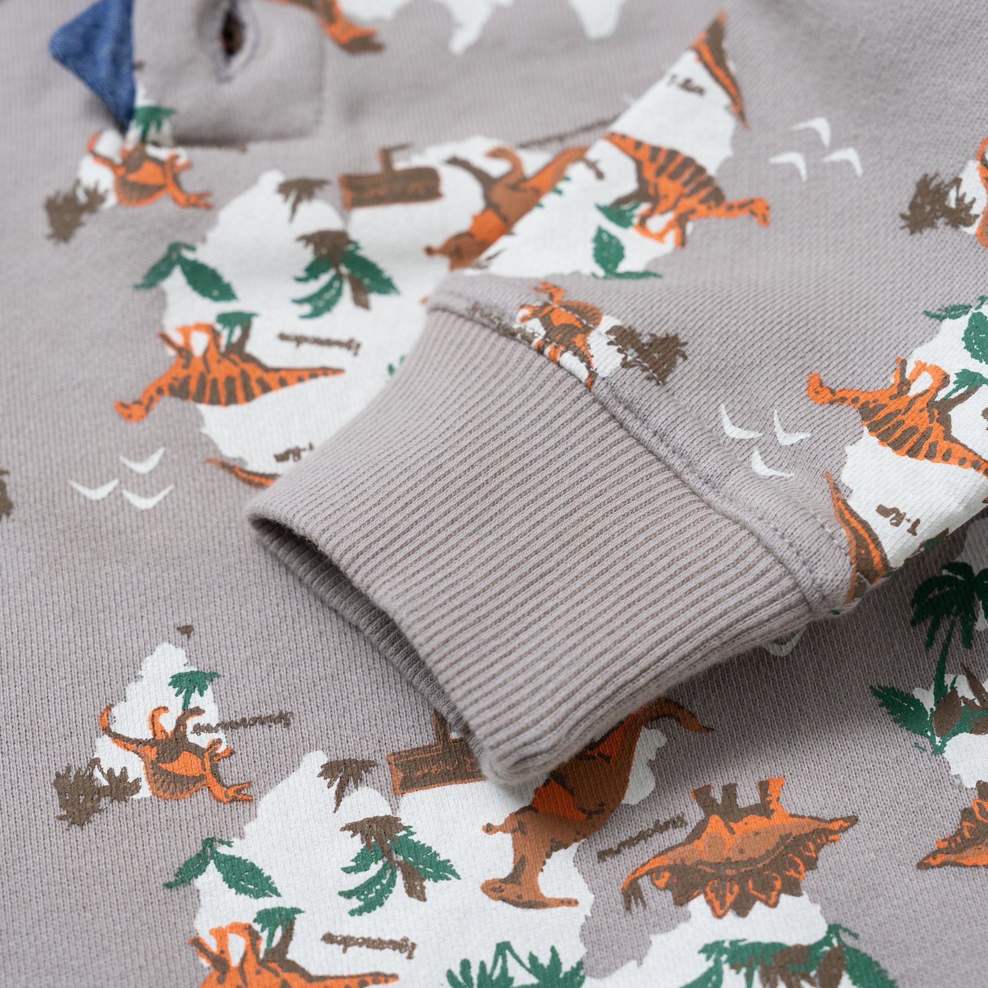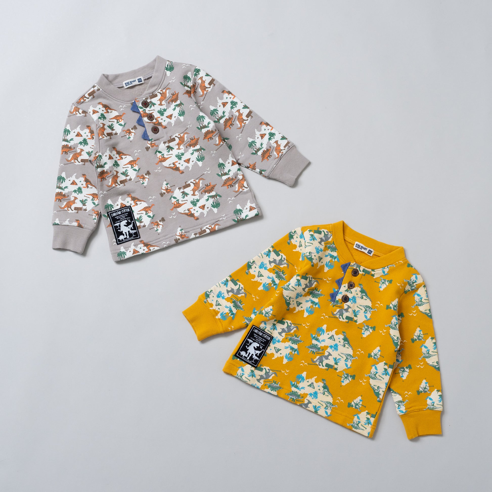 恐竜の総柄プリントが印象的な裏毛トレーナーは、ヘンリーネックのボタン部分にアクセントのあるデザインです。裏毛素材のトレーナーは春先まで大活躍します。