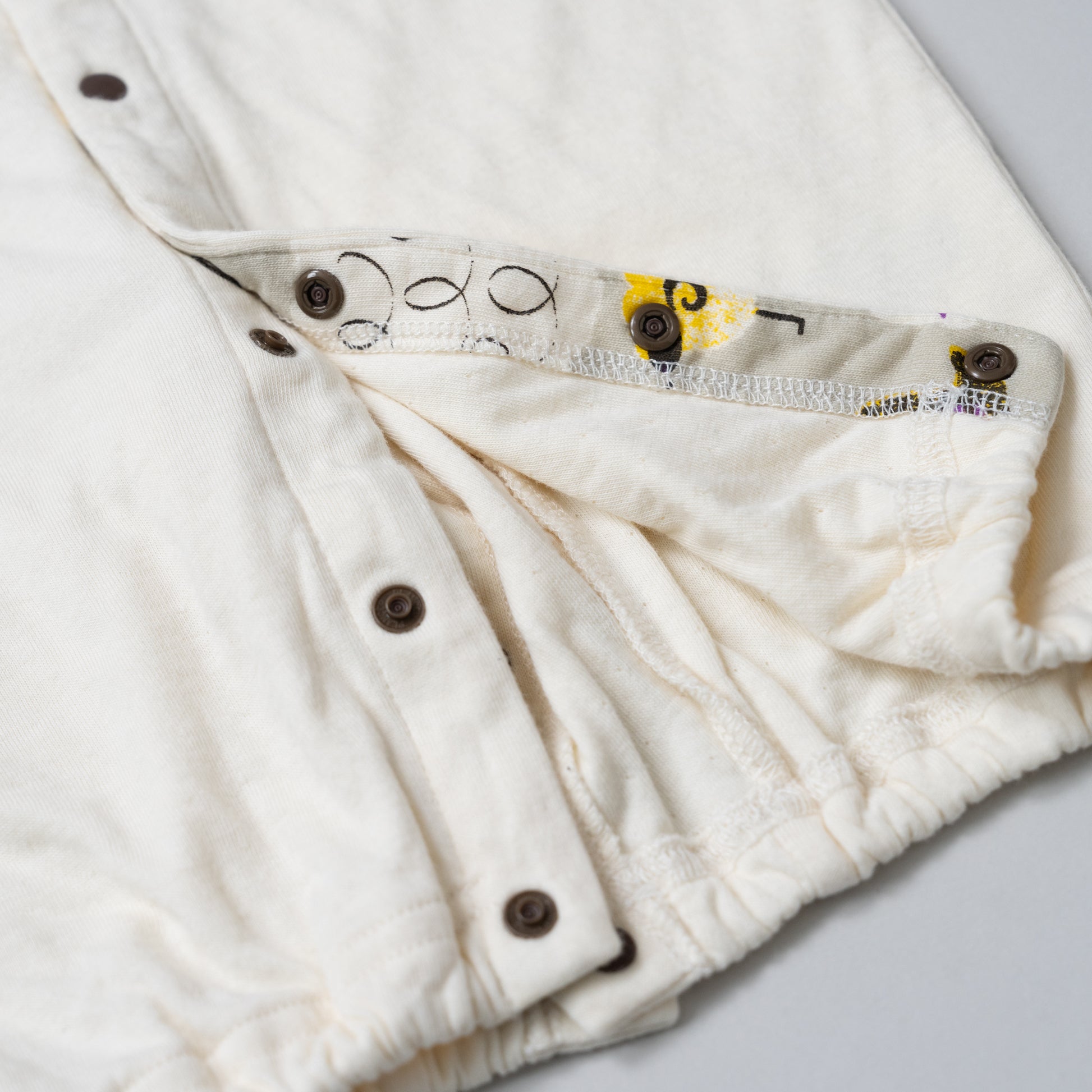 肌触りのよい接結天竺素材を使用したベビー2wayオール。印象的な総柄が赤ちゃんの可愛さを引き立ててくれます。ボタンの留め方を変えればカバーオールとしても楽しめる2way仕様。出産ギフトにもオススメです。