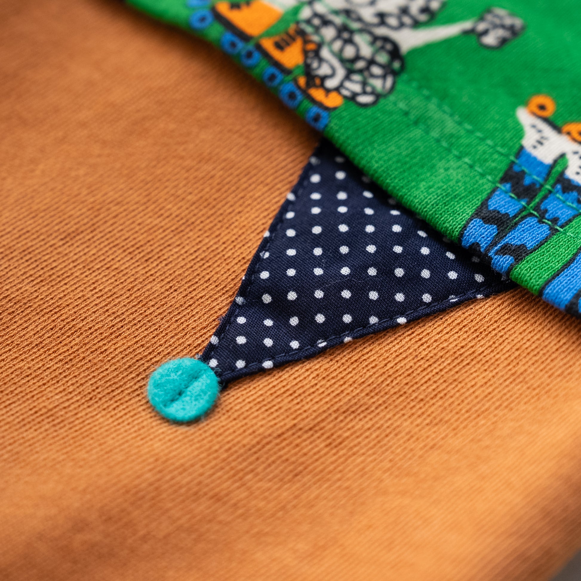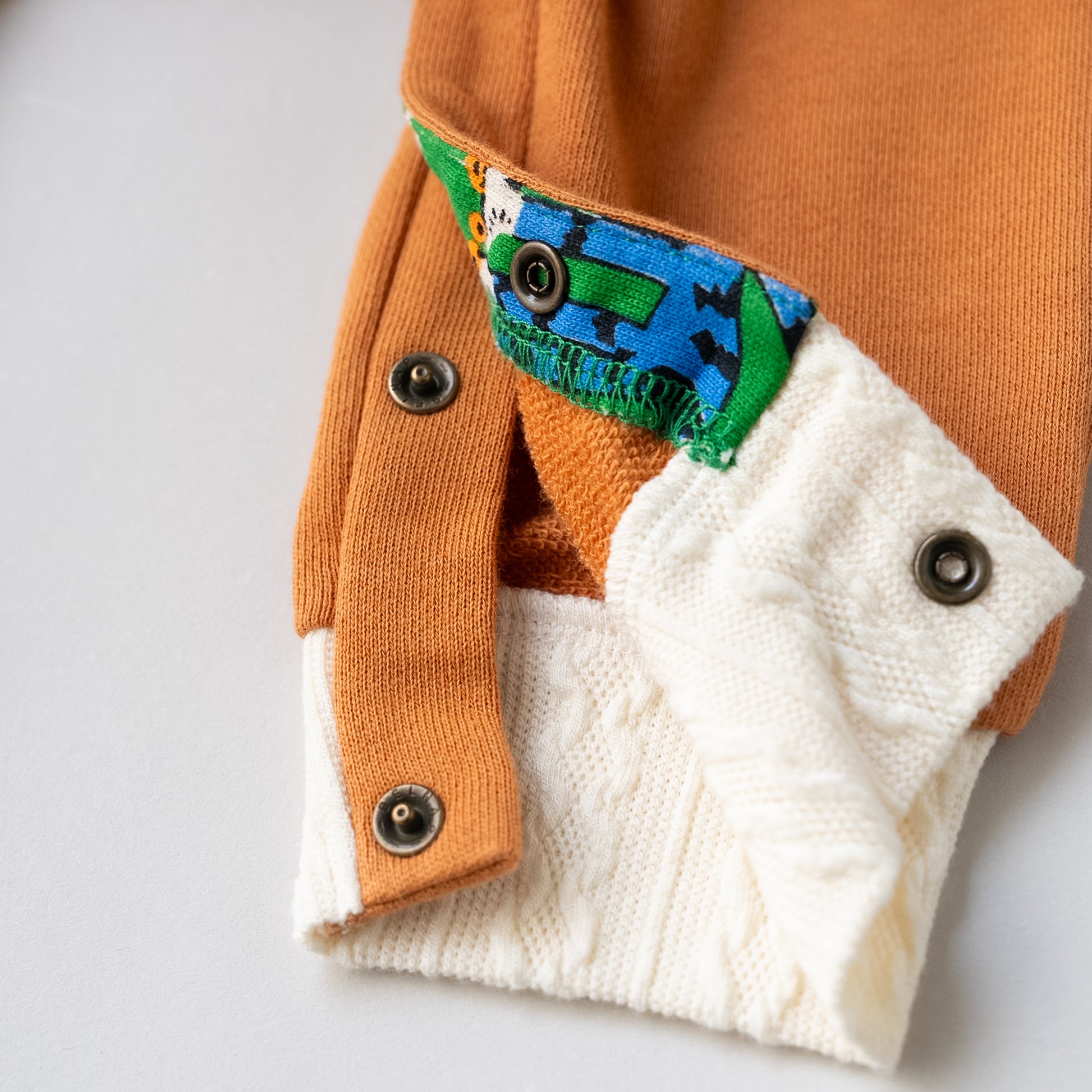カバーオール:本体:綿100% テレコスパン(襟回り):綿95% ポリウレタン5% ジャガード生地(裾):ポリエステル66% レーヨン33%ポリウレタン1% フェルト:ポリエステル100% その他:綿100%