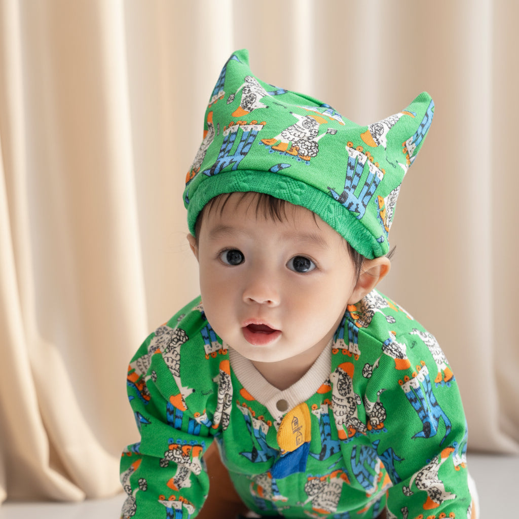 総柄プリントのカバーオールとお揃い柄のベビー帽子でキャッチーなセットアップが楽しめるセットです。赤ちゃんのこの時期にしか楽しめないポップさをぜひ。同柄シリーズでマントやベビーパンツもあります。