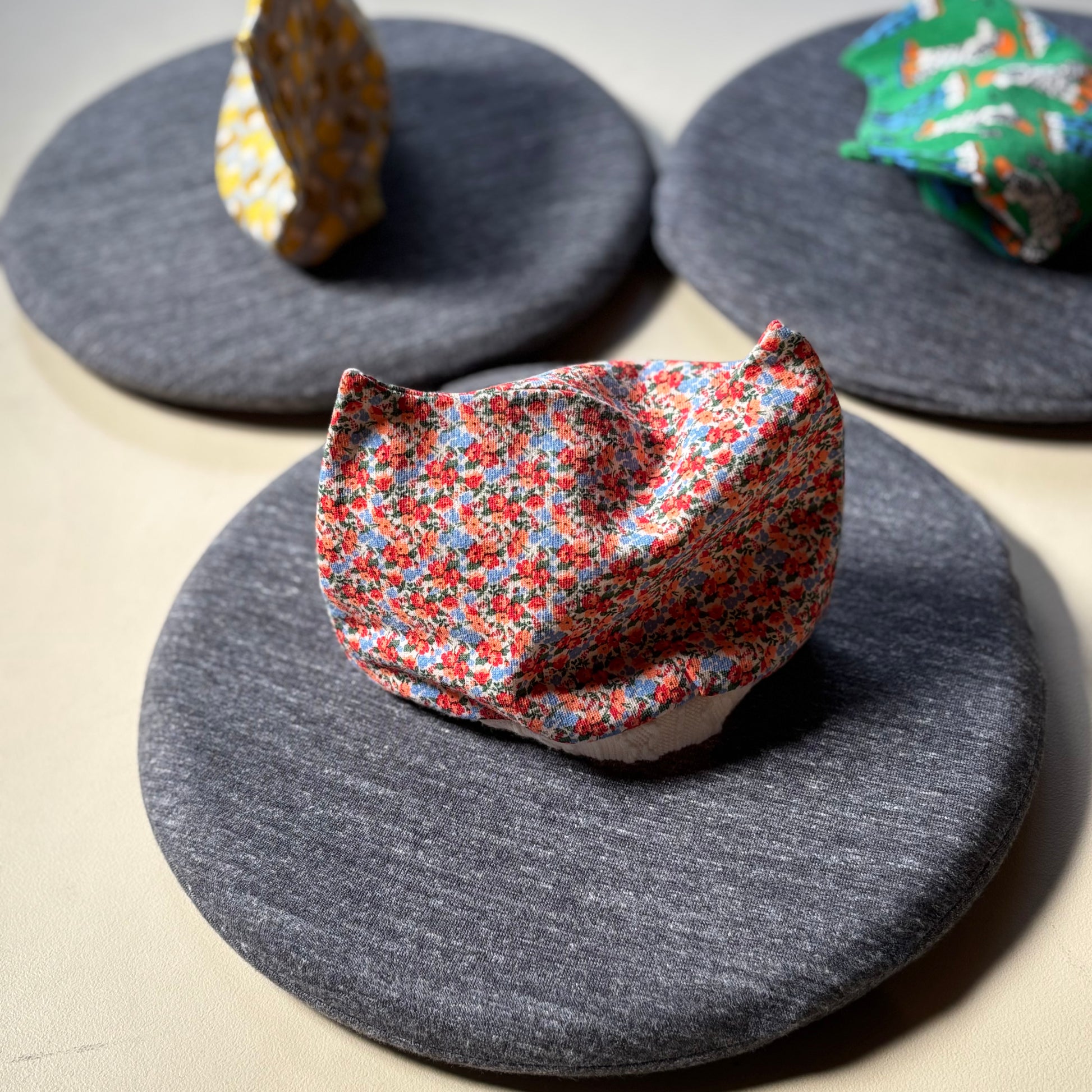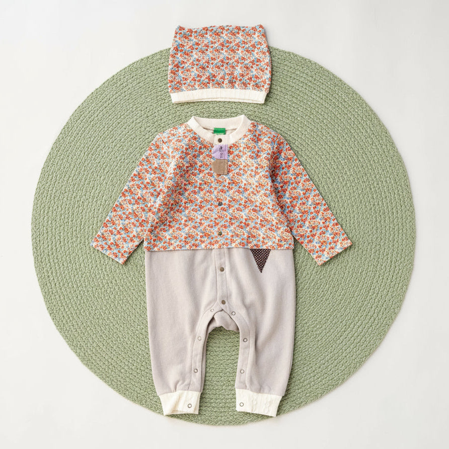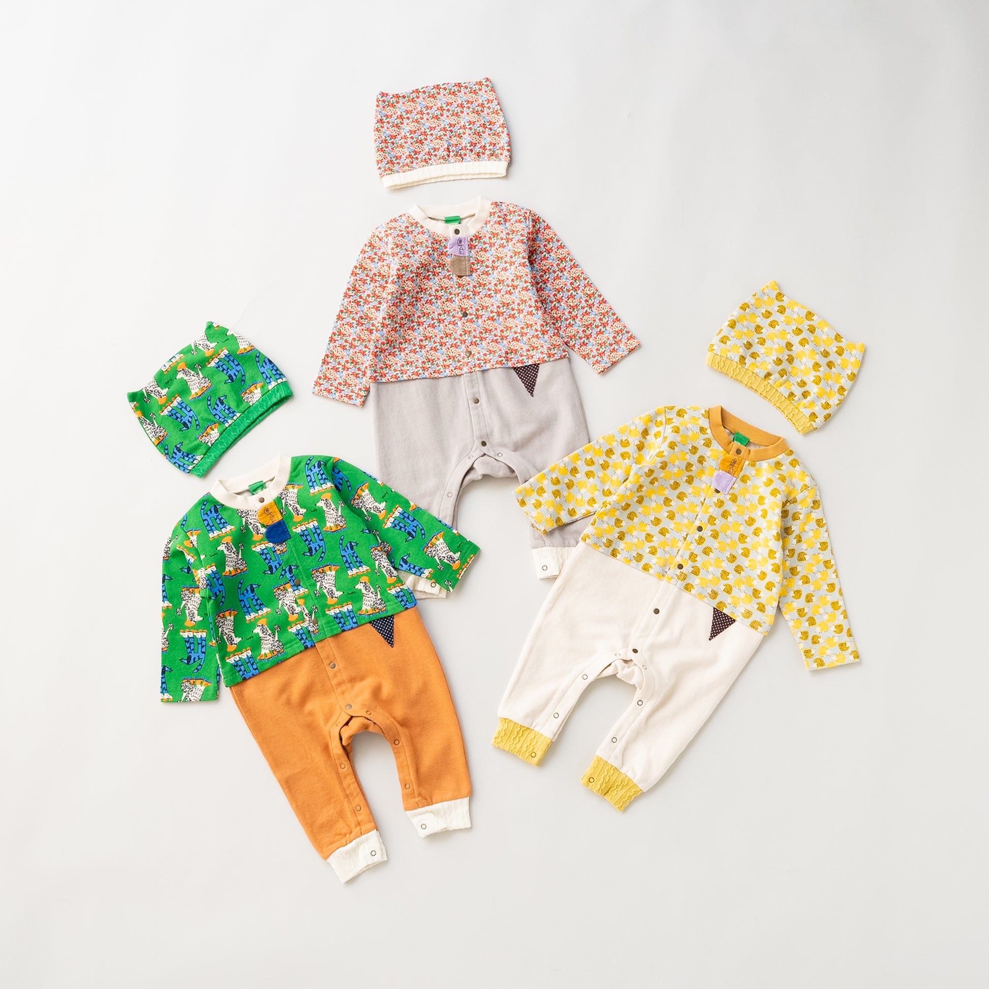 総柄プリントのカバーオールとお揃い柄のベビー帽子でキャッチーなセットアップが楽しめるセットです。赤ちゃんのこの時期にしか楽しめないポップさをぜひ。同柄シリーズでマントやベビーパンツもあります。