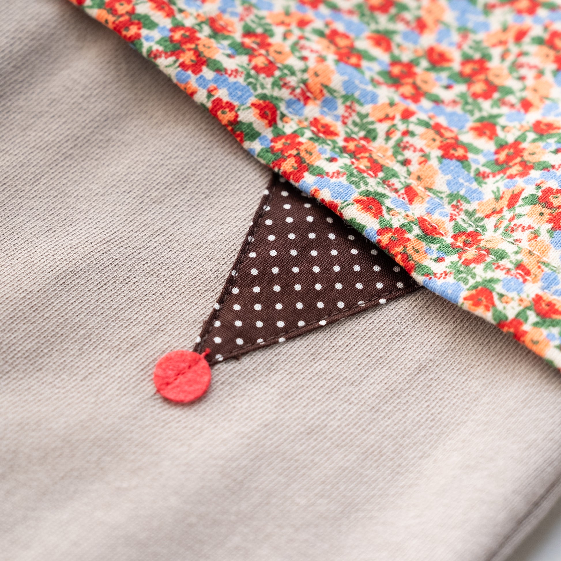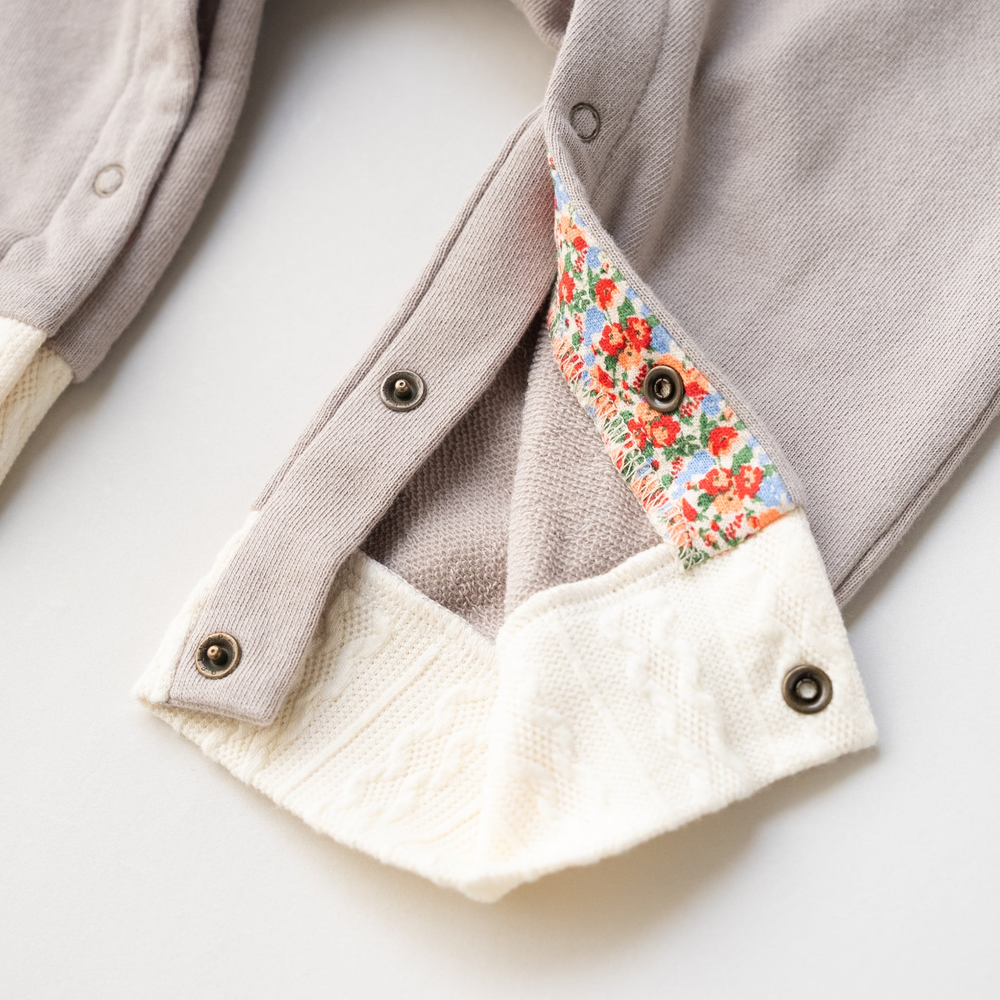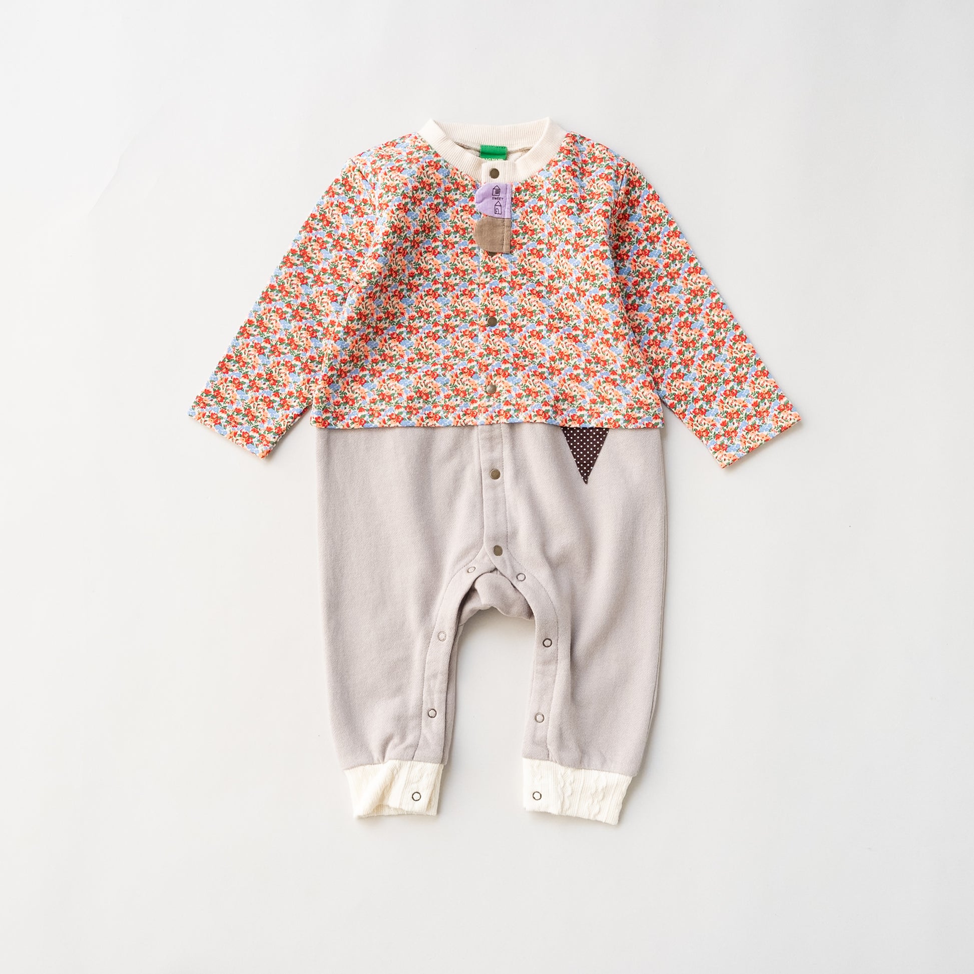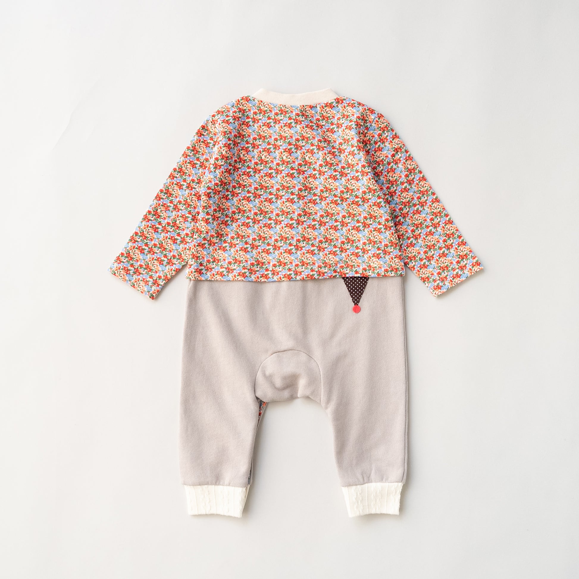 カバーオール:本体:綿100% テレコスパン(襟回り):綿95% ポリウレタン5% ジャガード生地(裾):ポリエステル66% レーヨン33%ポリウレタン1% フェルト:ポリエステル100% その他:綿100%