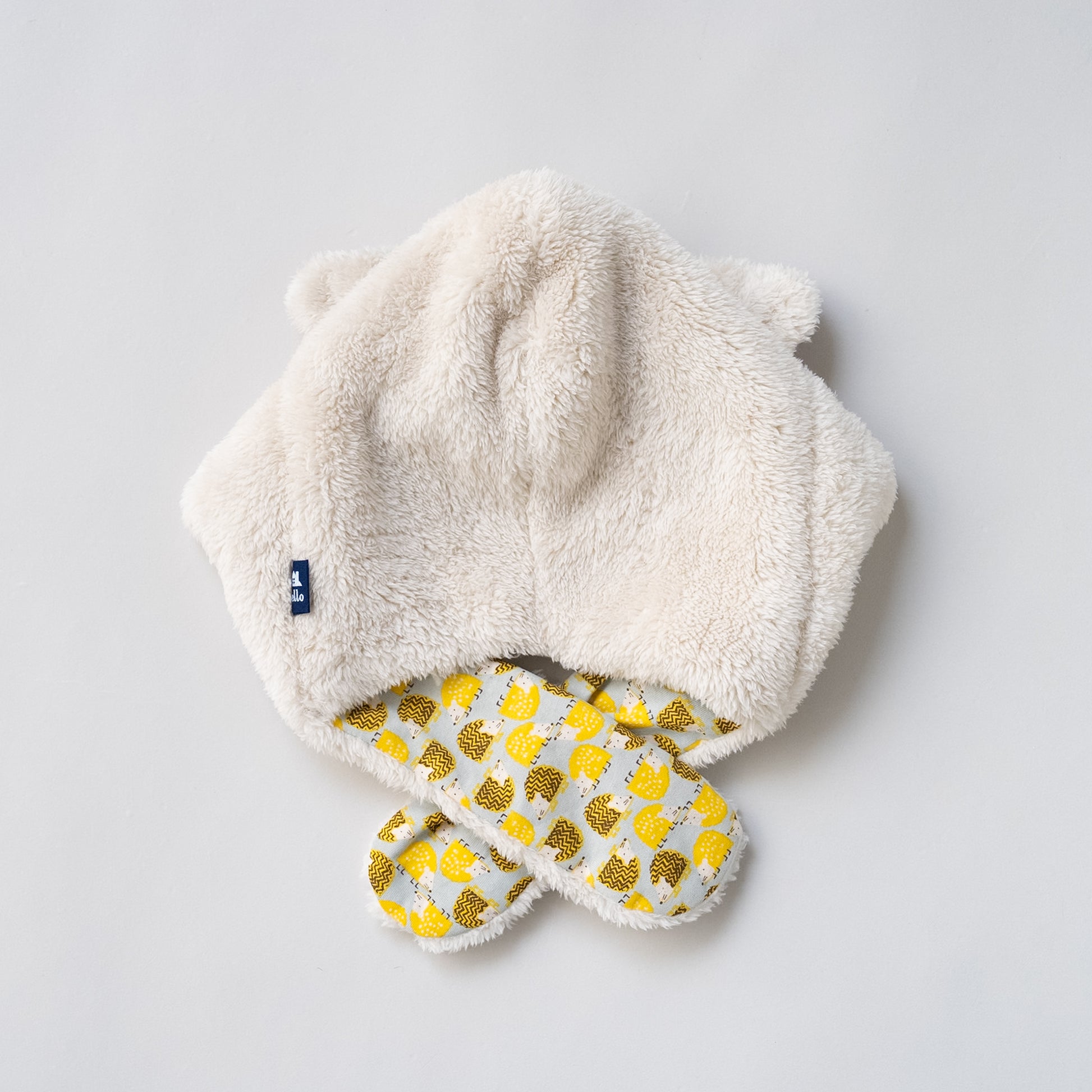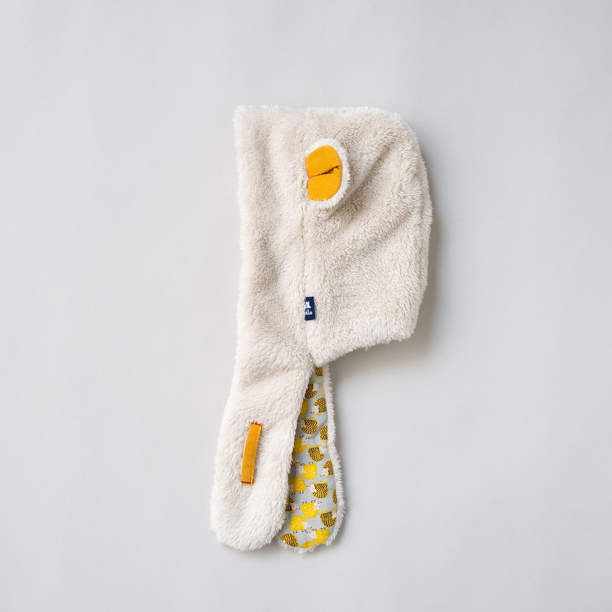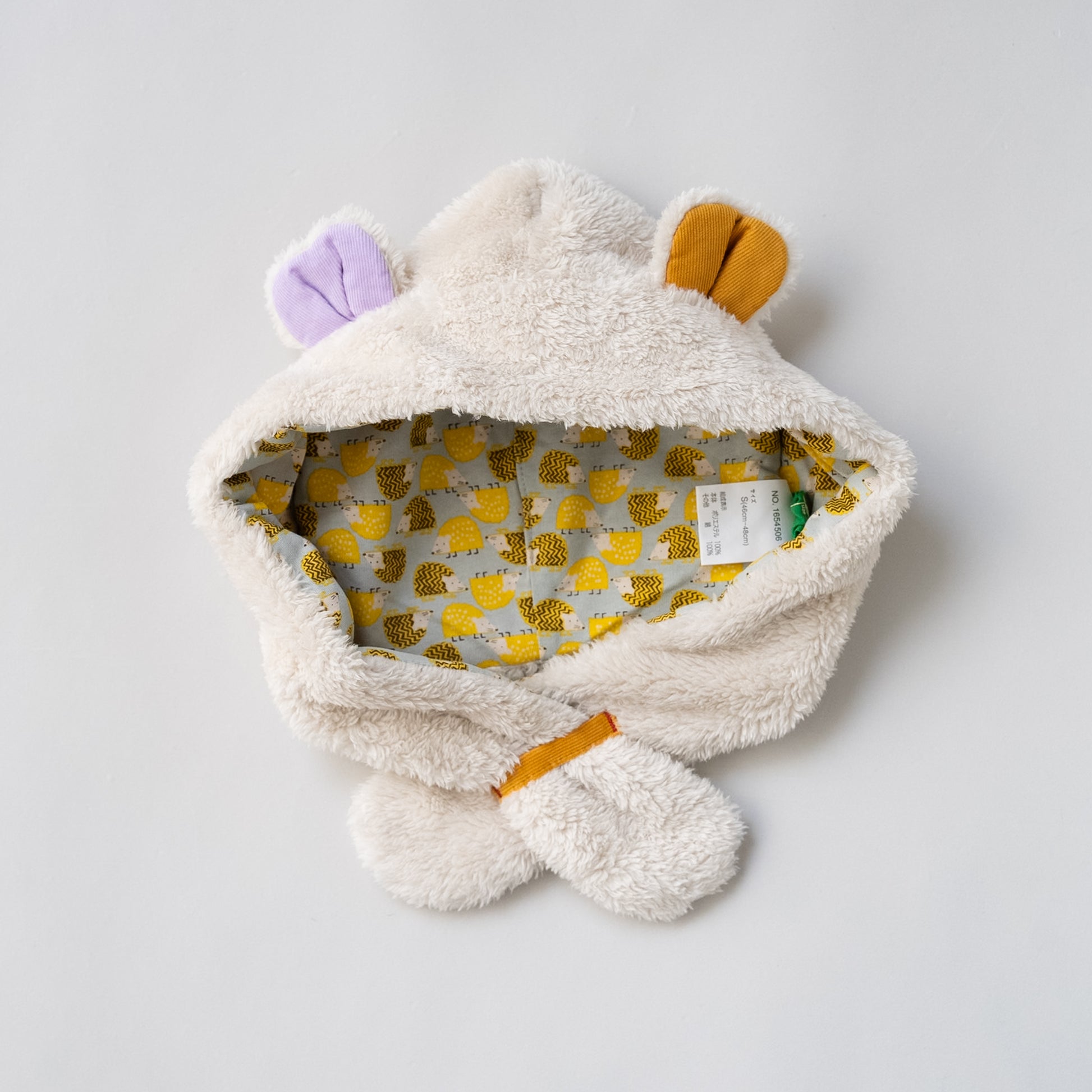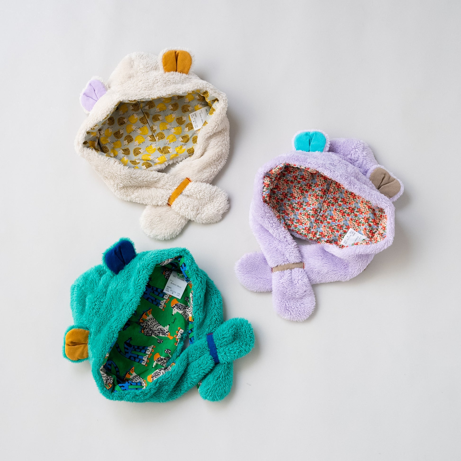 ふんわり暖かなファー素材の耳付き帽子。コレ1枚で帽子、耳あて、マフラーとして大活躍するデザインです。プレゼントにもオススメ。