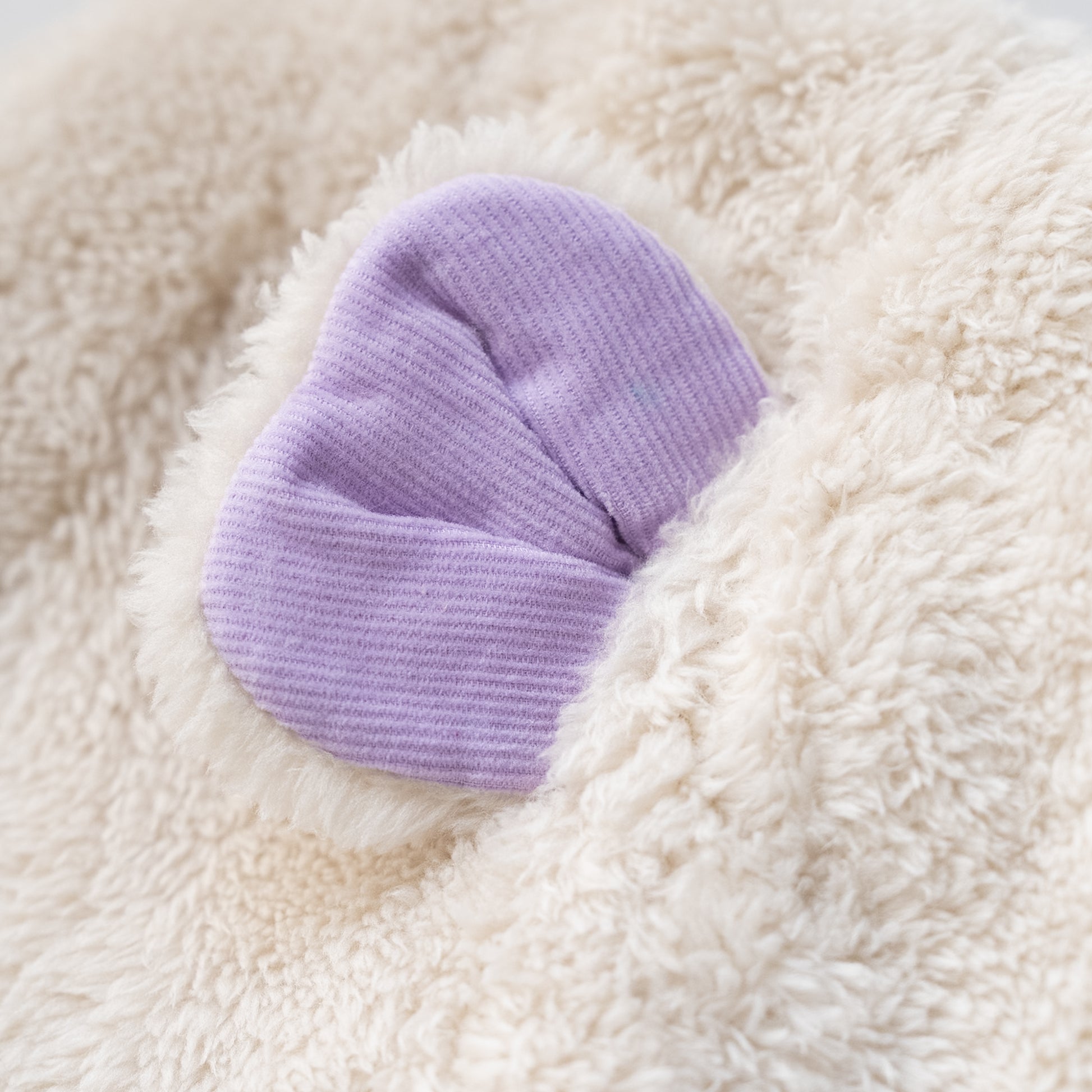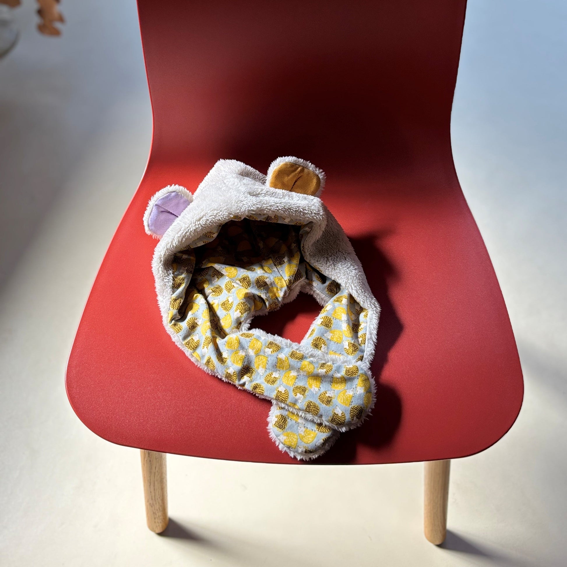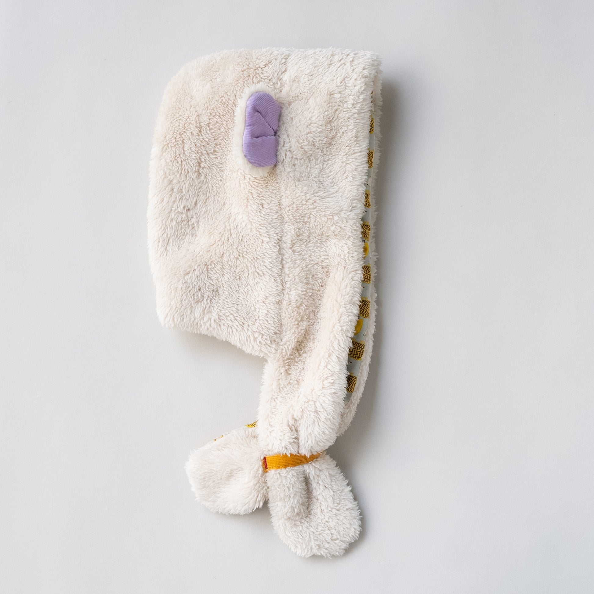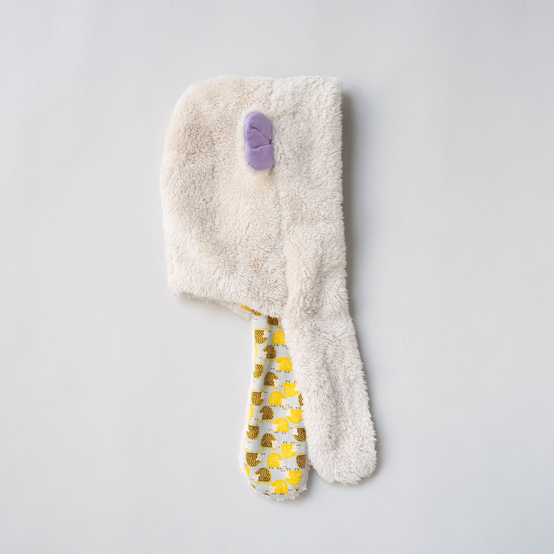 ふんわり暖かなファー素材の耳付き帽子。コレ1枚で帽子、耳あて、マフラーとして大活躍するデザインです。プレゼントにもオススメ。