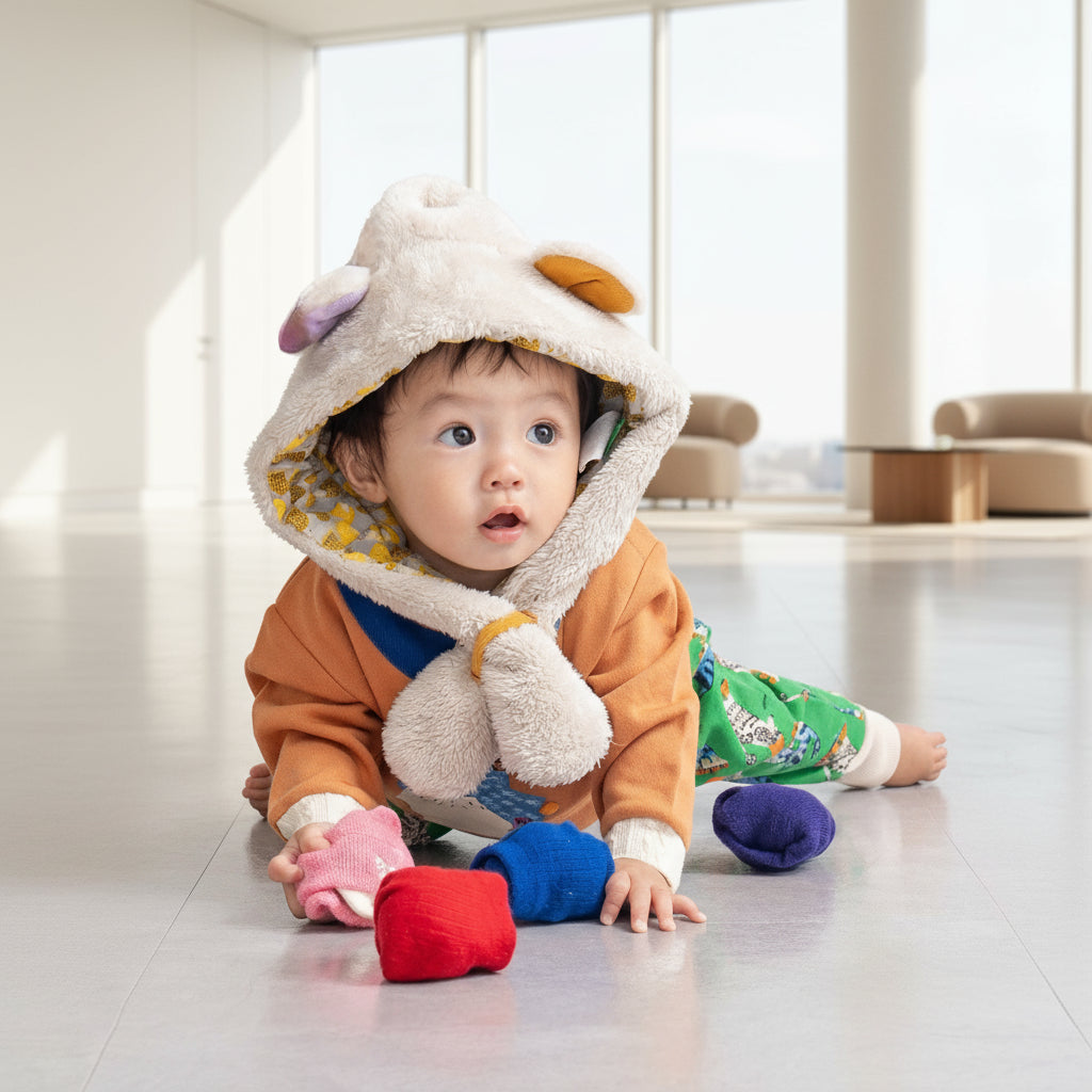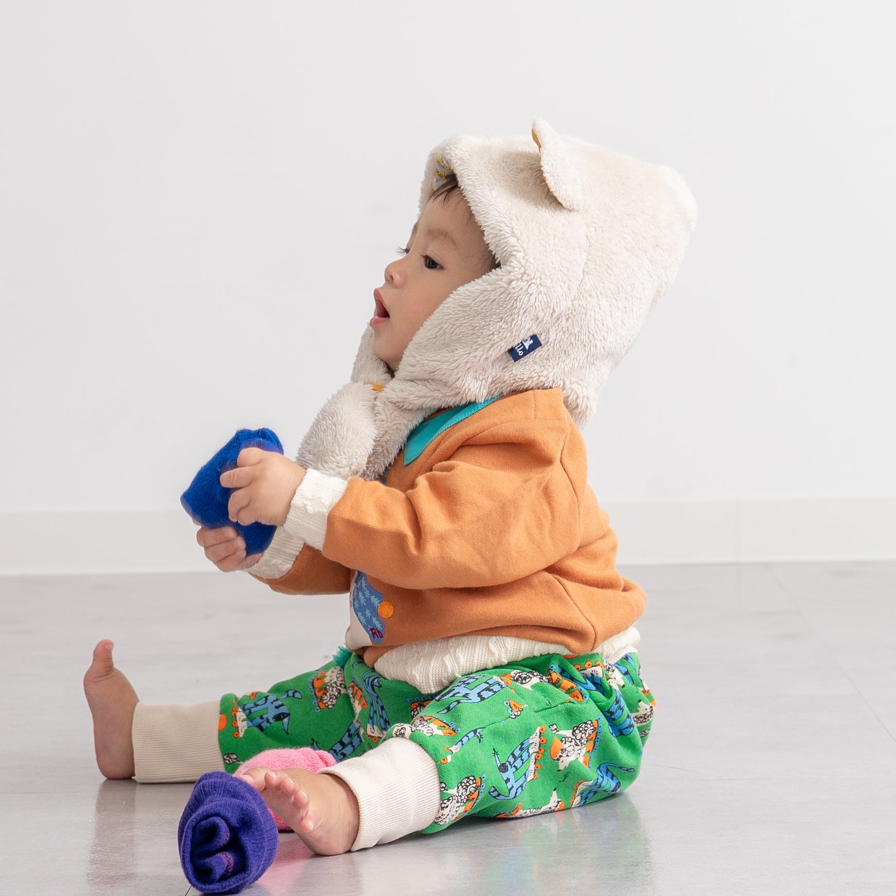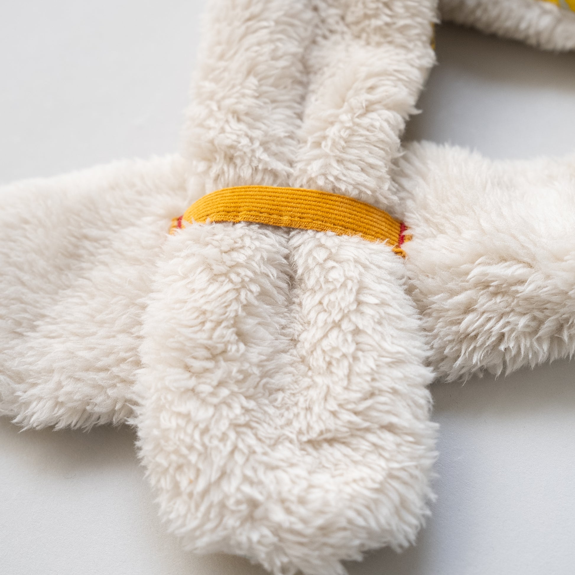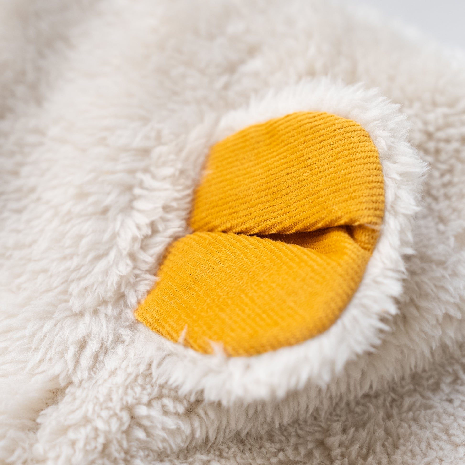 ふんわり暖かなファー素材の耳付き帽子。コレ1枚で帽子、耳あて、マフラーとして大活躍するデザインです。プレゼントにもオススメ。